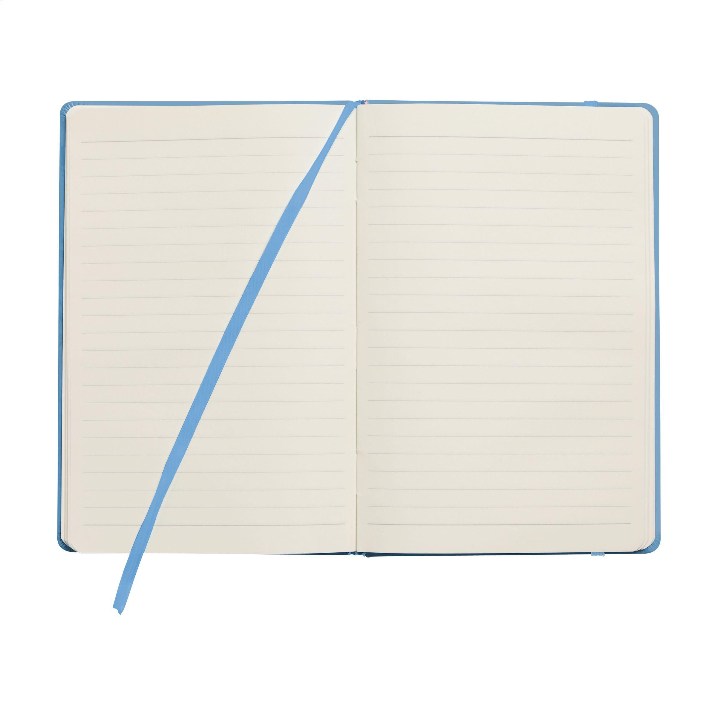 Notizbuch im A5-Format mit ca. 96 Blatt/192 Seiten crèmefarbenem, liniertem FSC Mix zertifiziertes Papier (80 g/m²). Mit gebundenem Rücken und hartem Umschlag, Verschlussgummi und seidener Leselitze.