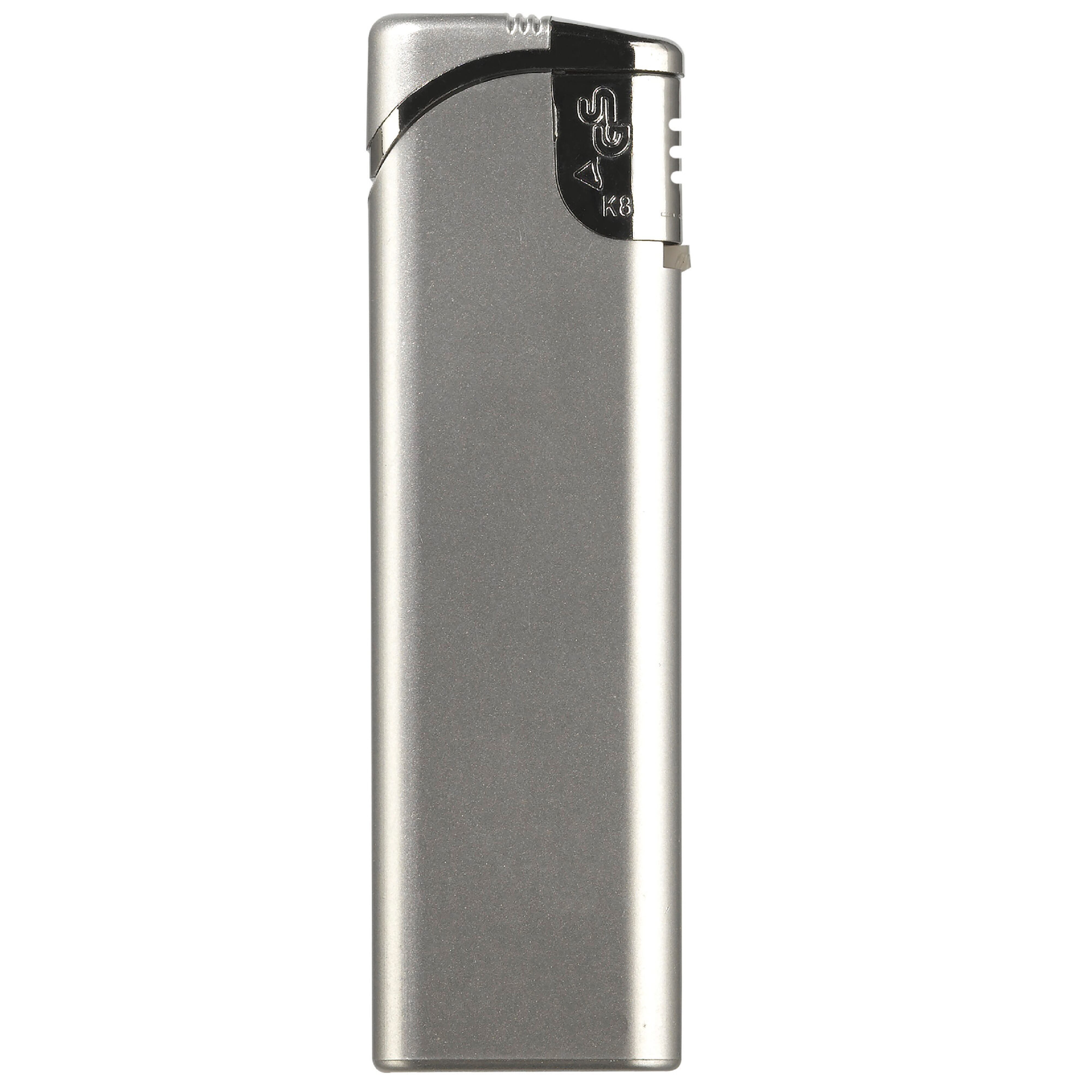Flaches, elektronisches und nachfüllbares Feuerzeug in matt silber. Mit Kindersicherung.