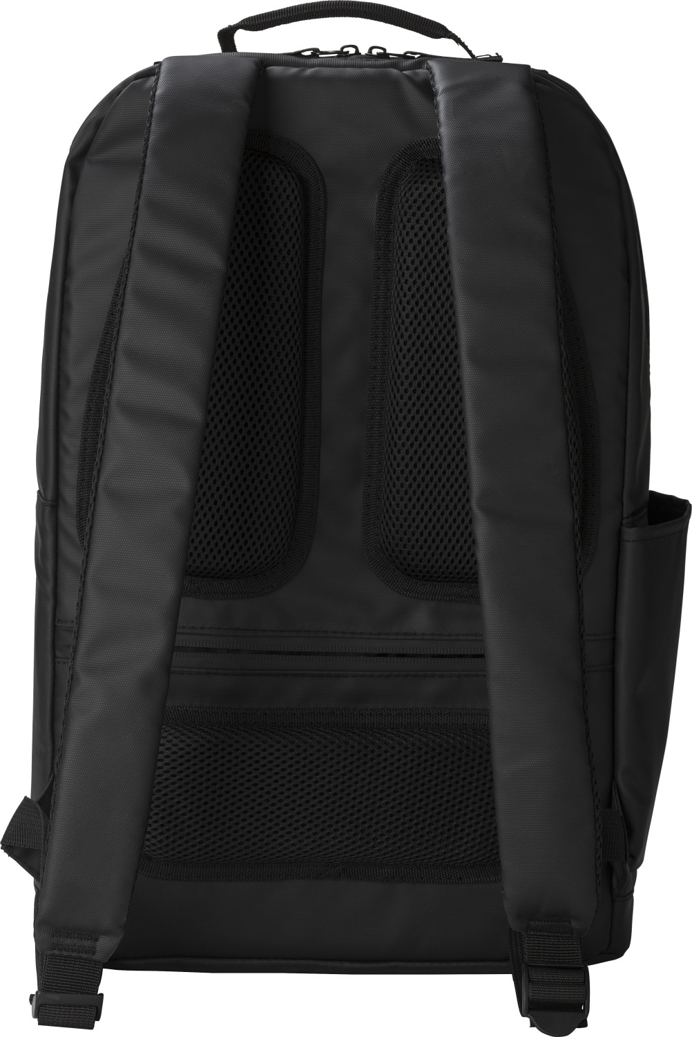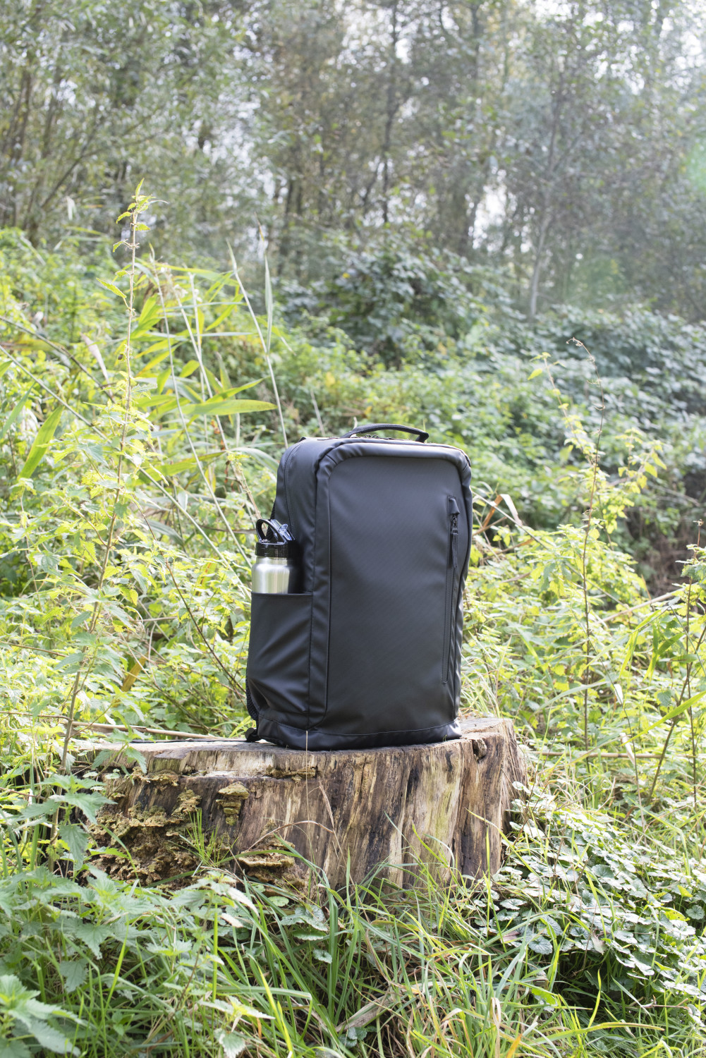Seesack aus Polyester (600D). 210D Polyester am Reißverschluss, beschichtet mit 600D Polyester. Wasserabweisend, inklusive Reißverschluss. Mit Anti-Diebstahl-Tasche, Wasserflaschenfach, Laptop-Fach mit Klettverschluss, und andere kleine Taschen.