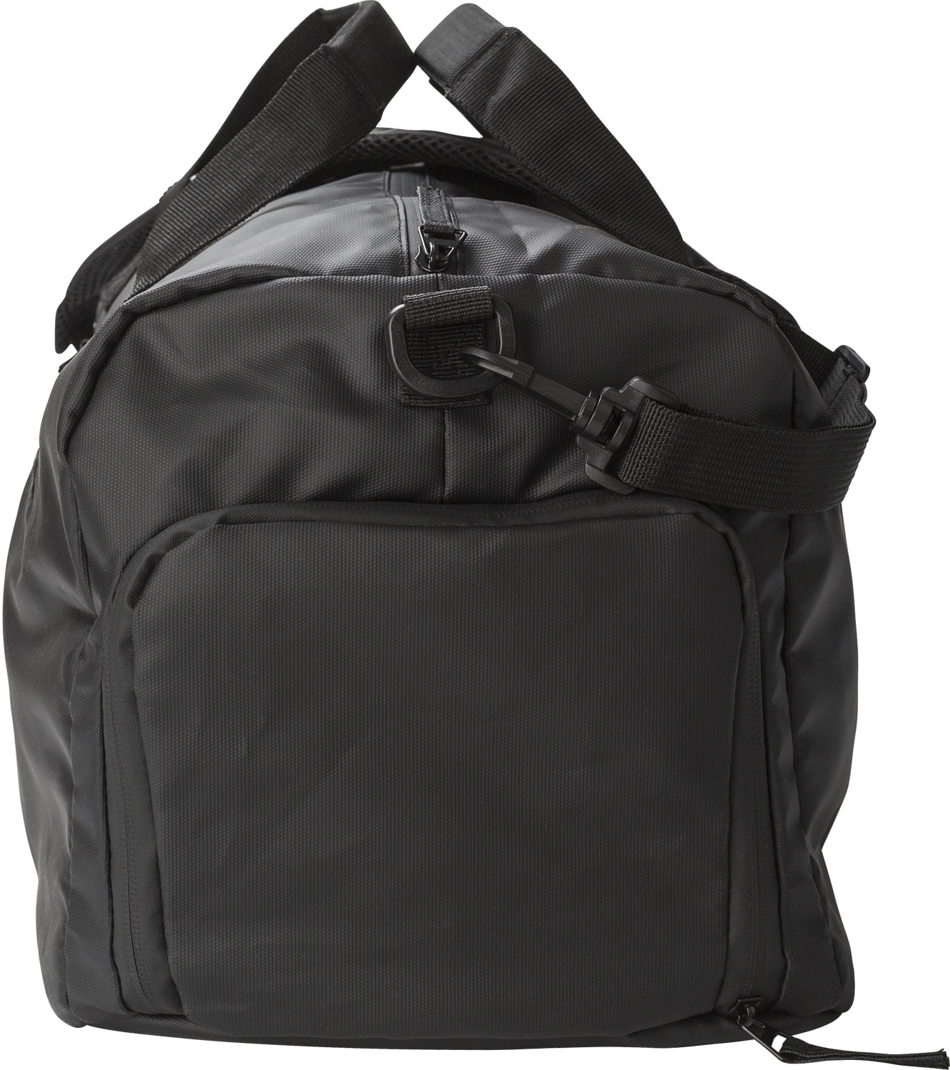 Seesack aus Polyester (600D). 210D Polyester am Reißverschluss, beschichtet mit 600D Polyester. Wasserabweisend, inklusive Reißverschluss. Verstellbare Riemen, kurze Griffe, Schuhfach und eine Reißverschlusstasche an beiden Seiten. Verstärkter Boden.