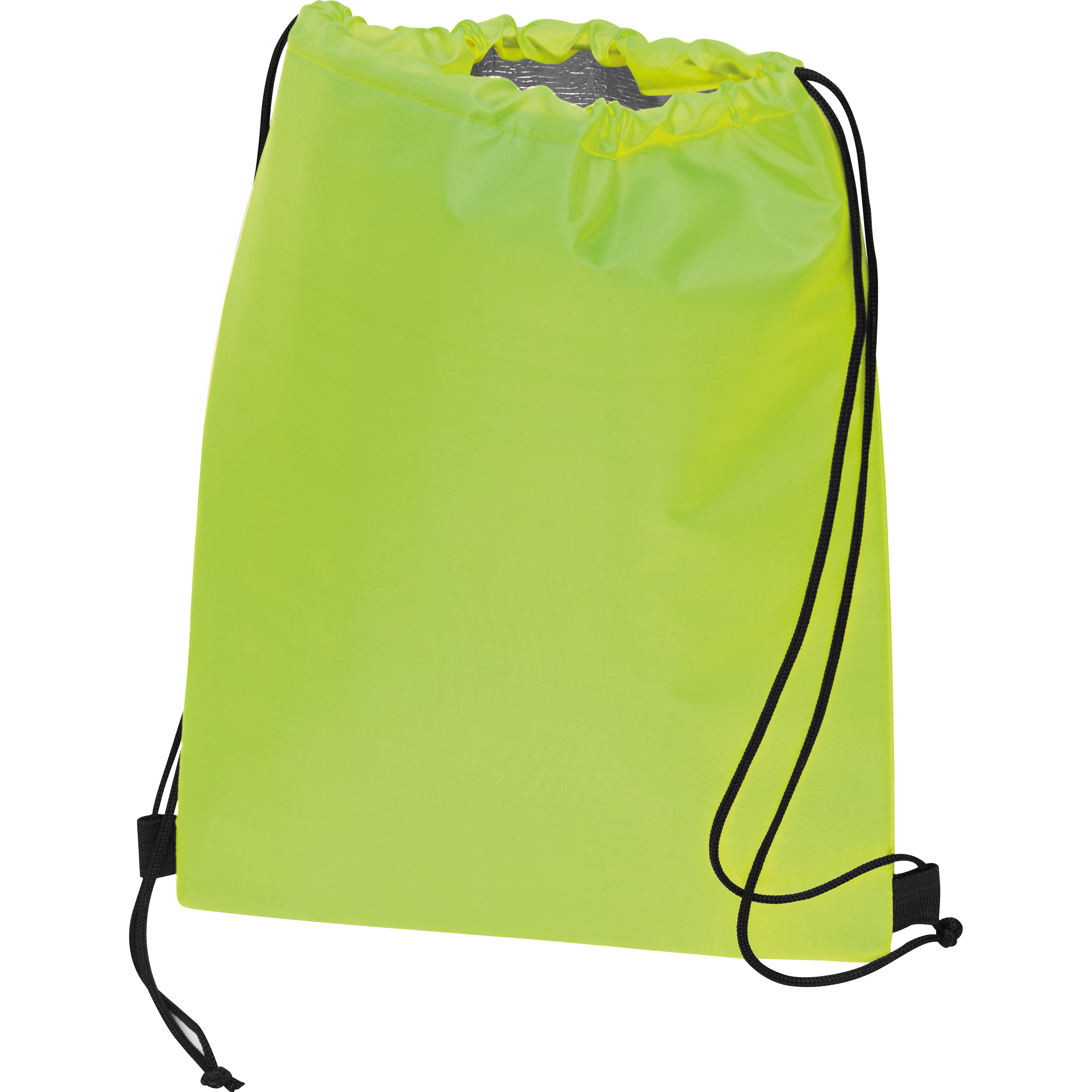 Kühltaschen-Gymbag aus 210D Polyester mit isolierendem Innenfutter und Kordelzug, der auch als Trageriemen dient. Der Werbeaufdruck erfolgt auf einer Seite.