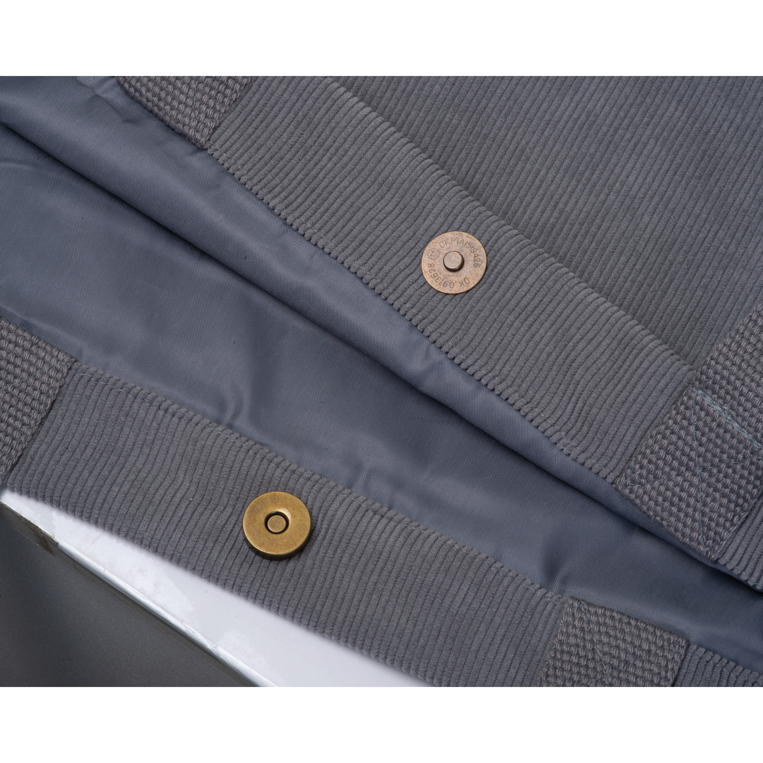 Stabiler Shopper aus robustem Polyester und Kord (Grammatur 250gsm) mit Vorfach, verschließbarem Druckknopf und langen, komfortablen Tragehenkeln. Ihre Werbung drucken wir auf das Vorfach.