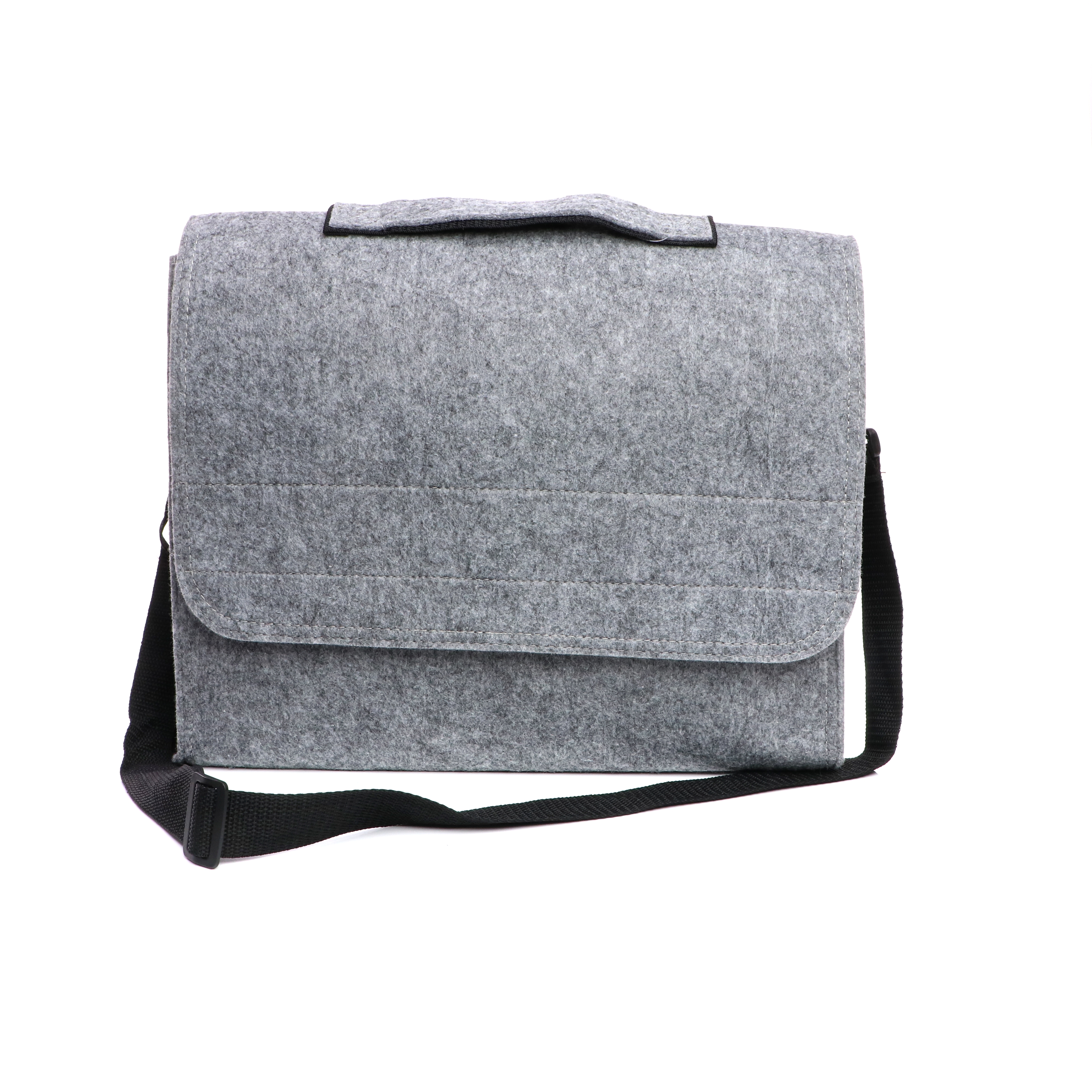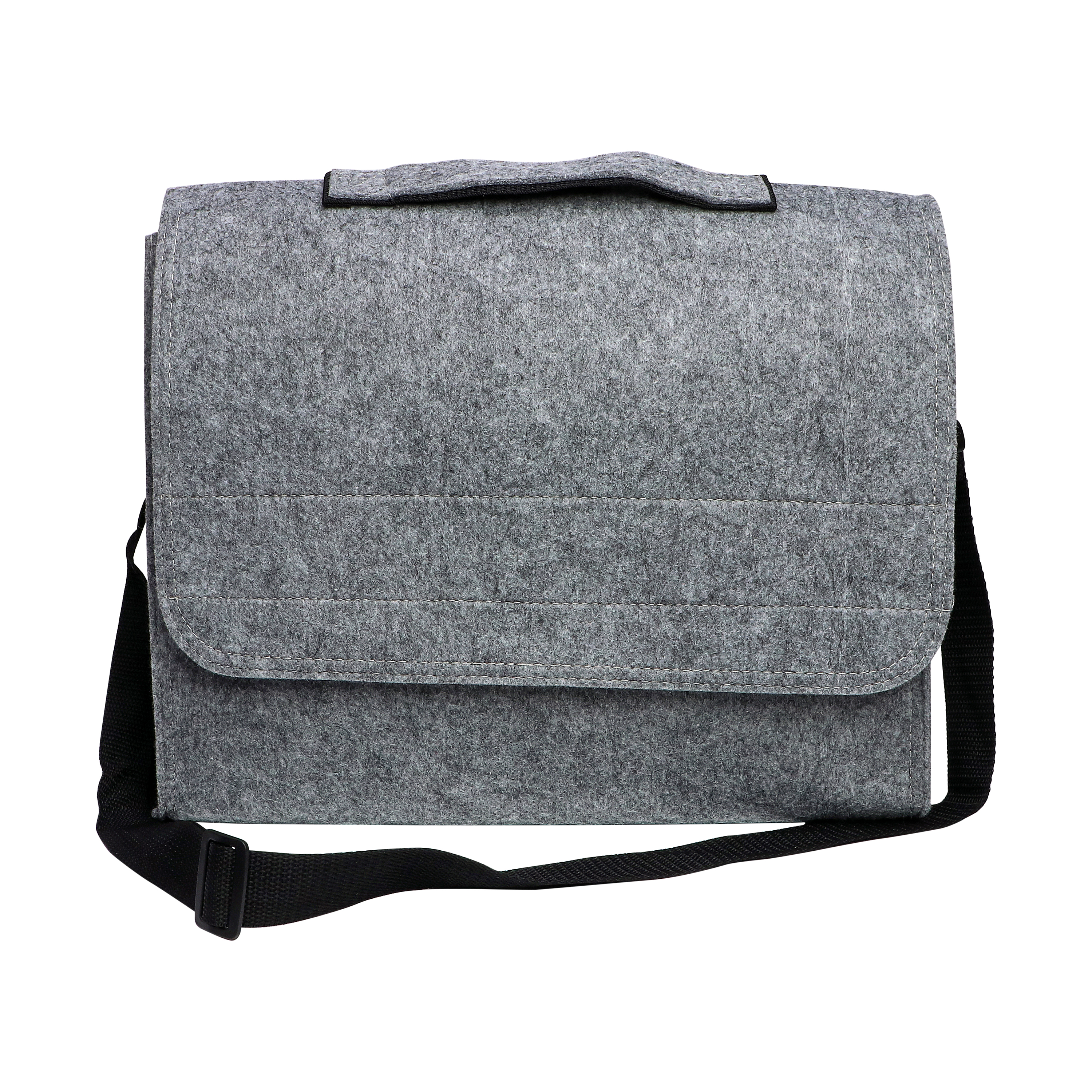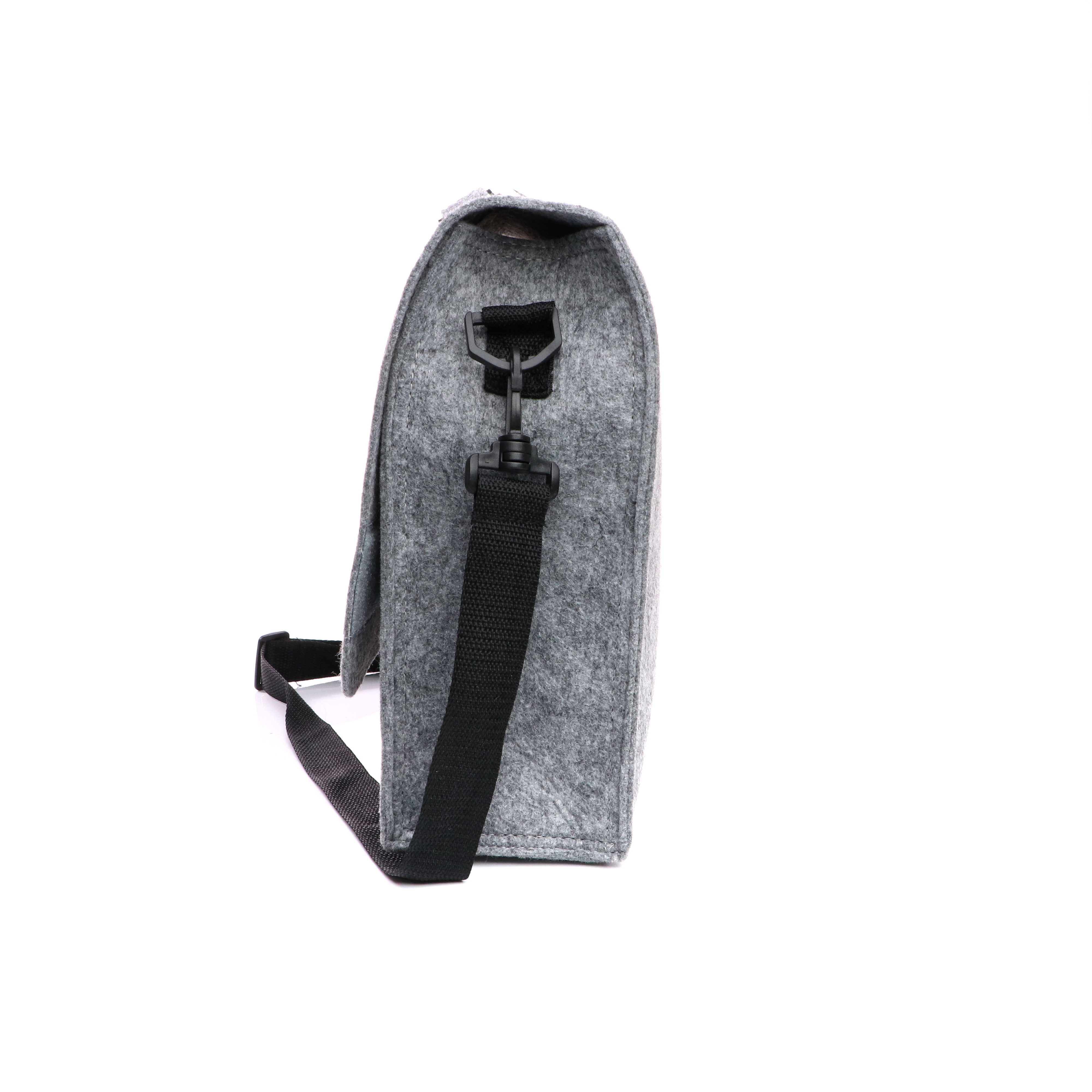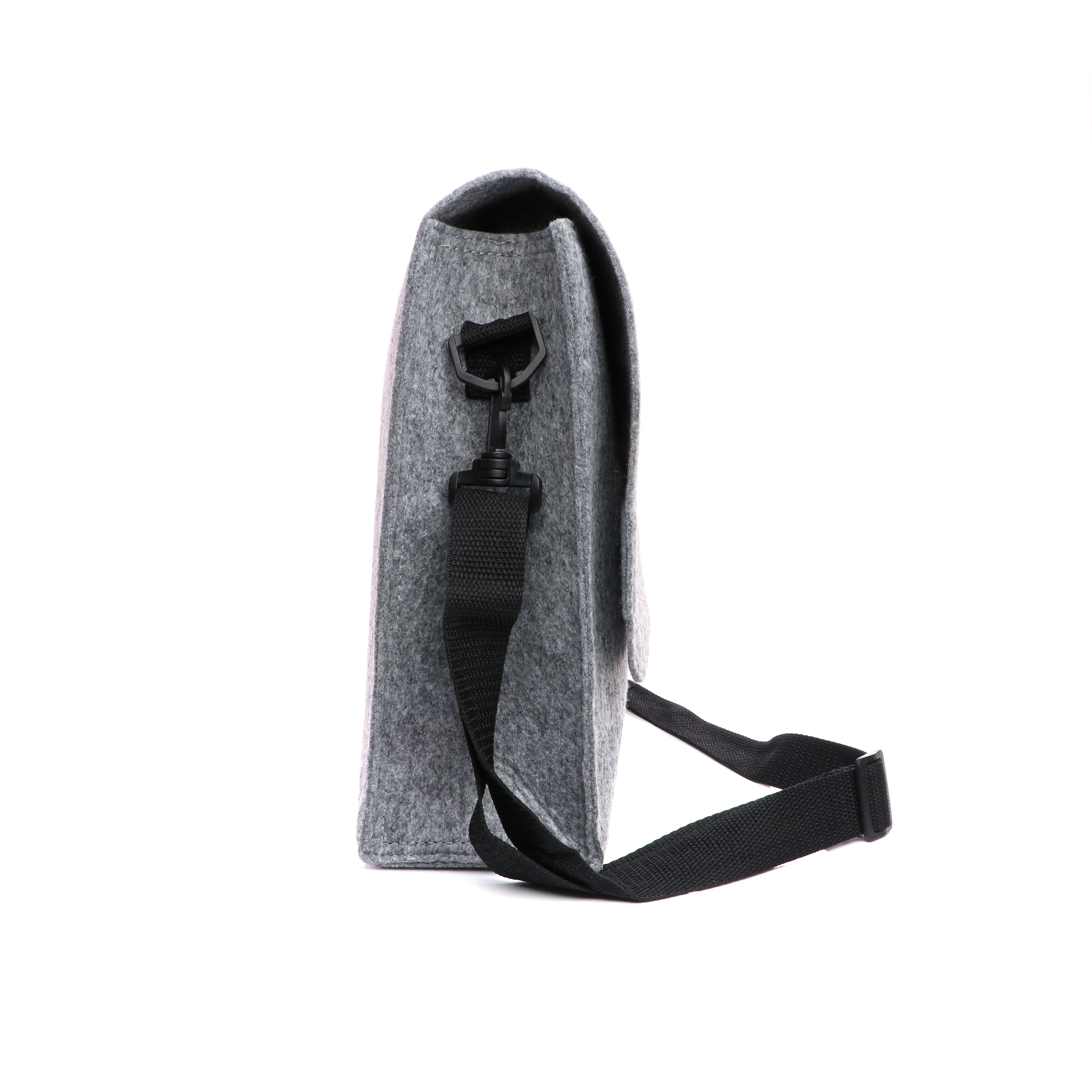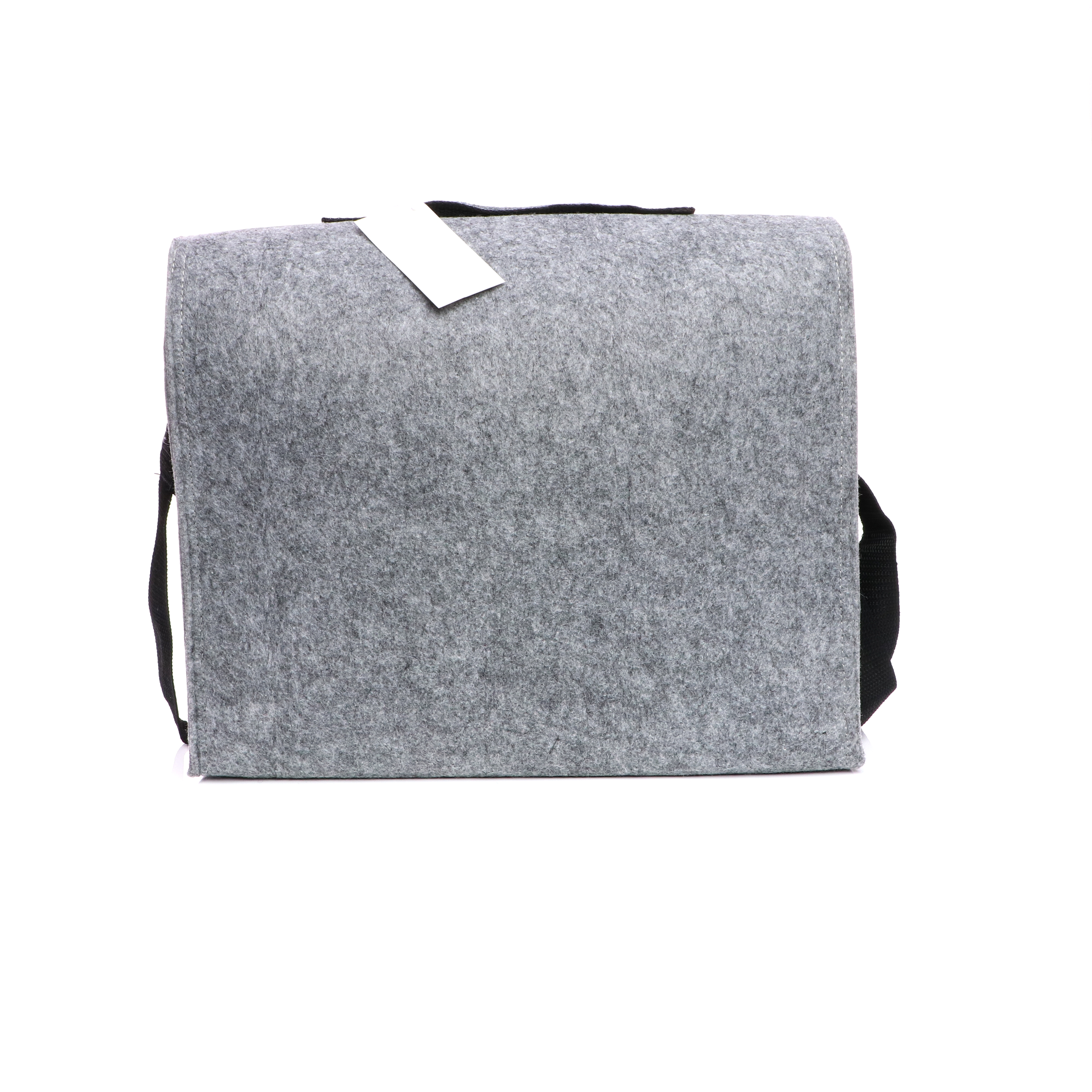 Eine Tasche mit viel Platz- super stabil und edel in grau. Der schwarze Gurt rundet die Tasche ab – längenverstellbar kann die Tasche für jeden Träger passend gemacht werden. Auf der Verschlussklappe der Tasche ist noch ein weiterer Griff aus grauem Filz, damit die Tage auch mal schnell so angehoben werden kann. In jedem Fall bietet diese Tasche ein super Tragegefühl und dazu natürlich noch Platz für viele Dinge und für Ihre Werbung!