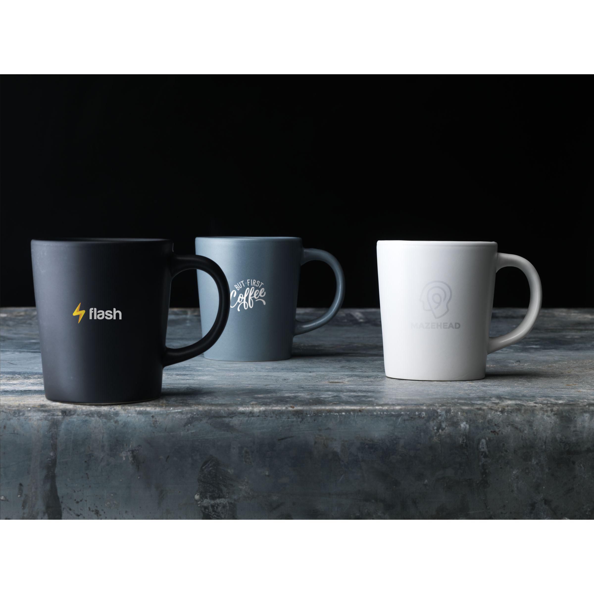 Auffälliger Becher in ansprechendem Design. Aus hochwertiger Keramik gefertigt und mit einer matten Deckschicht versehen. Fassungsvermögen 250 ml. NOTIZ: Der weiße Becher kann nicht mit einer Lasergravur versehen werden, da diese nicht ausreichend sichtbar ist. Der Druck ist spülmaschinengeprüft und zertifiziert: EN 12875-2.