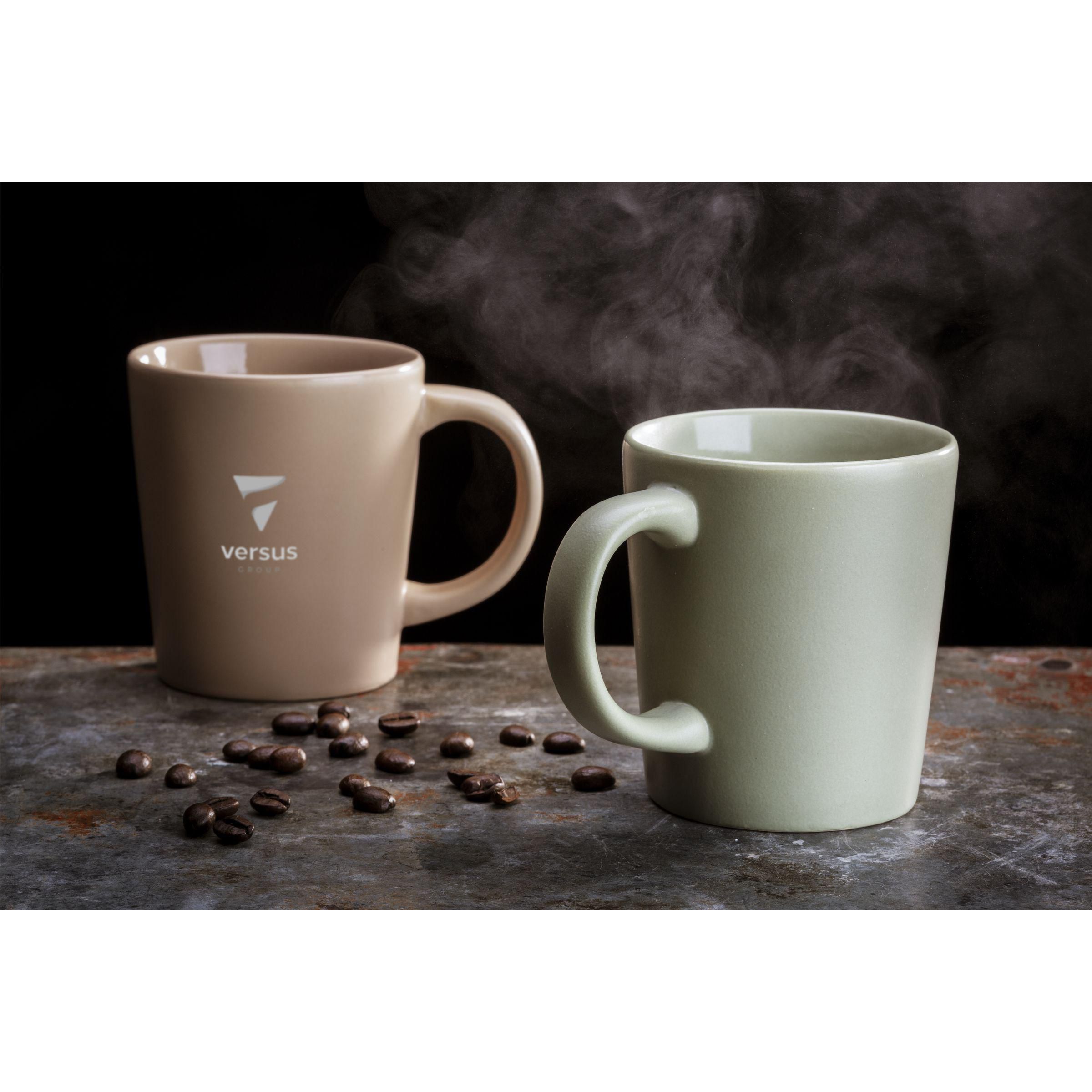 Auffälliger Becher in ansprechendem Design. Aus hochwertiger Keramik gefertigt und mit einer matten Deckschicht versehen. Fassungsvermögen 250 ml. NOTIZ: Der weiße Becher kann nicht mit einer Lasergravur versehen werden, da diese nicht ausreichend sichtbar ist. Der Druck ist spülmaschinengeprüft und zertifiziert: EN 12875-2.
