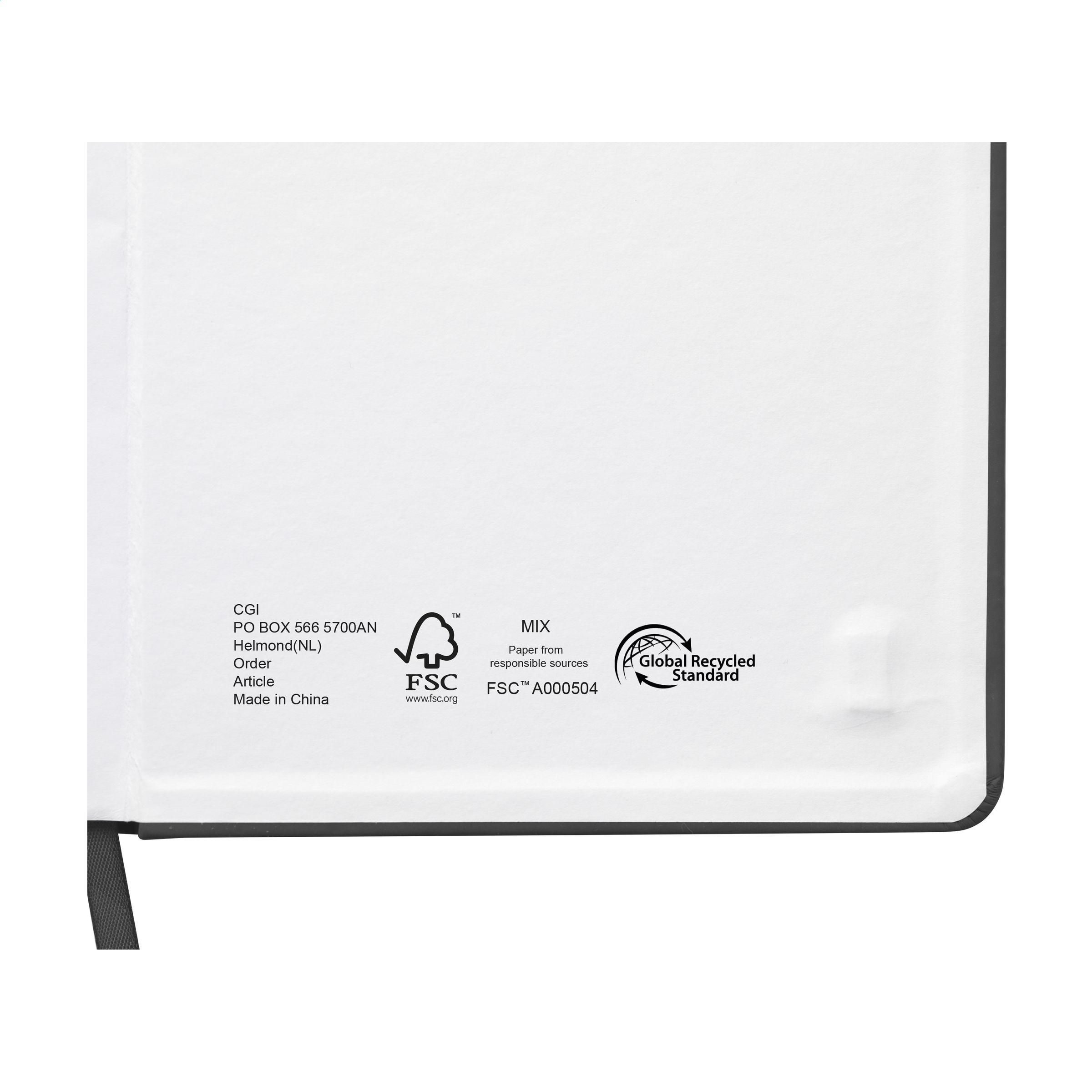 Praktisches Notizbuch im A5-Format. Mit hartem RPET-Cover und ca. 80 Blatt/160 Seiten cremefarbenem, liniertem Papier (70 g/m²). Mit praktischem Verschlussgummiband, Lesezeichen und Stiftschlaufe.