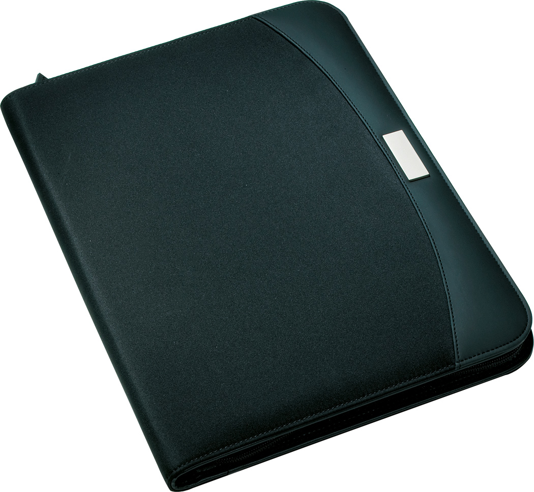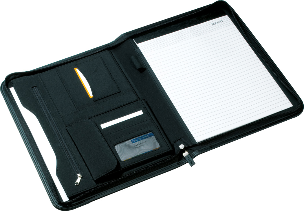 Portfolio CREADO im DIN-A4-Format: mit Schreibblock, Reißverschlussfach, diversen Einsteckfächern und umlaufendem Reißverschluss, Klettverschluss-Fach mit Organizer für 8 CDs / DVDs, Aluminiumplättchen für Ihre Werbeanbringung