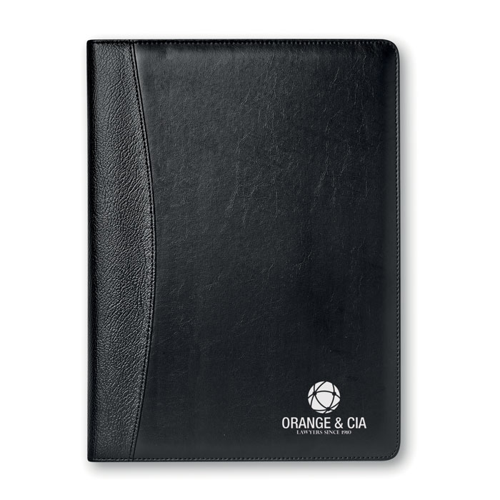 DIN A4 Konferenzmappe aus Kunstleder. Block mit 20 Blatt (40 Seiten) liniertem Papier und Solartaschenrechner. Inkl. Druckkugelschreiber aus Metall. Blaue Tinte.