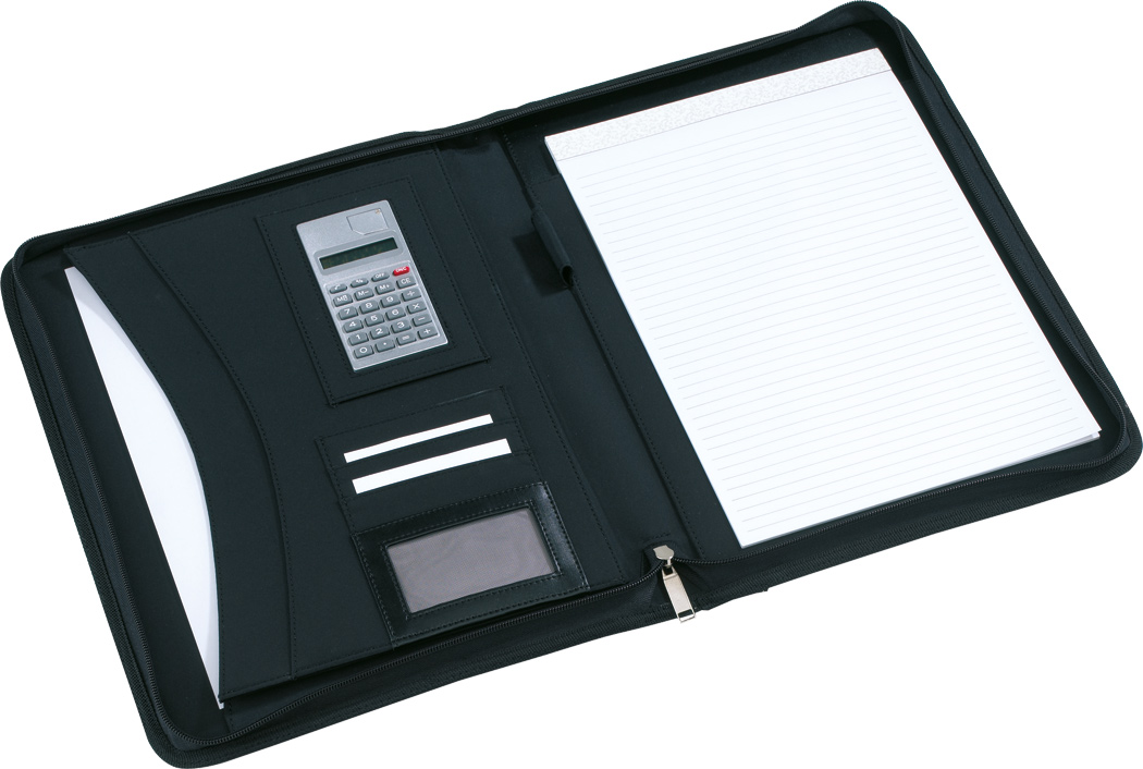 Portfolio NOBLESSE ZIP im DIN-A4-Format: umlaufender Reißverschluss zum Verschließen, innen diverse Einsteckfächer, 1 Netzfach, inkl. Schreibblock (liniert), Schlaufe für 1 Schreibgerät, Taschenrechner, außen dekorative Ziernähte, in Leder-Optik mit Metallplättchen für Ihre Werbeanbringung