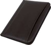 Business-Schreibmappe aus Lederfaser mit Metallplakette und neuer Tech-Innenaufteilung, Hauptfach mit Reißverschluss. Block mit 20 Blättern, VPE 15. 3 Kartenfächer, Tablet-Halterung, diverse Fächer, Stiftlasche