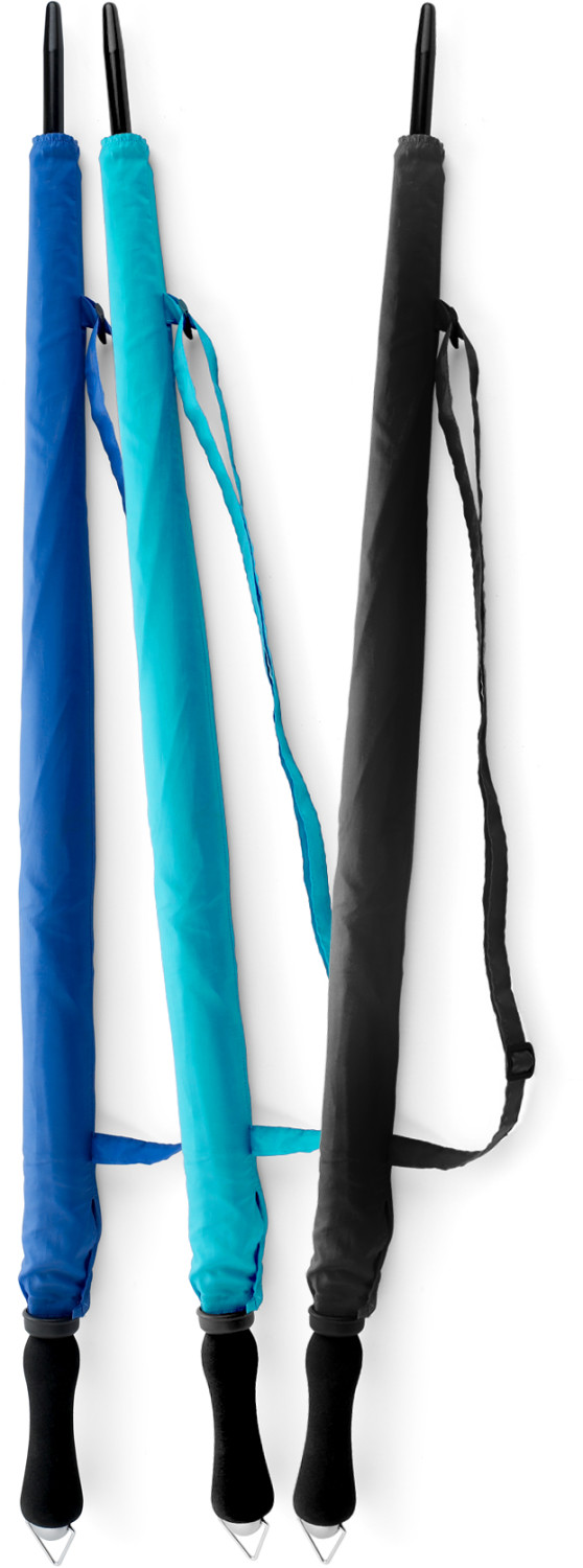 Portierschirm aus Polyester (210T), mit Handöffner, Schaft, Gestell und Spitze aus Metall, Kunststofftips, Klettverschluss, Griff aus EVA-Schaum und Hülle.