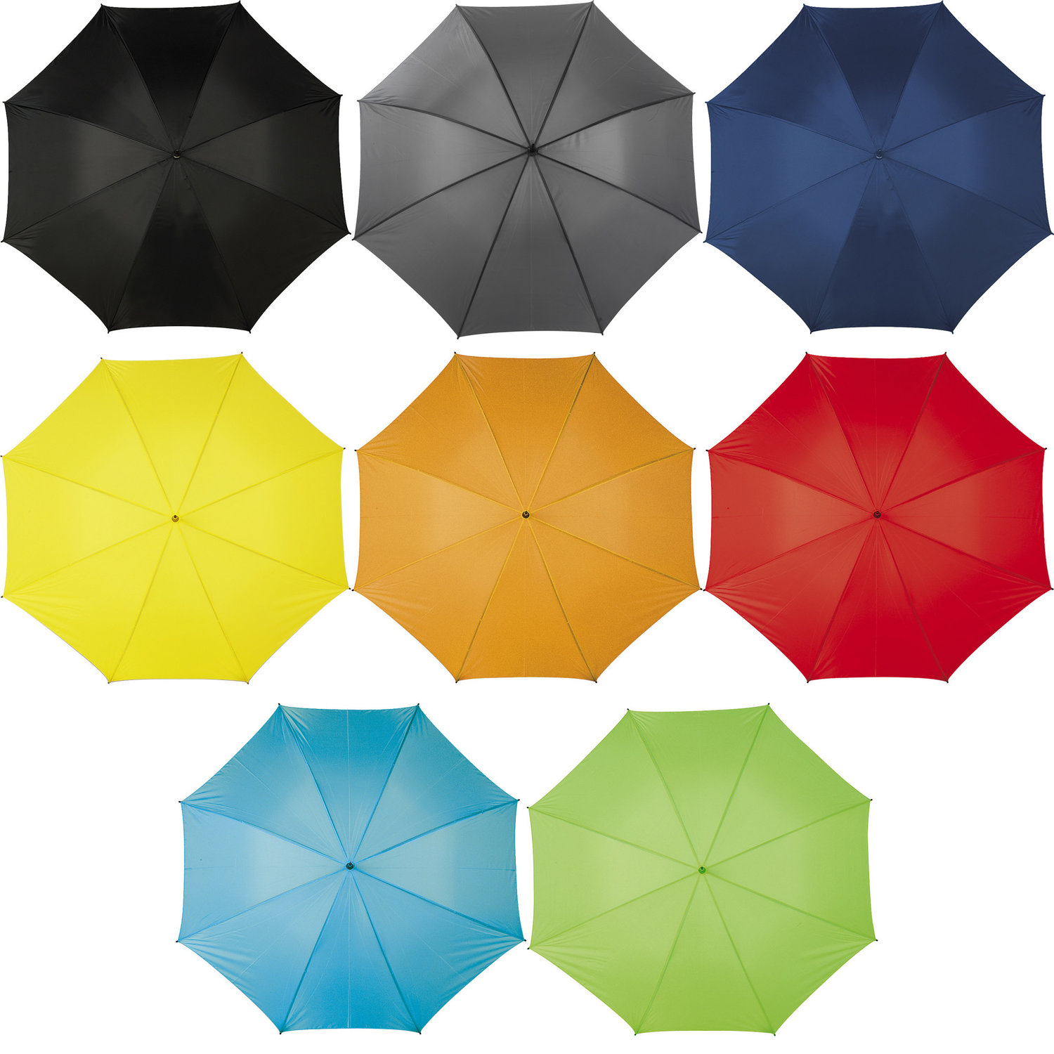 Portierschirm aus Polyester (210T), mit Handöffner, Schaft, Gestell und Spitze aus Metall, Kunststofftips, Klettverschluss, Griff aus EVA-Schaum und Hülle.
