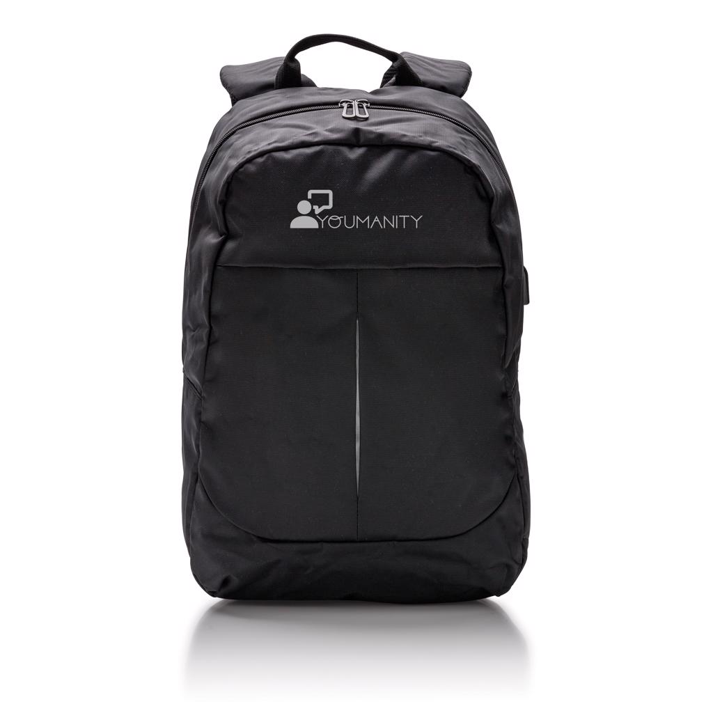 Bleiben Sie immer und überall verbunden mit diesem funktionalen 15’’ Zoll Laptop-Rucksack aus 600D Polyester mit USB-Anschluss. Schließen Sie einfach eine Powerbank an dem USB Input an und laden Sie Ihre Geräte am seitlichen USB Output auf!