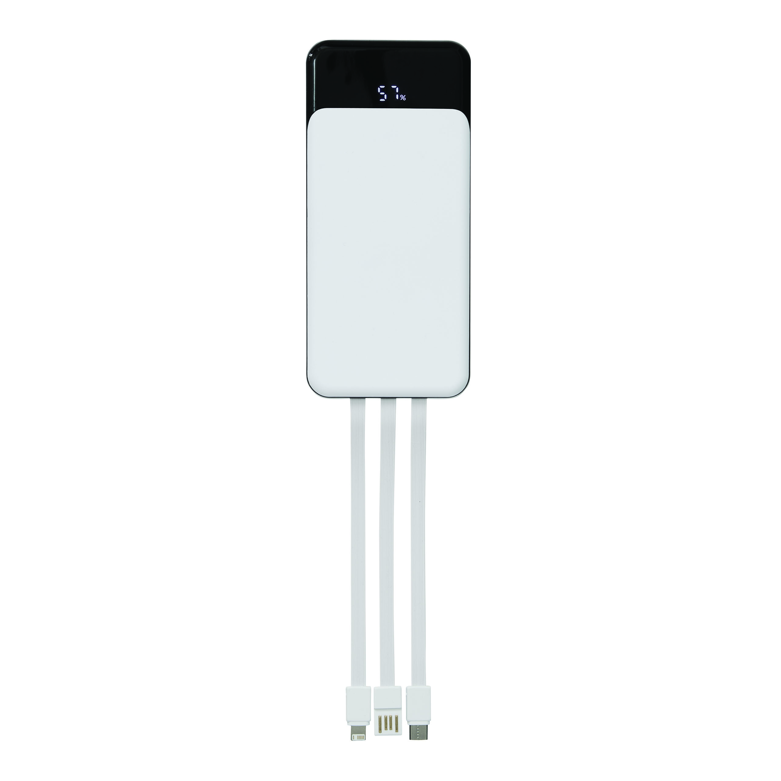 Powerbank POWERSTOCK: geeignet für Smartphones und USB-betriebene Geräte, inkl. 3 integrierter Ladekabel auf der Rückseite (USB Typ C, Lightning, USB Typ A), mit Ladestandanzeige in Prozent, Ein- und Ausschalter, 2 USB Typ C Ein- / Ausgänge und 1 USB Typ A Ausgang, Eingangsleistung: 5V/2A, Ausgangsleistung: 5V/2A (max.), Kapazität: 10.000 mAh, leistungsstarker Lithium-Akku, in Box