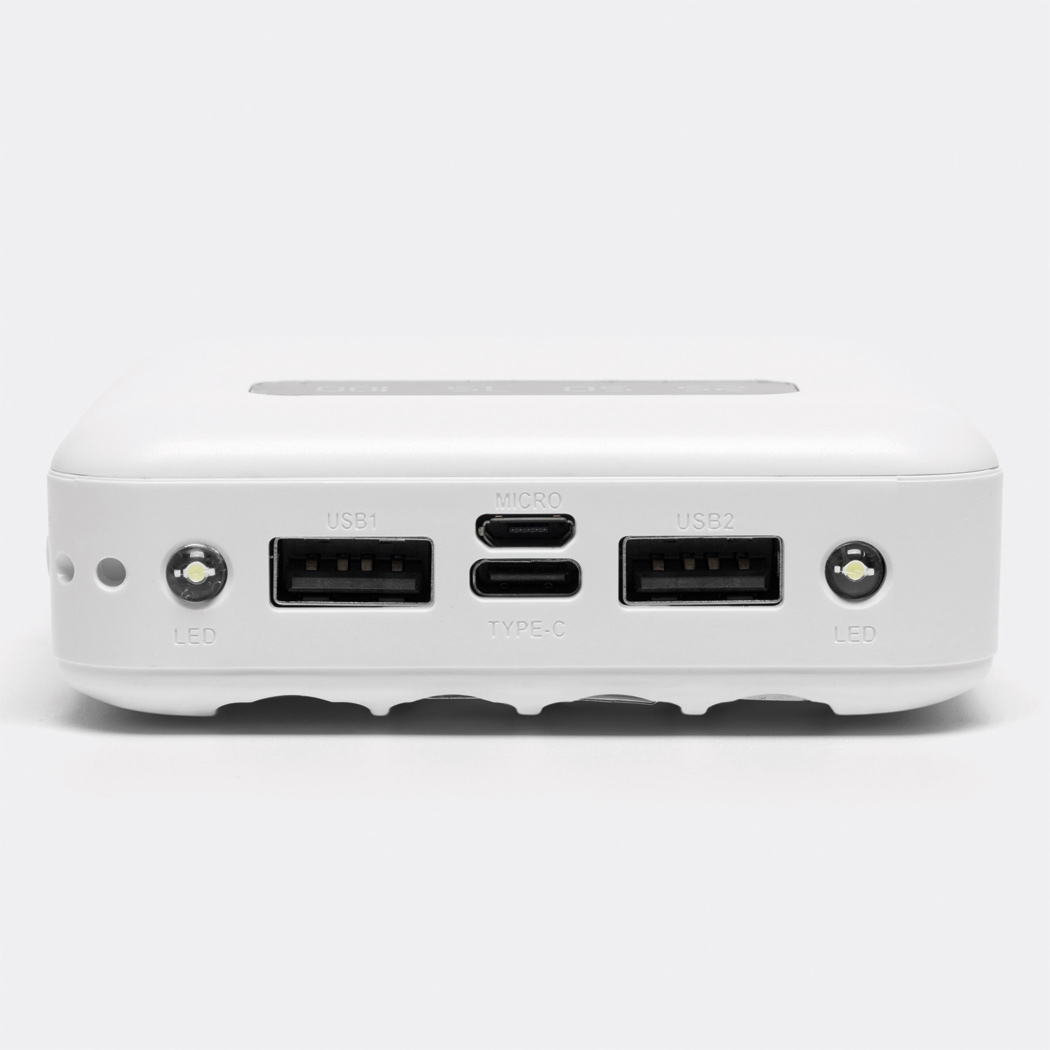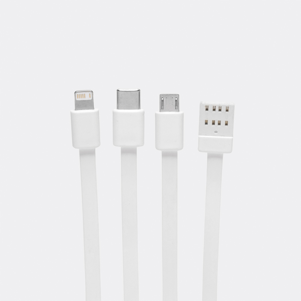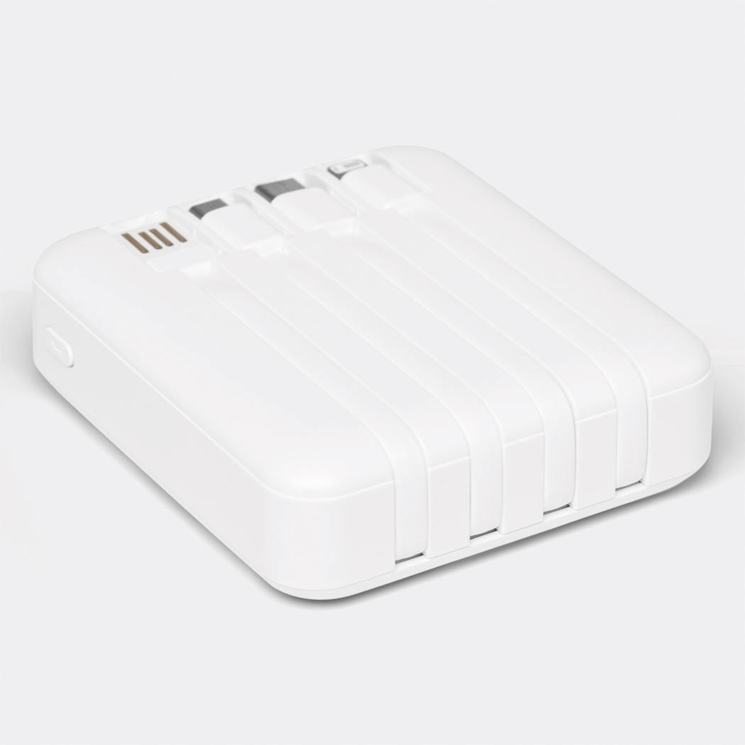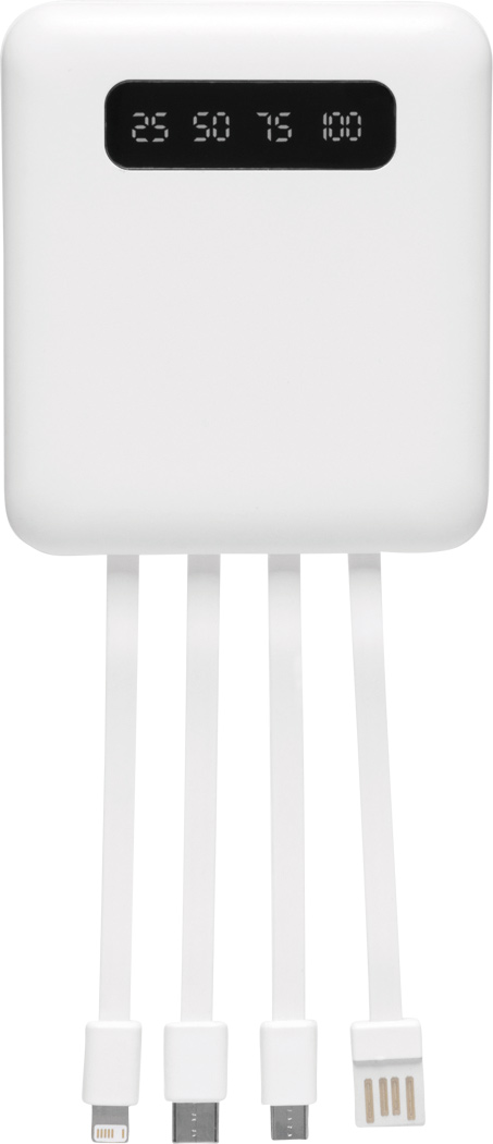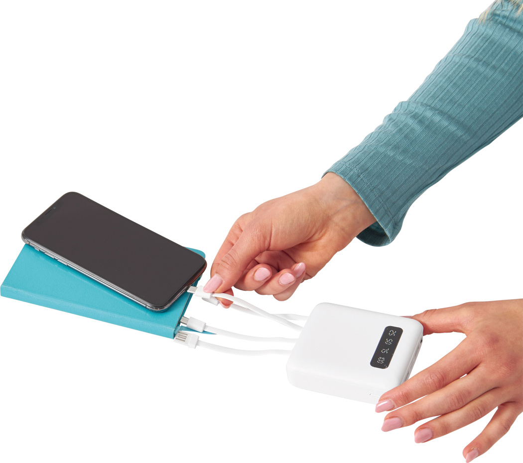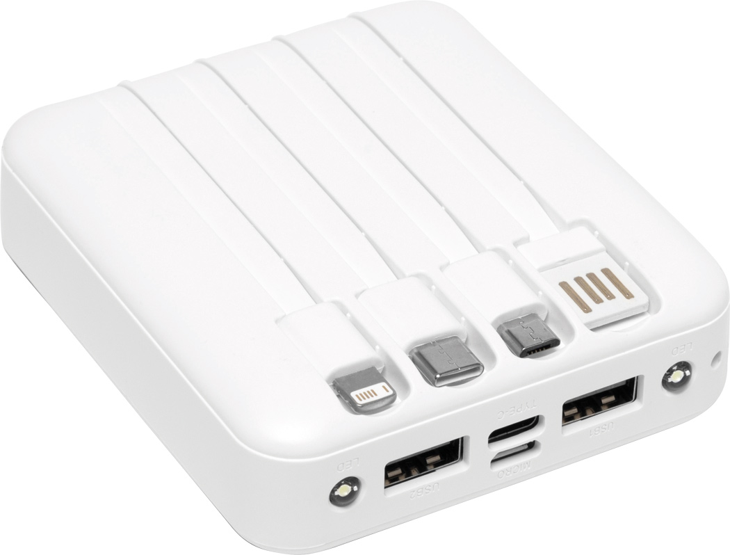 Powerbank PRECIOUS: geeignet für Smartphones und USB-betriebene Geräte, inkl. 4 integrierter Ladekabel auf der Rückseite (USB Typ C, Micro-USB, Lightning, USB Typ A), mit Ladestandanzeige (25 / 50 / 75 / 100 %), Ein- und Ausschalter, je 1 Typ C und Micro-USB Eingang und 2 USB Typ A Ausgänge, Eingangsleistung: 5V/2A, Ausgangsleistung: 5V/2A (max.), Kapazität: 5.000 mAh, leistungsstarker Lithium-Akku, Taschenlampe mit 2 weißen LED, in Box