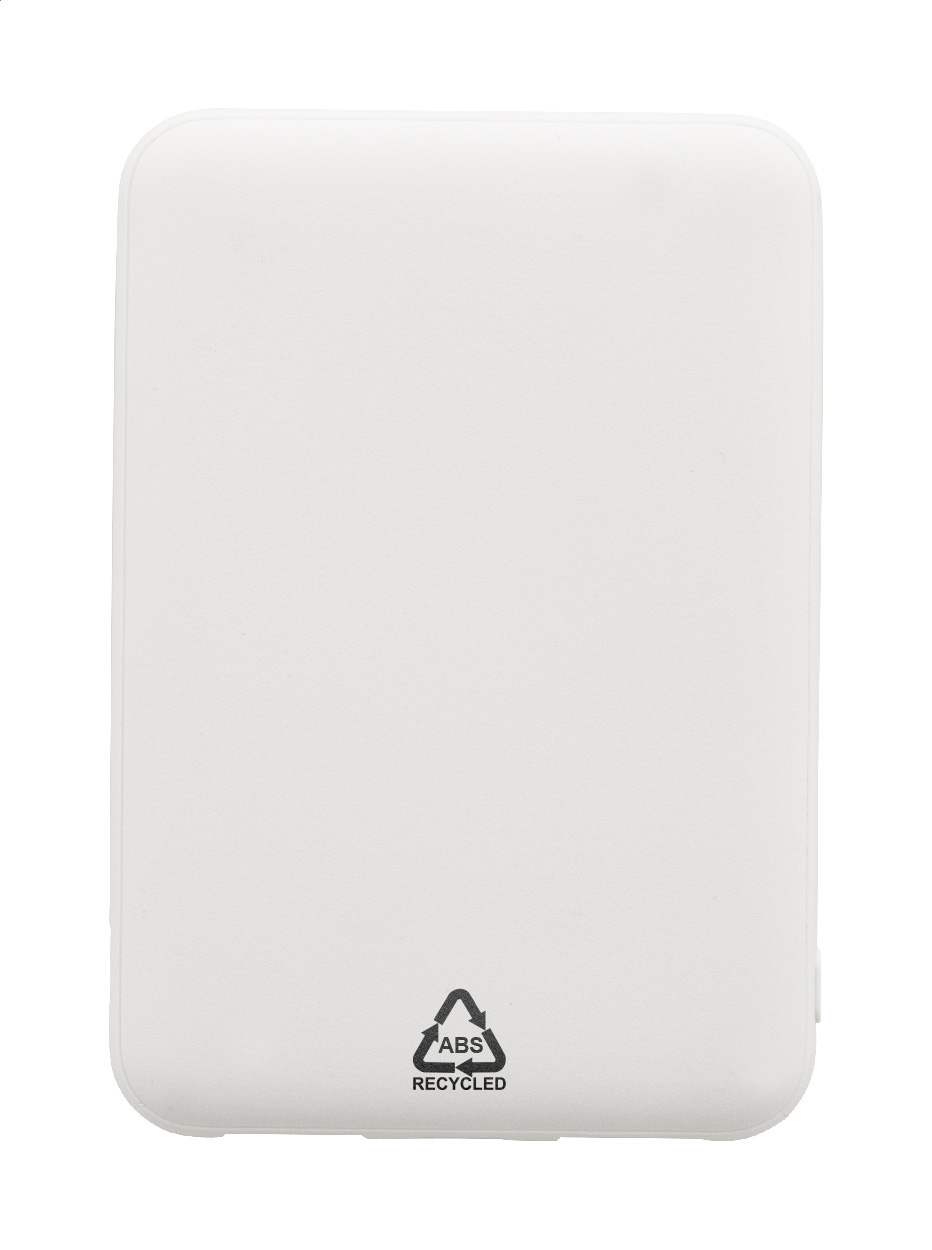 Powerbank aus recyceltem ABS mit 5000 mAh Akku. Mit zwei USB- und einem USB-C-Ladeanschluss. Micro-USB- und USB-C-Eingang. Inklusive USB-Ladekabel.