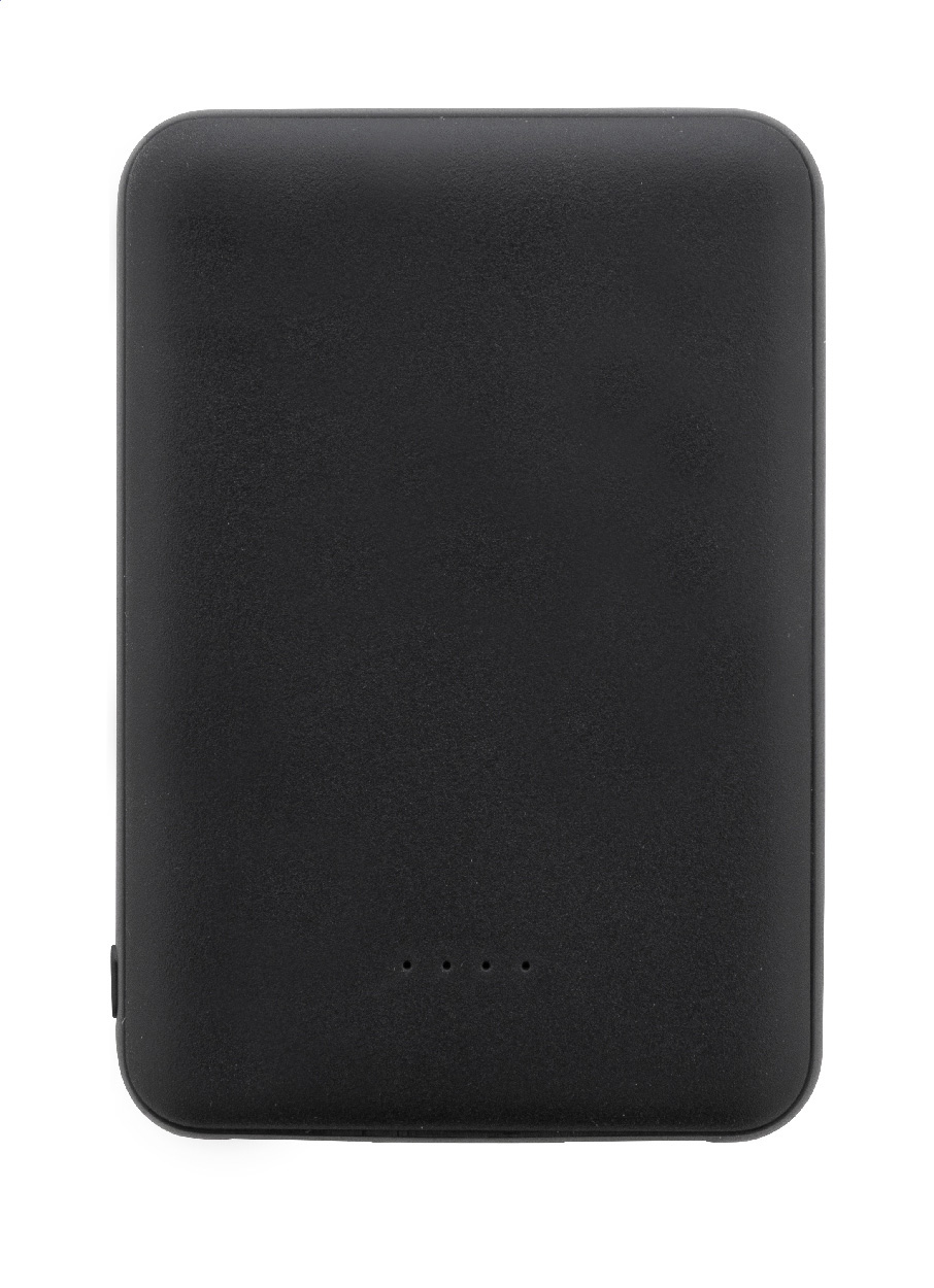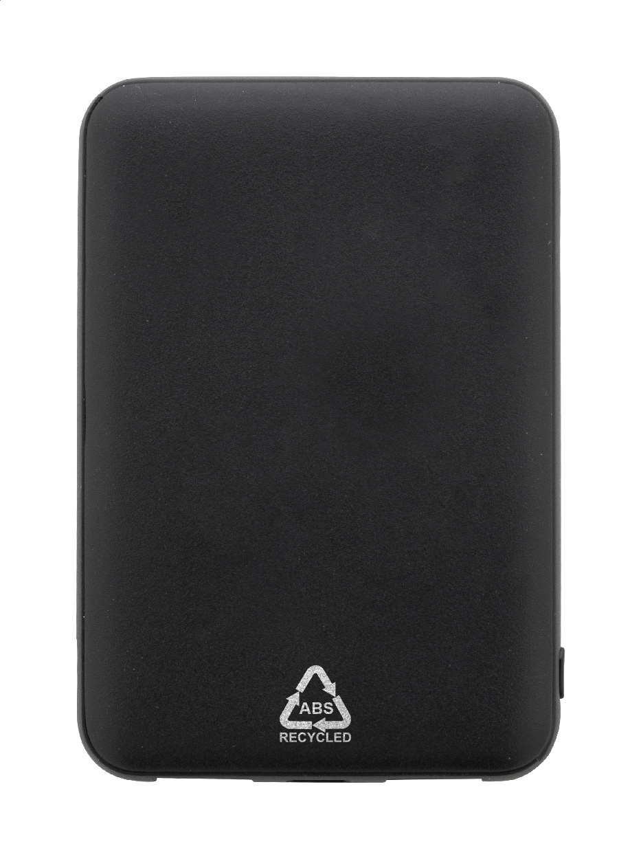 Powerbank aus recyceltem ABS mit 5000 mAh Akku. Mit zwei USB- und einem USB-C-Ladeanschluss. Micro-USB- und USB-C-Eingang. Inklusive USB-Ladekabel.