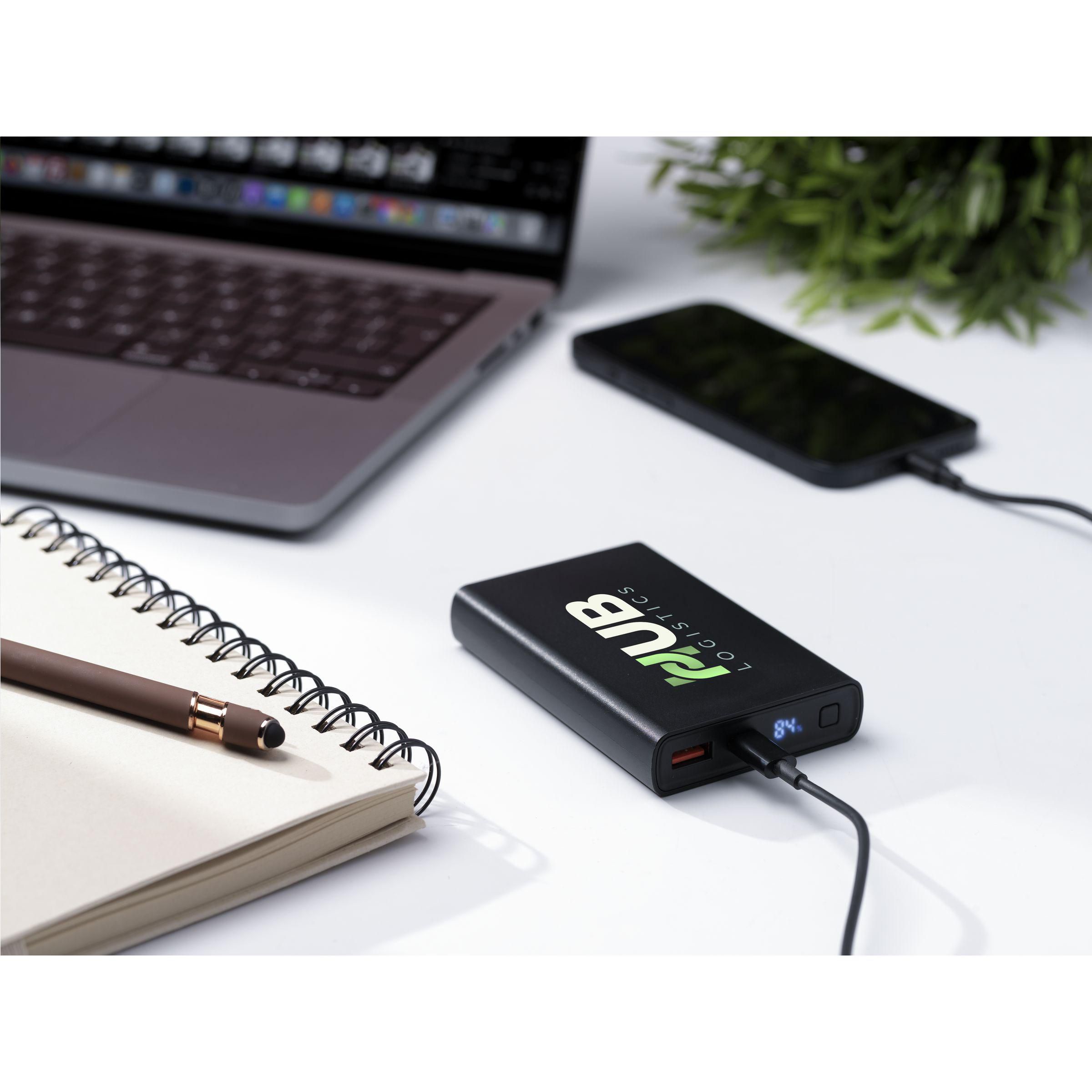 Leistungsstarke Powerbank mit integriertem 10.000-mAh-Lithium-Polymer-Akku. Das Gehäuse besteht zu 100% aus RCS-zertifiziertem recyceltem ABS. Mit Ein-/Aus-Taste und Display mit prozentualer Akkuanzeige. Typ-C-Eingang: DC5V/3A, 9V/2A, 12/1,5A. Typ-C-Ausgang: DC5V/3A, 9V/2,22A, 12/1,67A. USB-A-Ausgang: DC5V/3A, 9V/2A, 12/1,5A. Kabelgebundener Ausgang: 22W. Inklusive rTPE USB-C-zu-USB-C-Ladekabel und Gebrauchsanweisung.