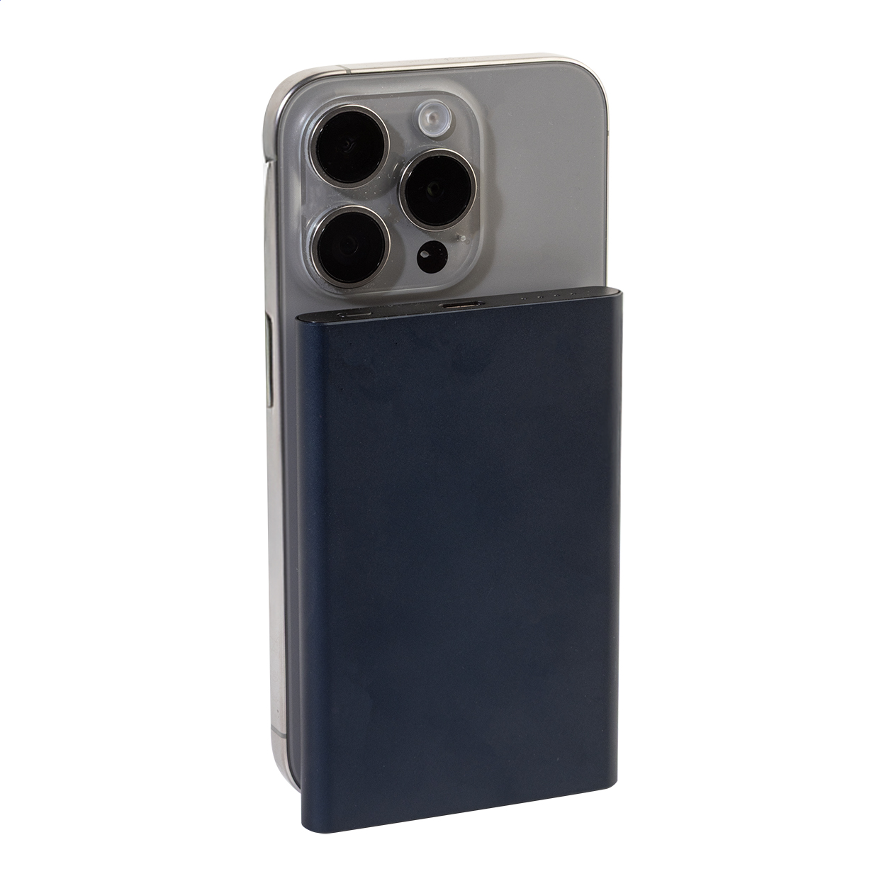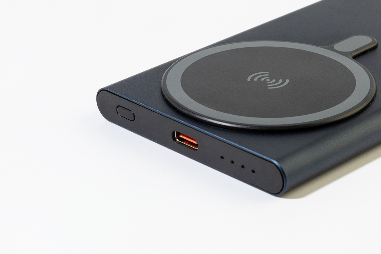 Powerbank aus recyceltem Aluminium mit eingebautem magnetischem Wireless-Charger (15 W) und 5000 mAh Akku. Mit USB-C-Eingang und Ladebuchse. Inklusive selbstklebendem Metallring zur Nutzung der Magnetfunktion auf jedem kabellos aufladbaren Gerät. Kompatibel mit iPhone® 12 oder neuer. Inklusive USB-Ladekabel.