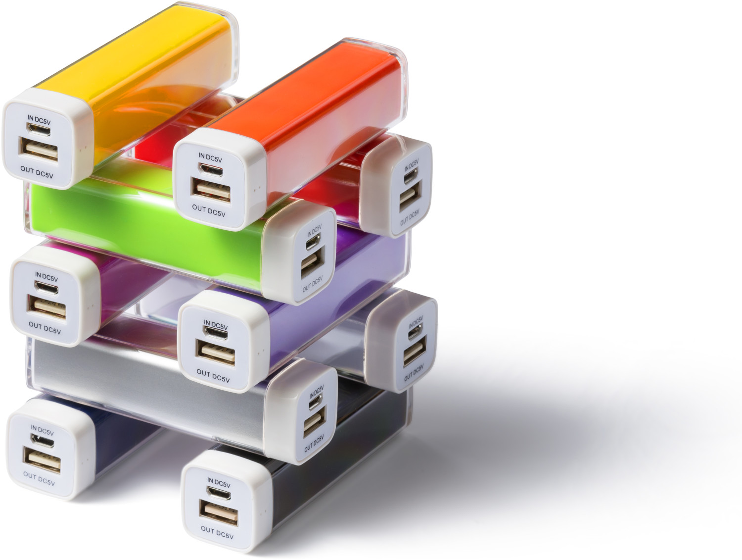 Powerbank aus ABS-Kunststoff, 2200 mAh Kapazität, Ein- und Ausgangsleistung 5V/1000 mAh, inkl. Verbindungskabel (USB und Micro USB, ca. 25 cm lang), Aufladezeit: ca. 5 Std. Für alle handelsüblichen Tablets und Smartphones verwendbar.