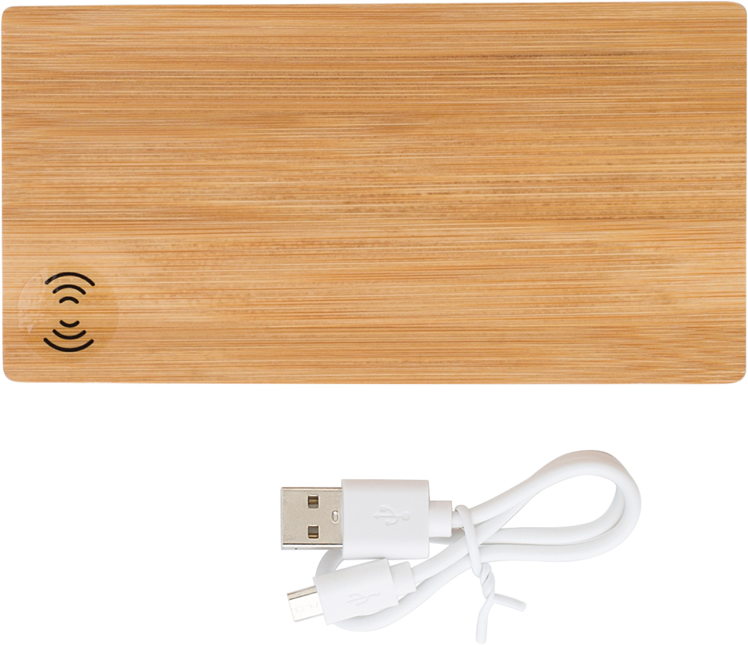 Powerbankaus Bambus mit 6000 mAh Kapazität, 5V/1000 mAh Ein- und Ausgangsleistung, zwei USB-Ports und Verbindungskabel (USB und USB-C).