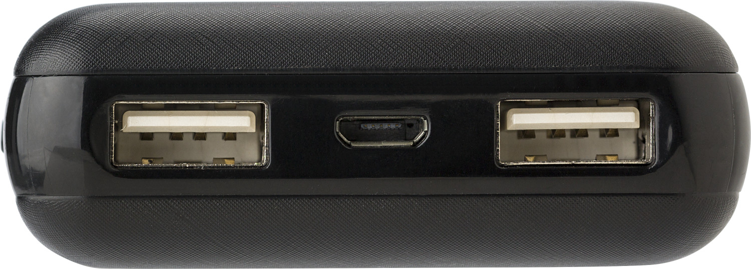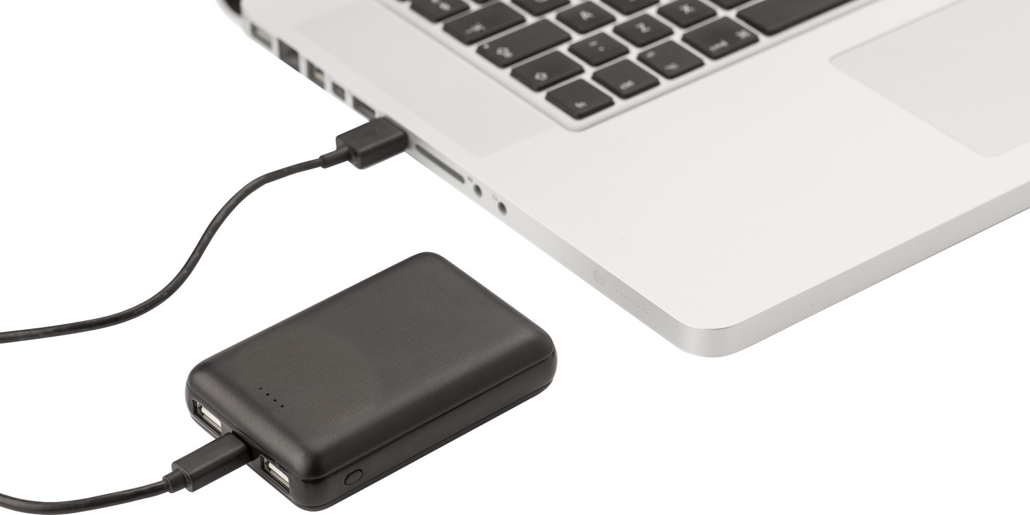 Powerbank 'Alto' aus ABS-Kunststoff mit einer Kapazität von 10.000 mAh, DC-Eingang 5V/2A, DC-Ausgang 5V/2A, vier LED-Kontrollleuchten, zwei Standard-USB-Anschlüssen, einem Micro-USB-Anschluss, einem Ein- / Ausschalter sowie einem Ladekabel.