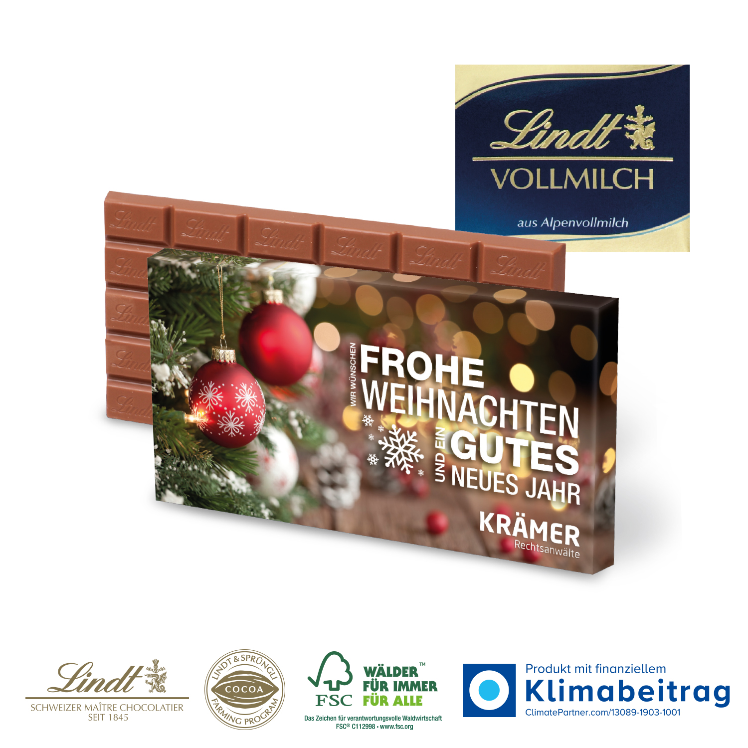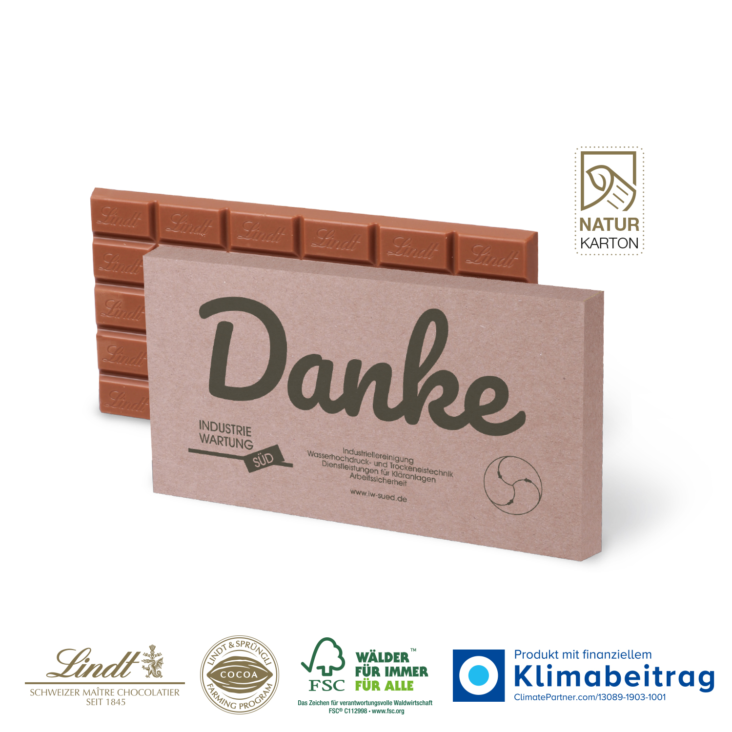 Qualität für höchste Ansprüche! Erfreuen Sie Ihre Kundinnen und Kunden oder Ihr Team mit feinster Schokolade von Lindt. Für einen optimalen Werbeeffekt wird die Verpackung ganz individuell bedruckt.
