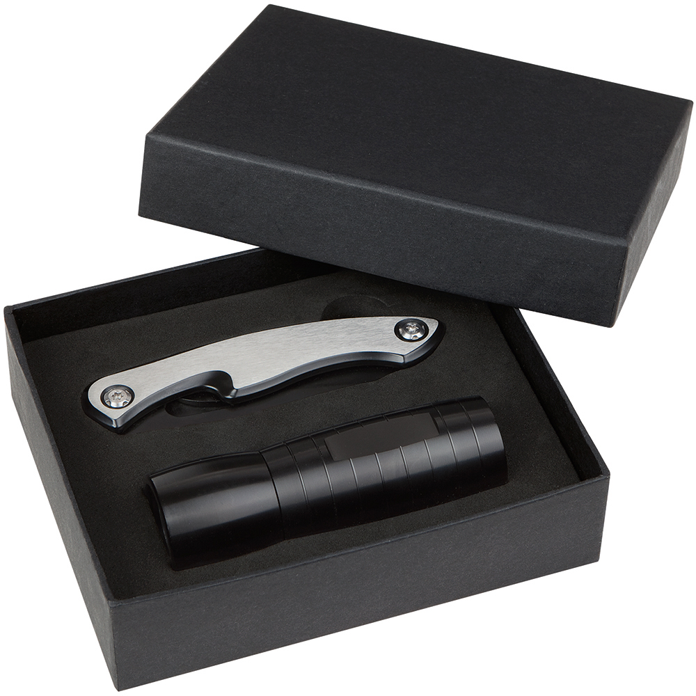 Hochwertiges Taschenmesser mit Klingenarretierung und 9 LED Taschenleuchte. Das Set besteht aus dem edlen Taschenmesser STEEL und der kompakten und leuchtstarken Taschenleuchte TURBO PLUS mit 9 LED, das Ganze verpackt in einer hochwertigen Karton-Geschenkverpackung. Das Taschenmesser besticht durch die hochwertigen Griffschalen aus gebürstetem Edelstahl. Die Klinge (Klingenlänge 75 mm) aus schwarz beschichtetem rostfreiem Edelstahl 3Cr13 bietet durch die Klingen-Arretierung ein Höchstmaß an Sicherheit und Komfort und verhindert ein unbeabsichtigtes Einklappen der Klinge. Ein außergewöhnliches Design und eine starke Leuchtkraft machen die Taschenleuchte TURBO PLUS zu einem besonderen Präsent. 3 AAA Batterien inkl. Verpackung: hochwertige Karton-Geschenkverpackung. Maße Einzelprodukte: Steel: 10,5 x 2,9 x 1,4 cm (geschlossen); Turbo Plus: 9,3 x 3,0 cm.