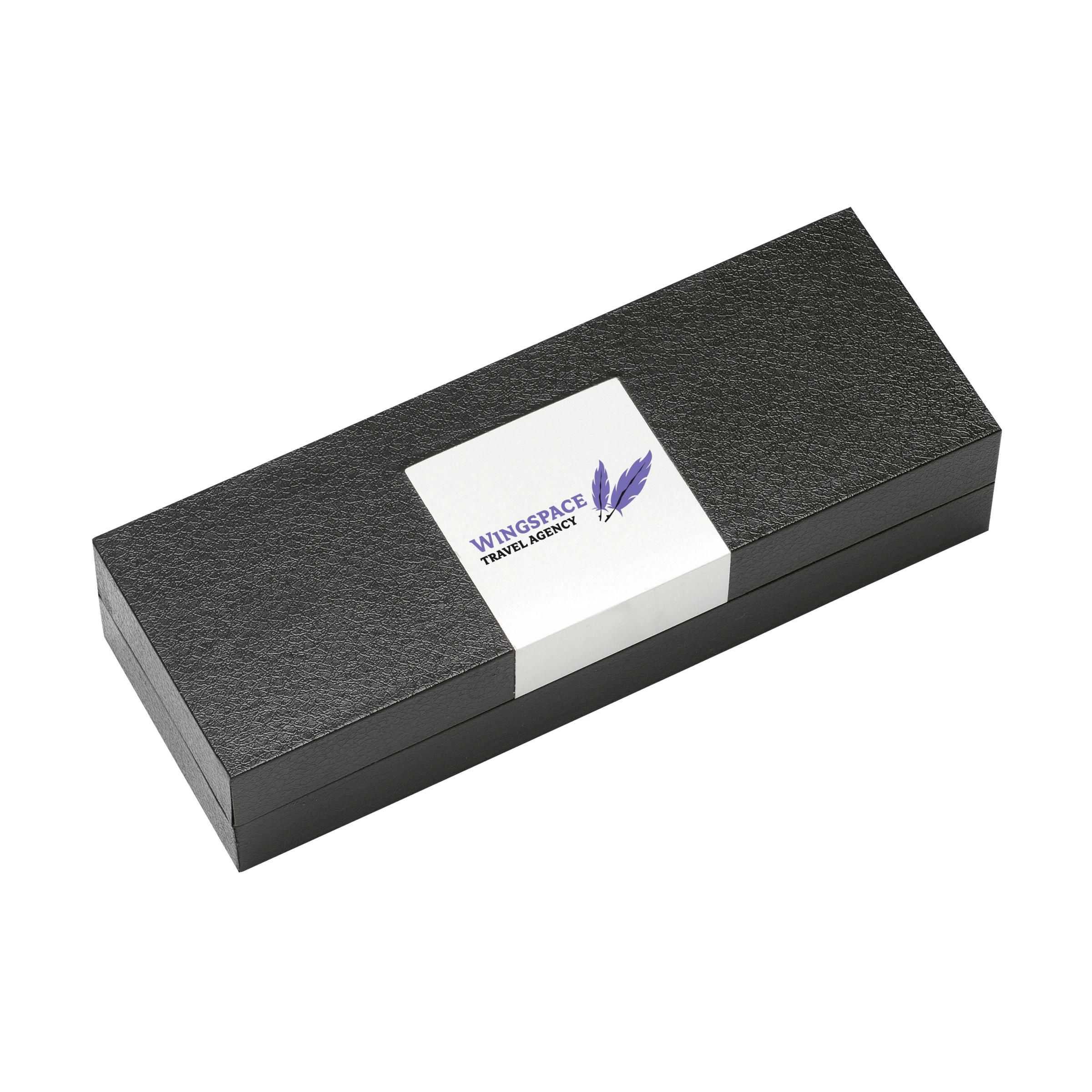 Hochglanz-Schreibset: blauschreibender Kugelschreiber mit Dreh-Klicksystem und einem Bleistift mit 3 HB-Minen (0,9 mm). Beide mit Metallakzenten. In einer Kassette.