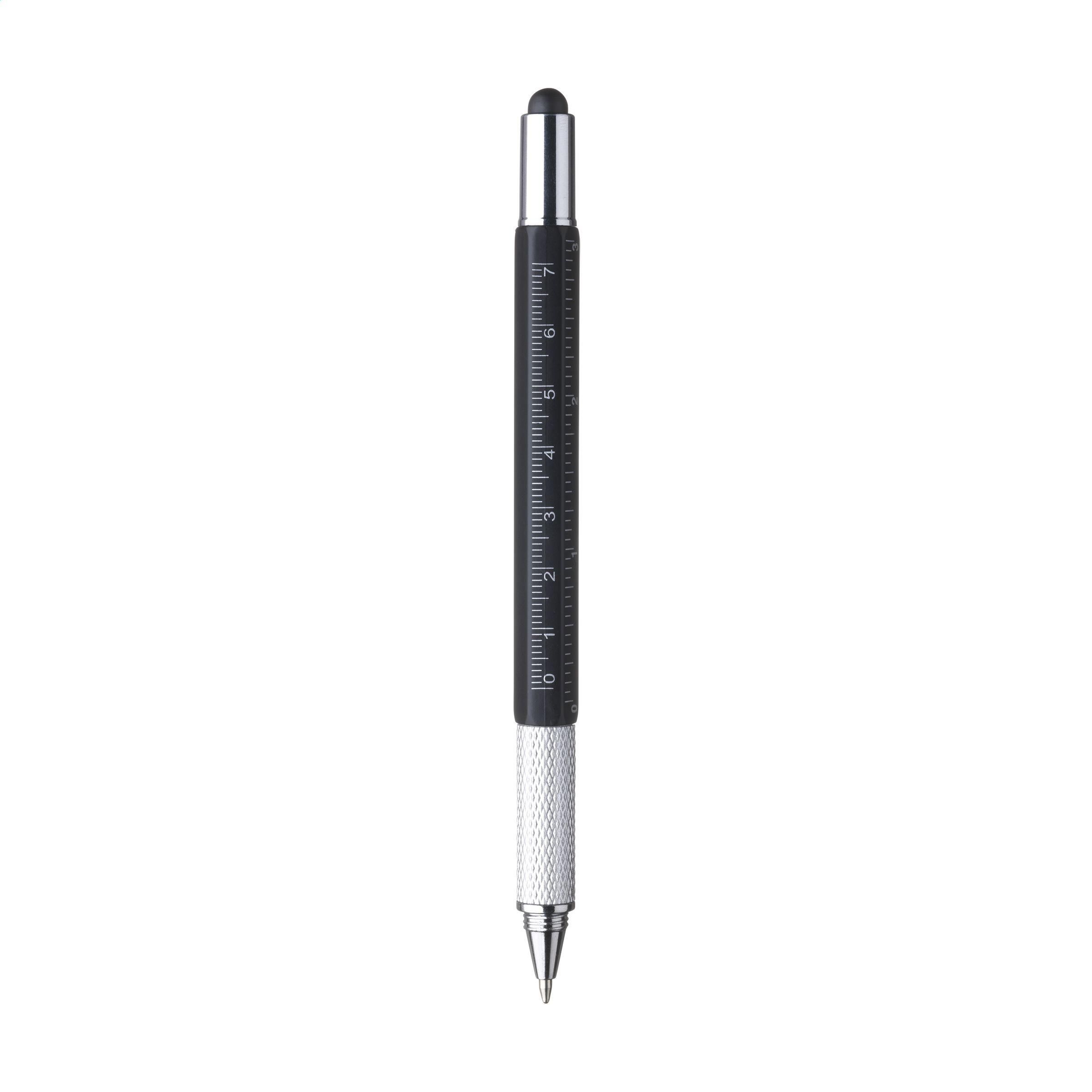 Multifunktionskugelschreiber aus ABS-Material. Mit Lineal (7 cm/3 inches), Wasserwaage, Schraubendreher und Stylus-Funktion. Der Stift verfügt über eine Mine mit blauer Tinte, einen Metallclip und einen Drehmechanismus.
