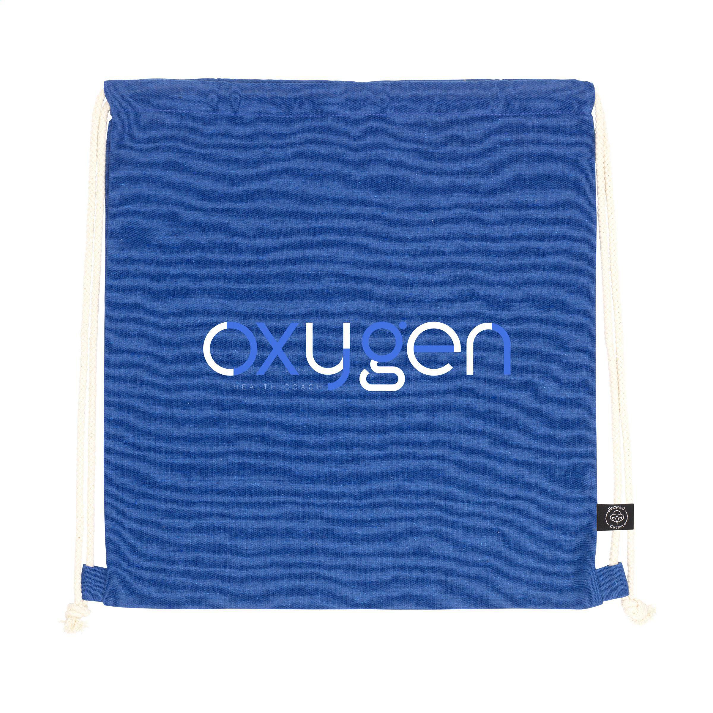Rucksack mit Kordelzug aus 80% recycelter Baumwolle und 20% recyceltem Polyester (150 g/m²). GRS-zertifiziert. Recyceltes Material insgesamt: 100%. Fassungsvermögen ca. 7 Liter.