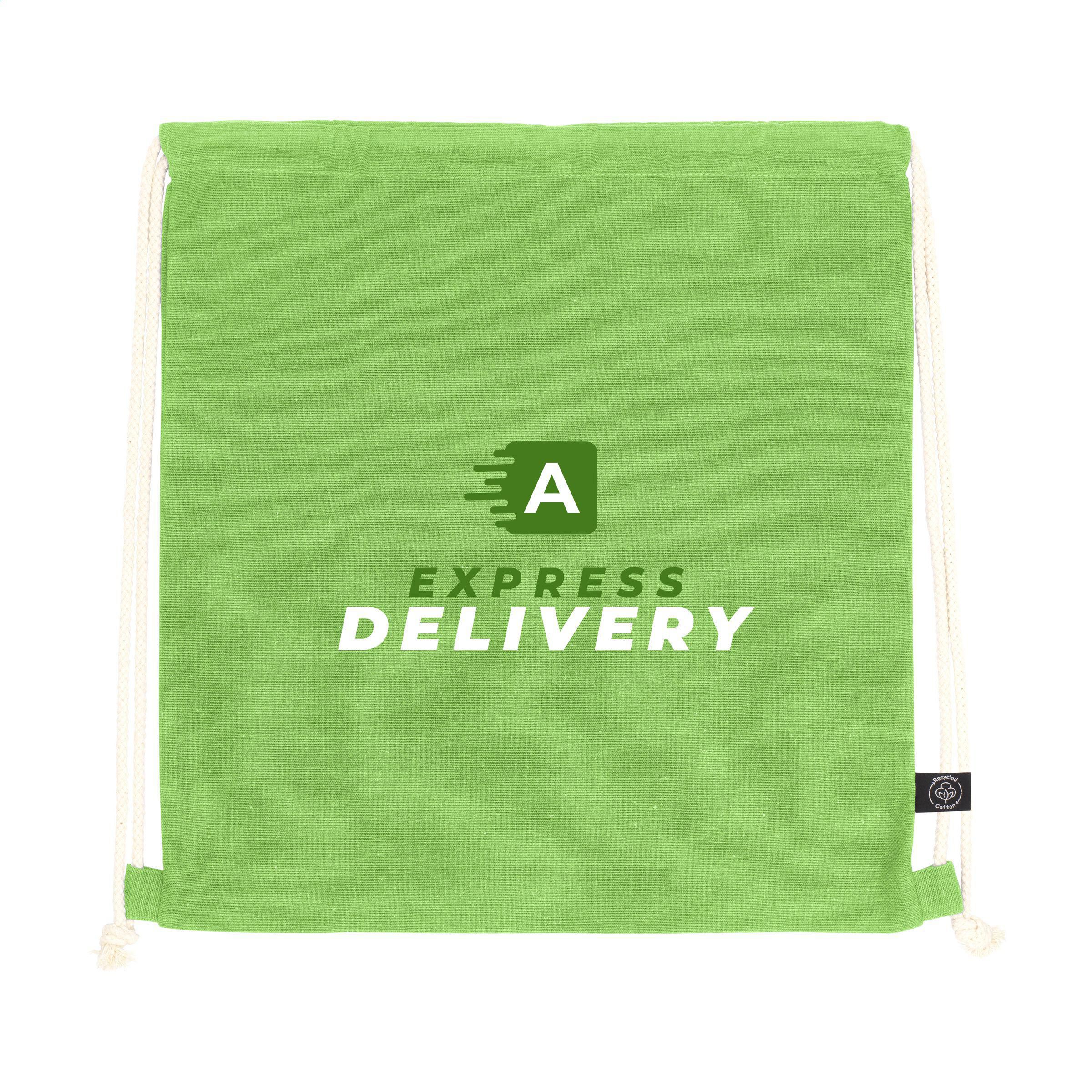 Rucksack mit Kordelzug aus 80% recycelter Baumwolle und 20% recyceltem Polyester (150 g/m²). GRS-zertifiziert. Recyceltes Material insgesamt: 100%. Fassungsvermögen ca. 7 Liter.