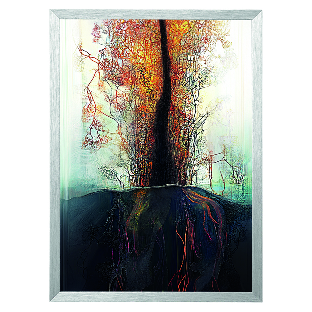 Der obere Teil des Baumes strahlt in warmen, leuchtenden Farben, die das lebendige Wachstum und die unaufhaltsame Energie symbolisieren, die aus der tiefen Verbindung mit der Erde gespeist werden. Unter der Oberfläche breiten sich die Wurzeln wie Adern aus, sie ziehen Nährstoffe und Stärke aus den verborgensten Tiefen.