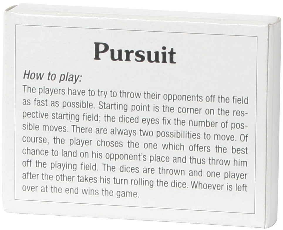 Bei diesem Würfelspiel versucht jeder Spieler, den anderen zu verfolgen und vom Spielfeld zu befördern. Englische Version.