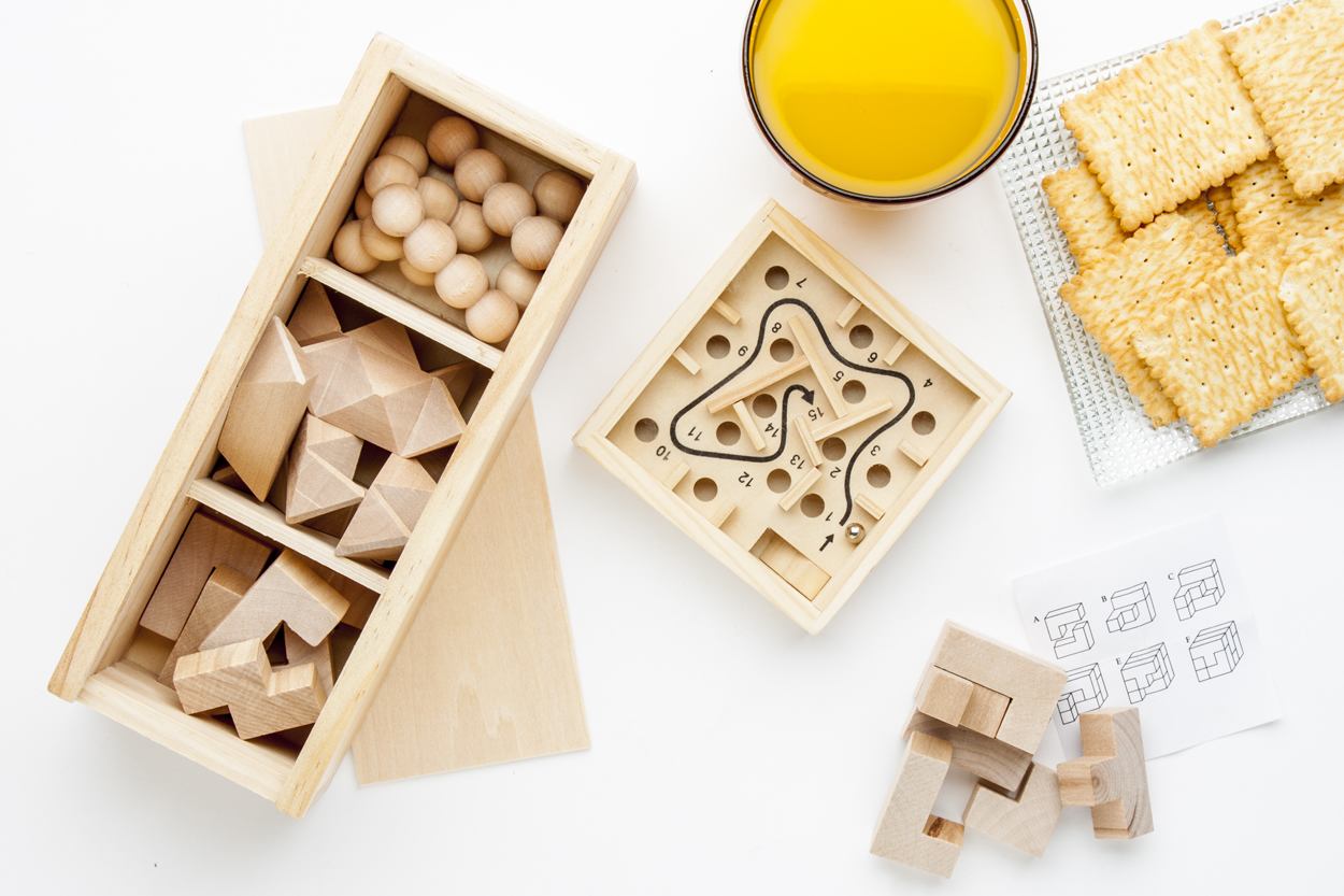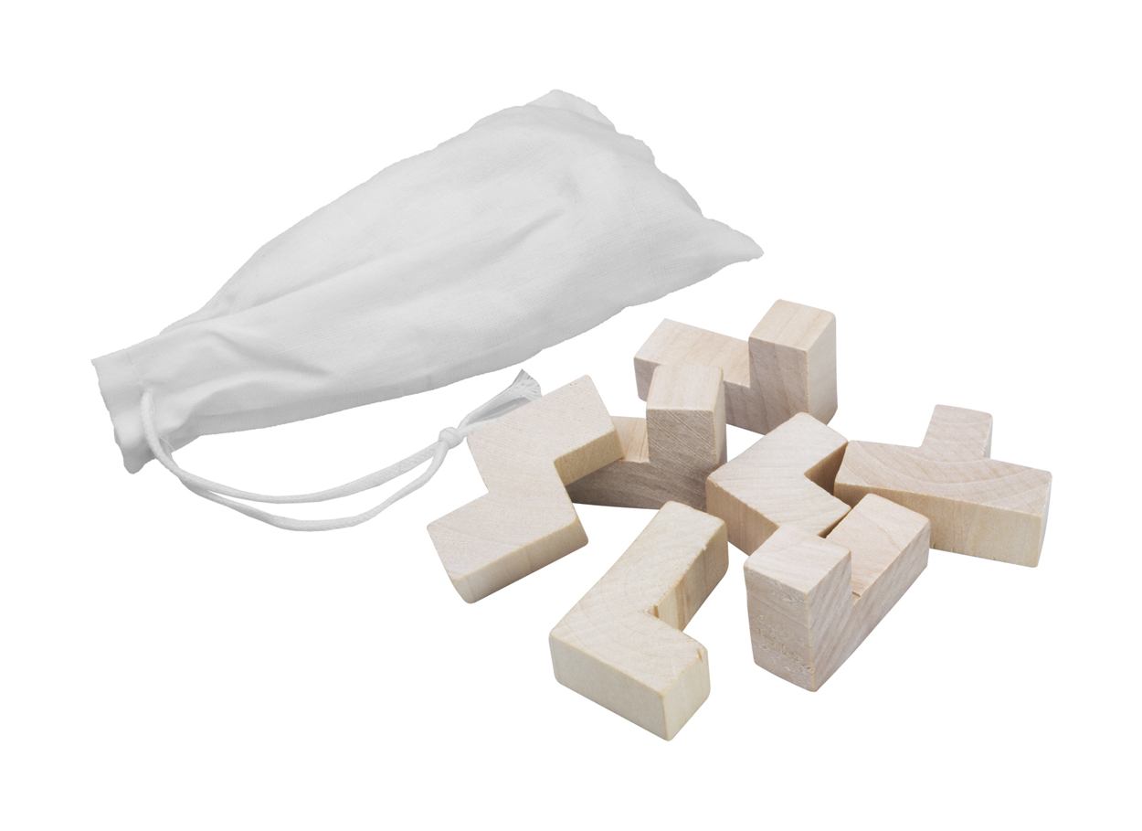 Geduldspiel aus Holz, ergibt einen Würfel. Einzeln im Baumwollbeutel (96×165 mm).