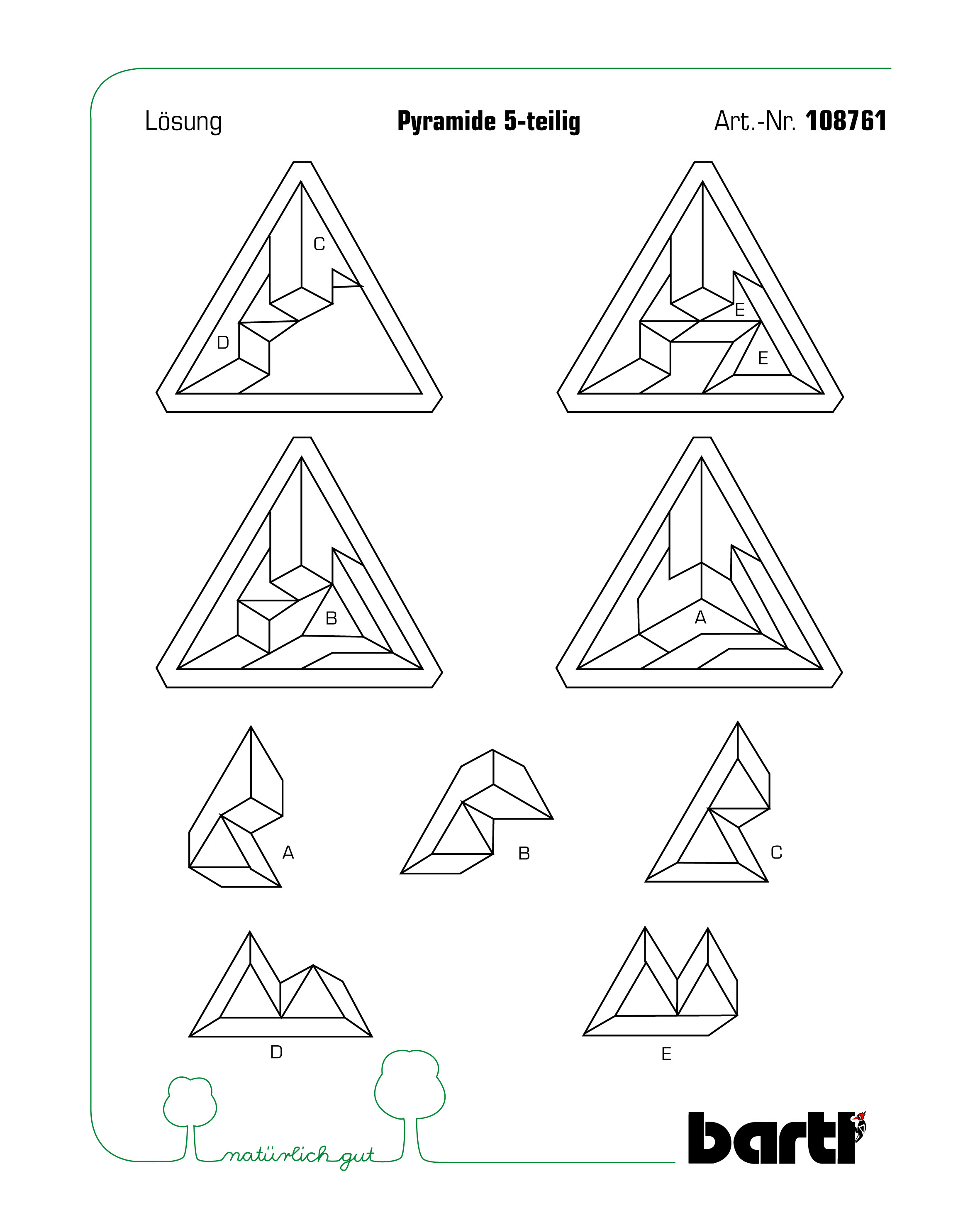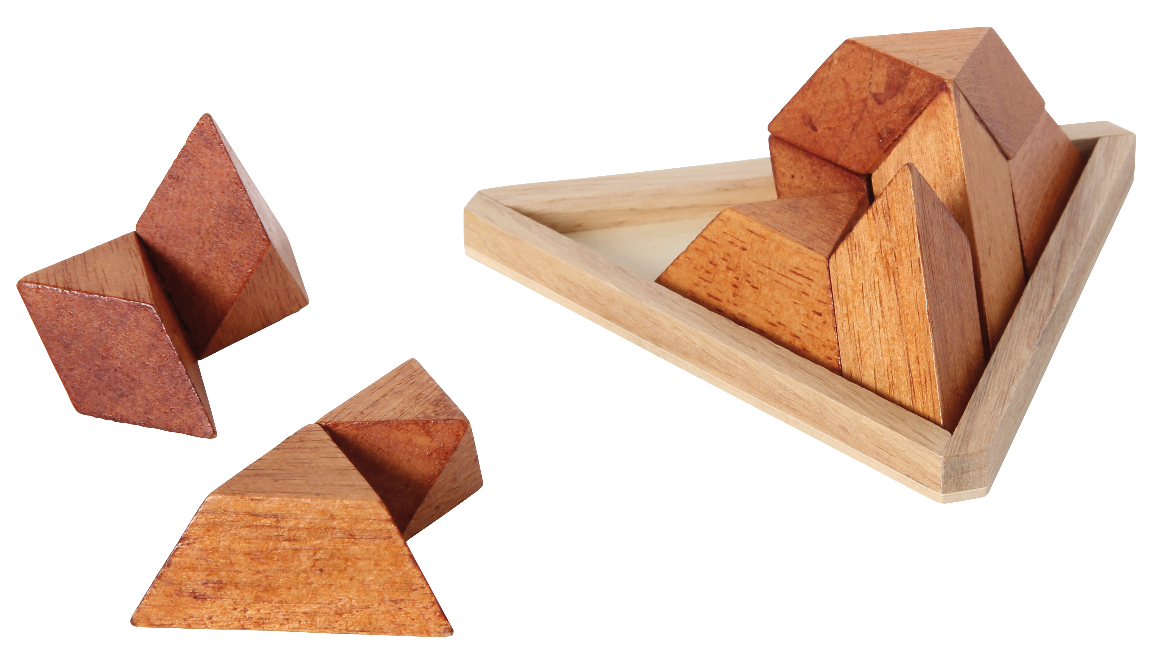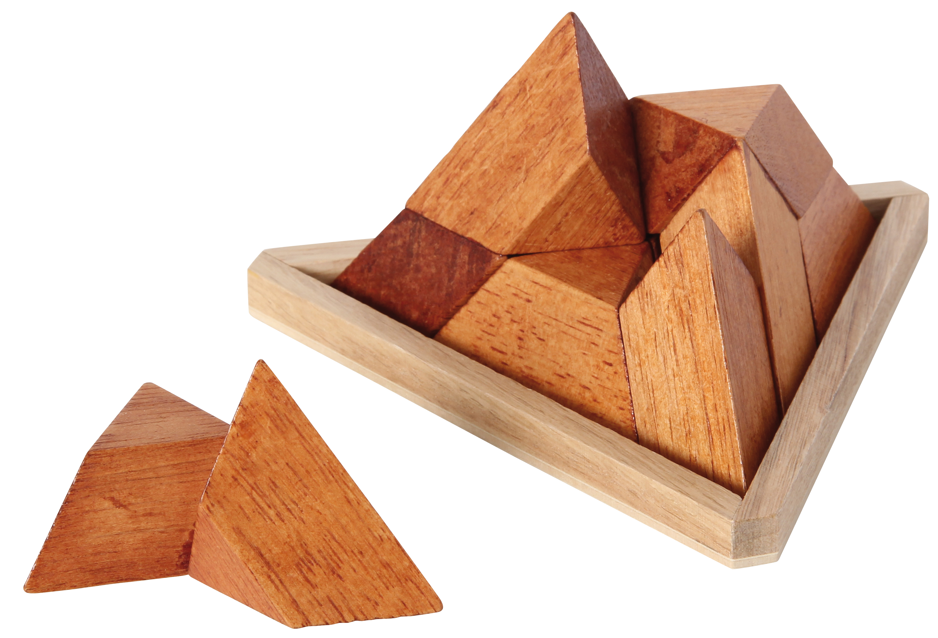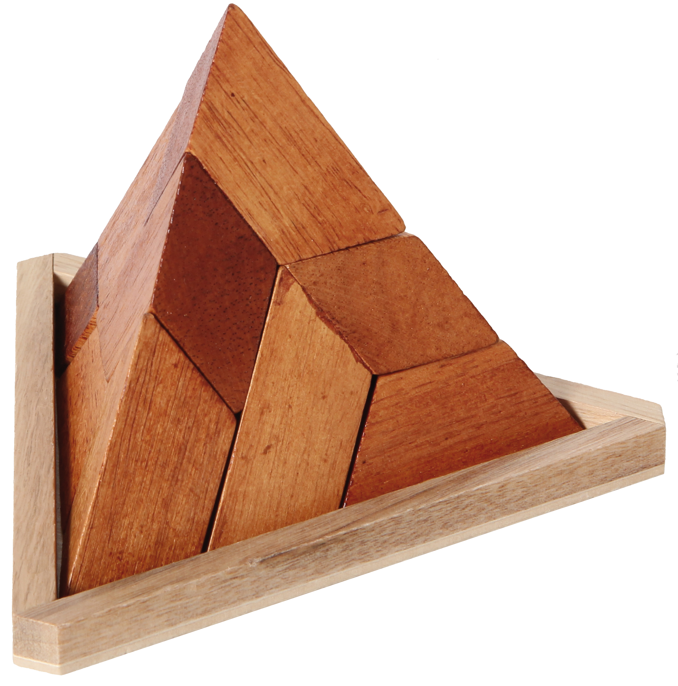 Nur ein pyramidaler Pyramidenpuzzler kann aus fünf unterschiedlich geformten Holzteilen eine Pyramide puzzeln. Mit praktischem Holzrahmen.