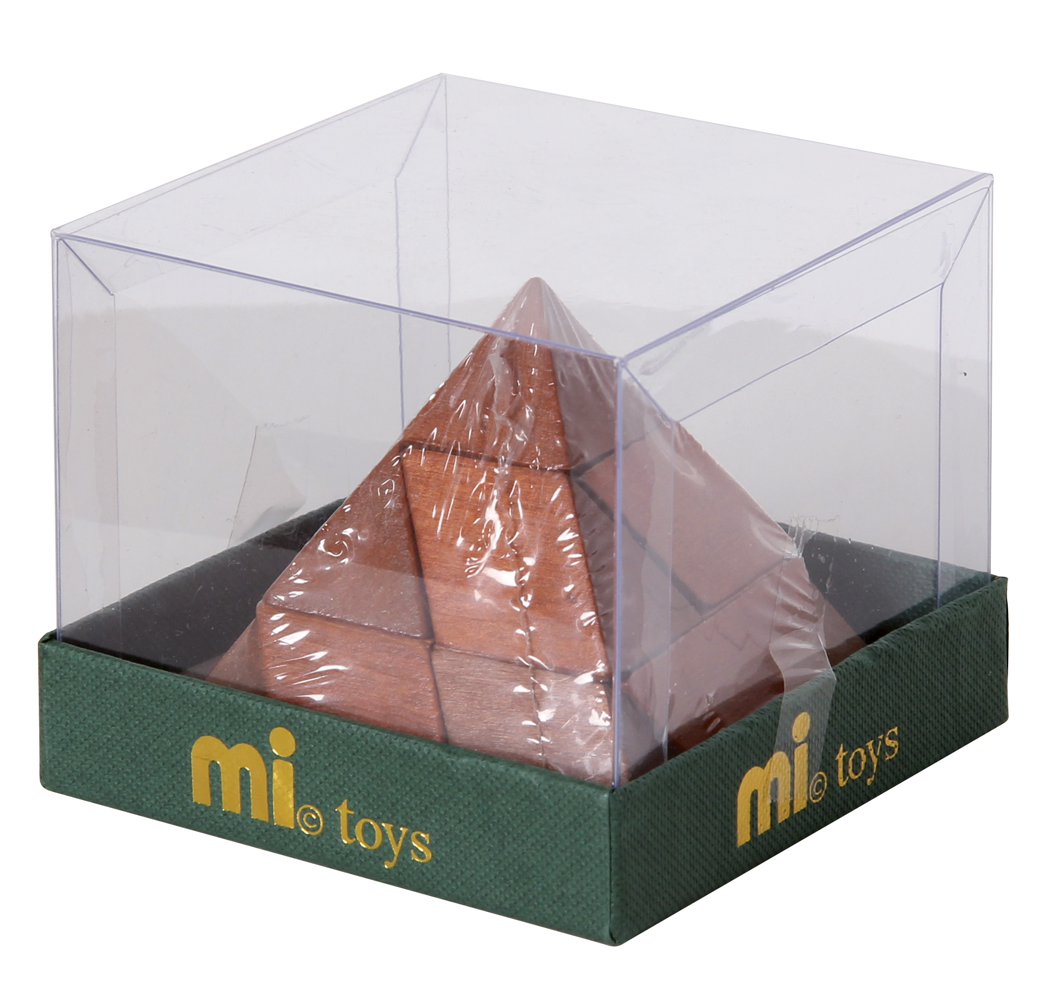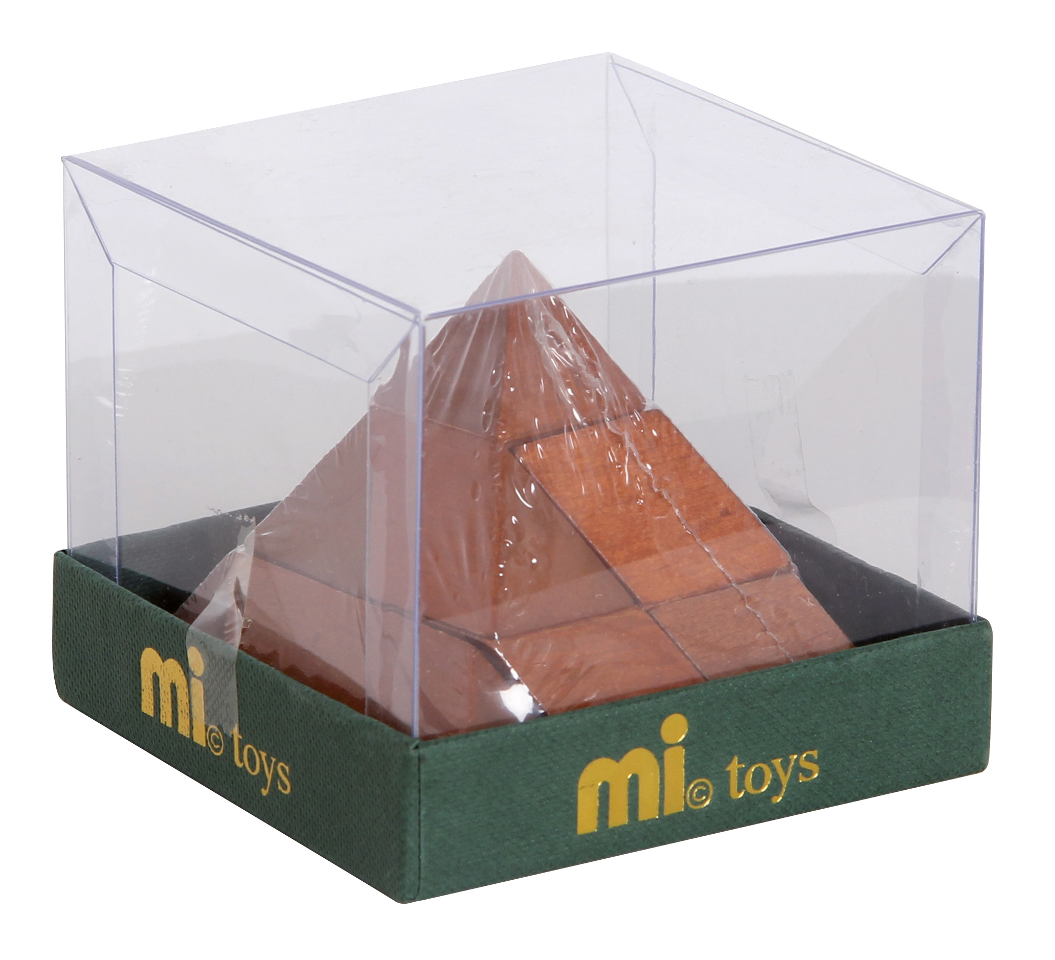 Zehn Holzteile sollen eine Pyramide bilden. Nur wie? In Geschenkverpackung.
