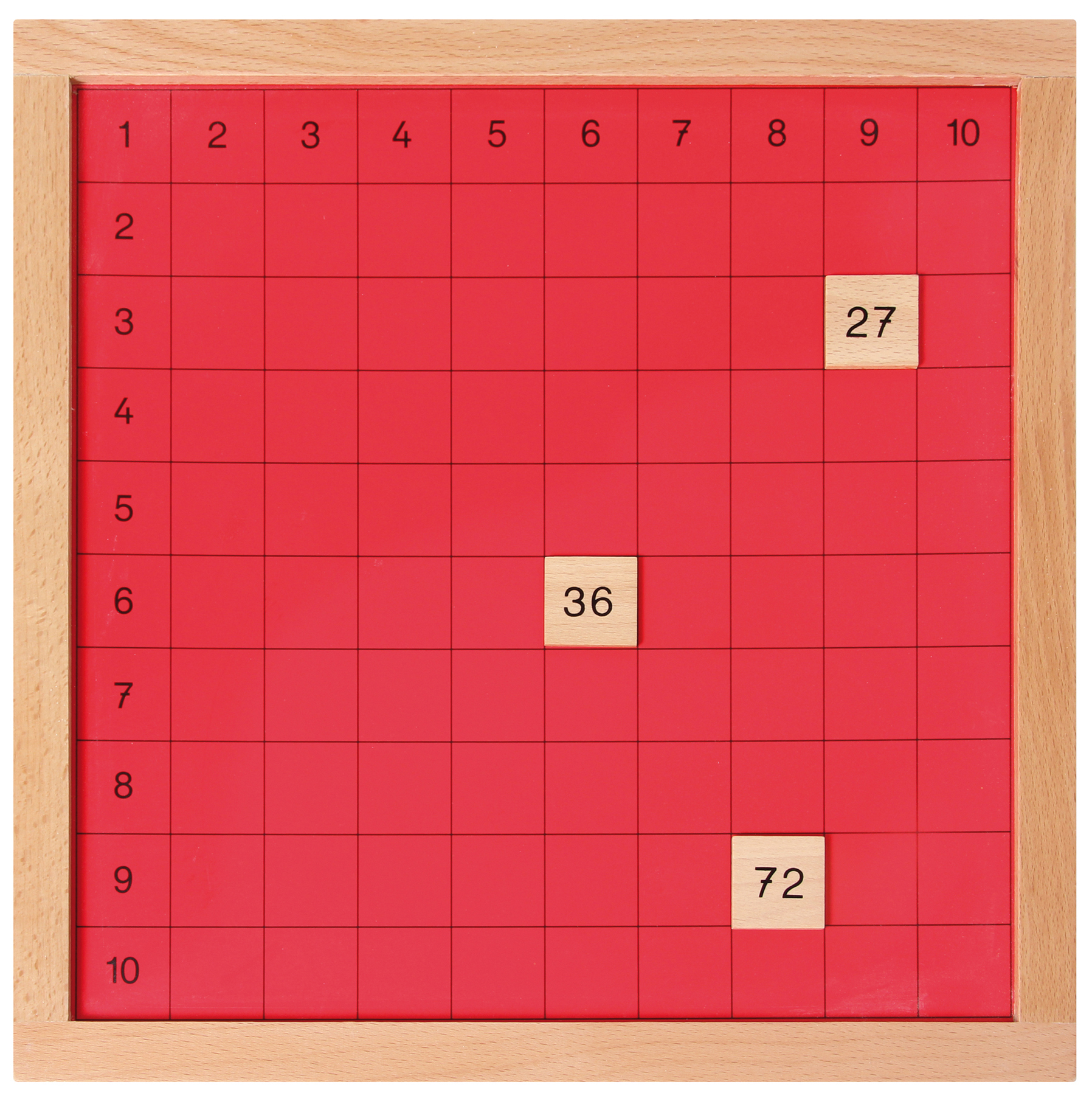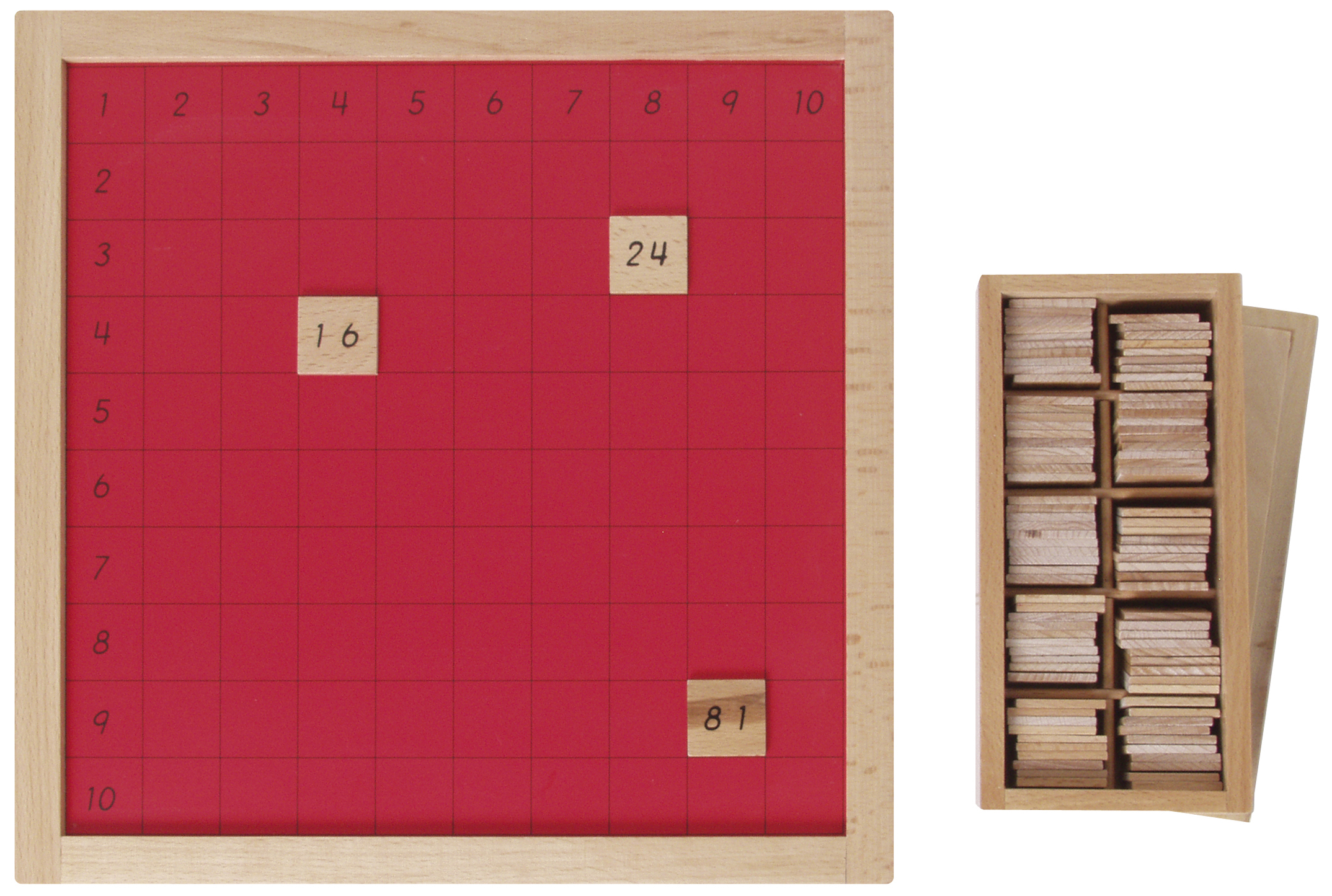 Das Material besteht aus einem Brett mit 100 eingezeichneten Quadraten und 100 Zahlenplättchen (mit den Ergebnissen des kleinen Einmaleins) im Kasten. Alles aus Holz. Damit lernt man das kleine Einmaleins. Selbstkontrolle durch Kontrolltafel, Art.-Nr. 109599. Größe des Brettes: 34 x 34 x 1,5 cm. Ab 5 Jahren.