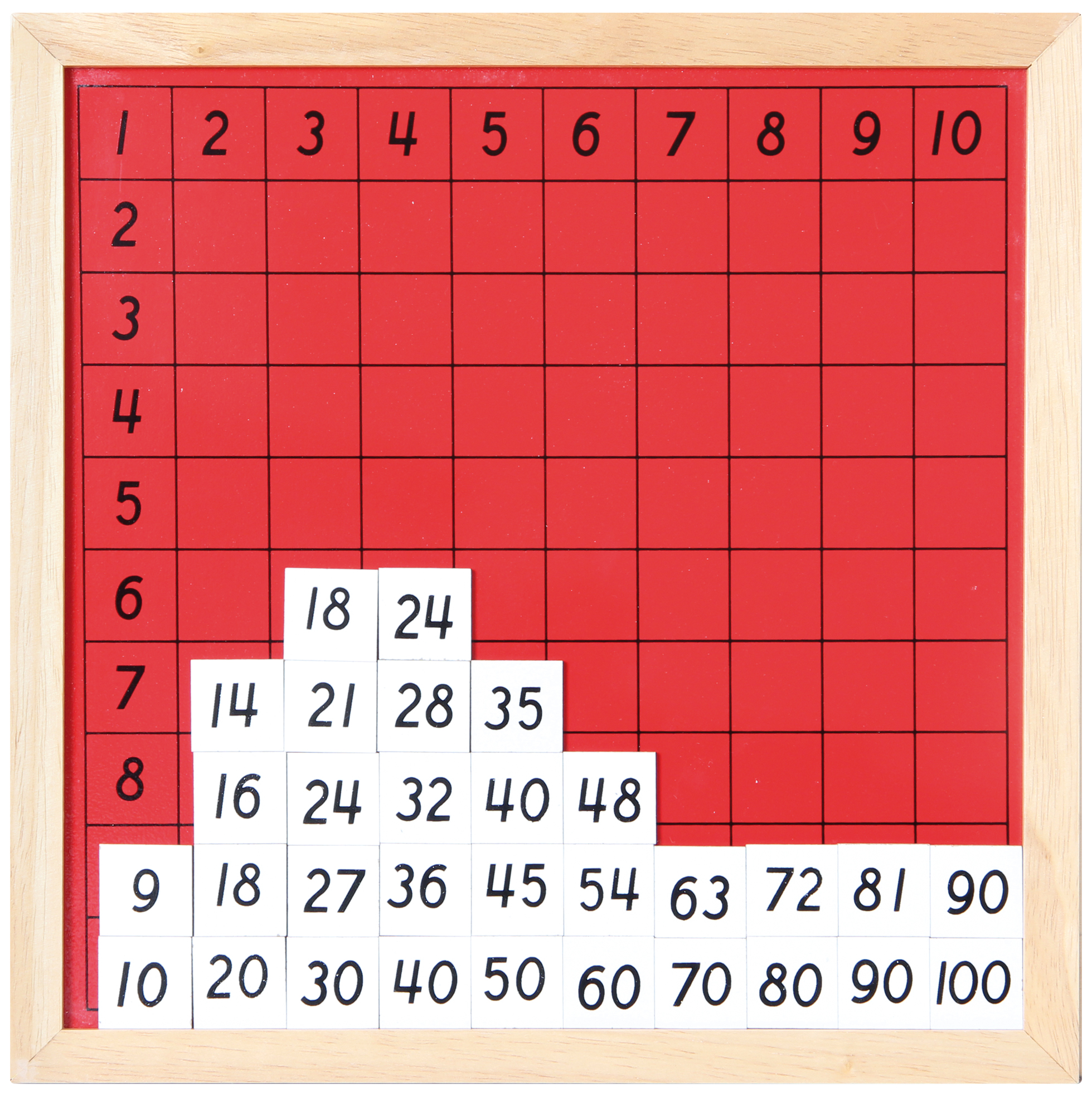 Das Material besteht aus einem Brett mit 100 eingezeichneten Quadraten, 100 Zahlenplättchen (mit den Ergebnissen des kleinen Einmaleins) im Kasten und einer Kontrolltafel. Alles aus Holz. Damit lernt man das kleine Einmaleins. Selbstkontrolle durch Kontrolltafel. Größe des Brettes: 29 x 29 x 1,5 cm. Ab 5 Jahren.