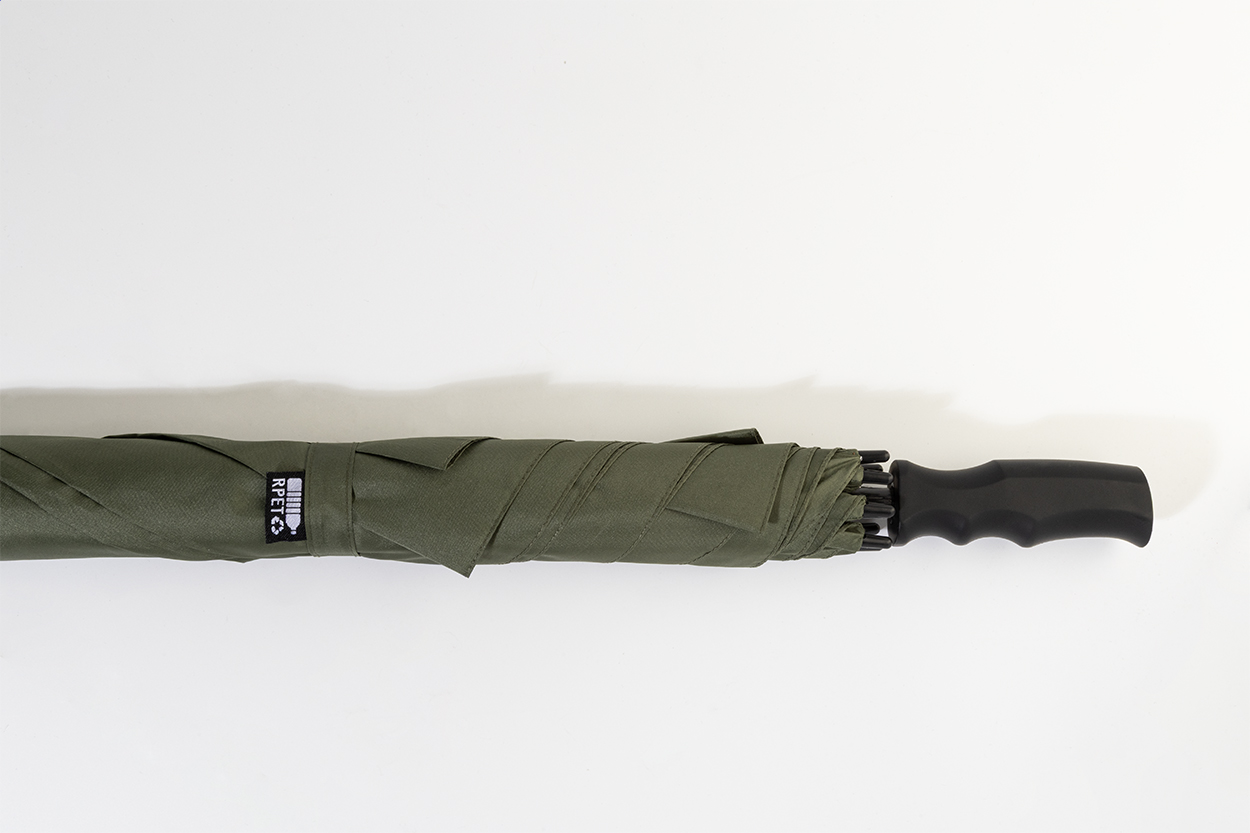 Automatischer, großer, quadratischer windproof Regenschirm. Gestell und Schaft aus Fiberglas, mit gummierten ABS-Griff. Material: 190T RPET-Pongee. Mit Label RPET.