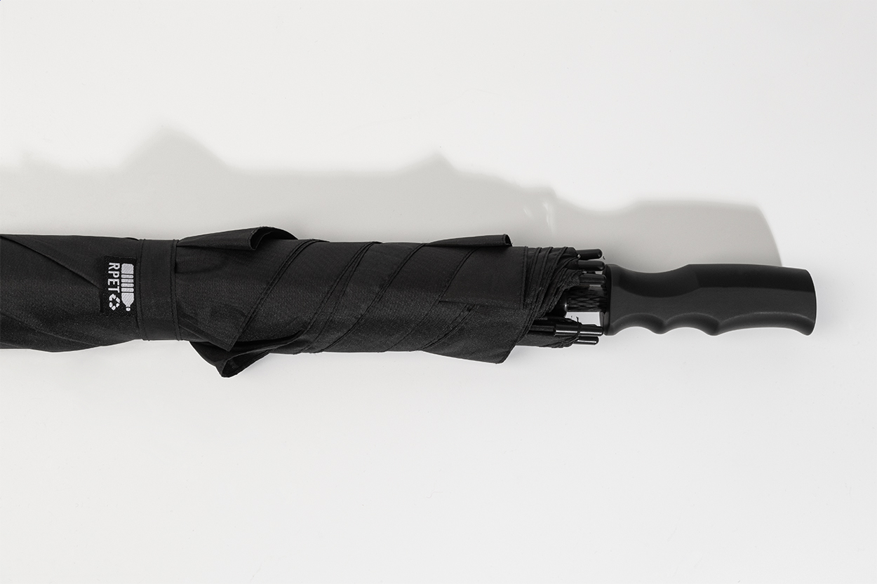 Automatischer, großer, quadratischer windproof Regenschirm. Gestell und Schaft aus Fiberglas, mit gummierten ABS-Griff. Material: 190T RPET-Pongee. Mit Label RPET.