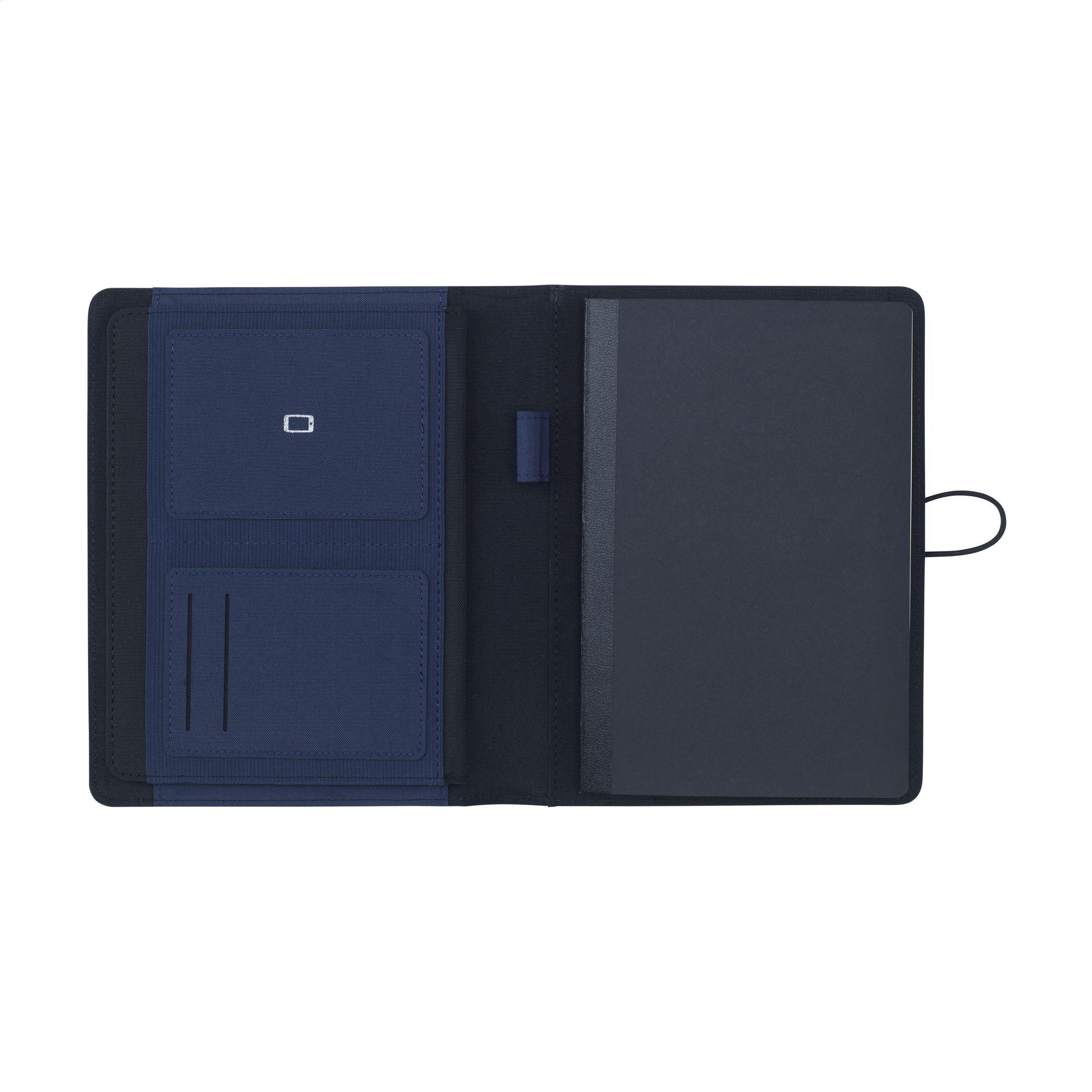 Moderne Schreibmappe/Dokumentenmappe aus RPET-Material im A5-Format. Ausgestattet mit mehreren Einsteckfächern, darunter ein separates Fach für ein Mobiltelefon, 2 Kartenfächer und eine Stiftschlaufe.Inkl. Notizbuch mit ca. 64 Blatt FSC zertifiziertem, cremefarbenem, liniertem Papier (70 g/m²).
