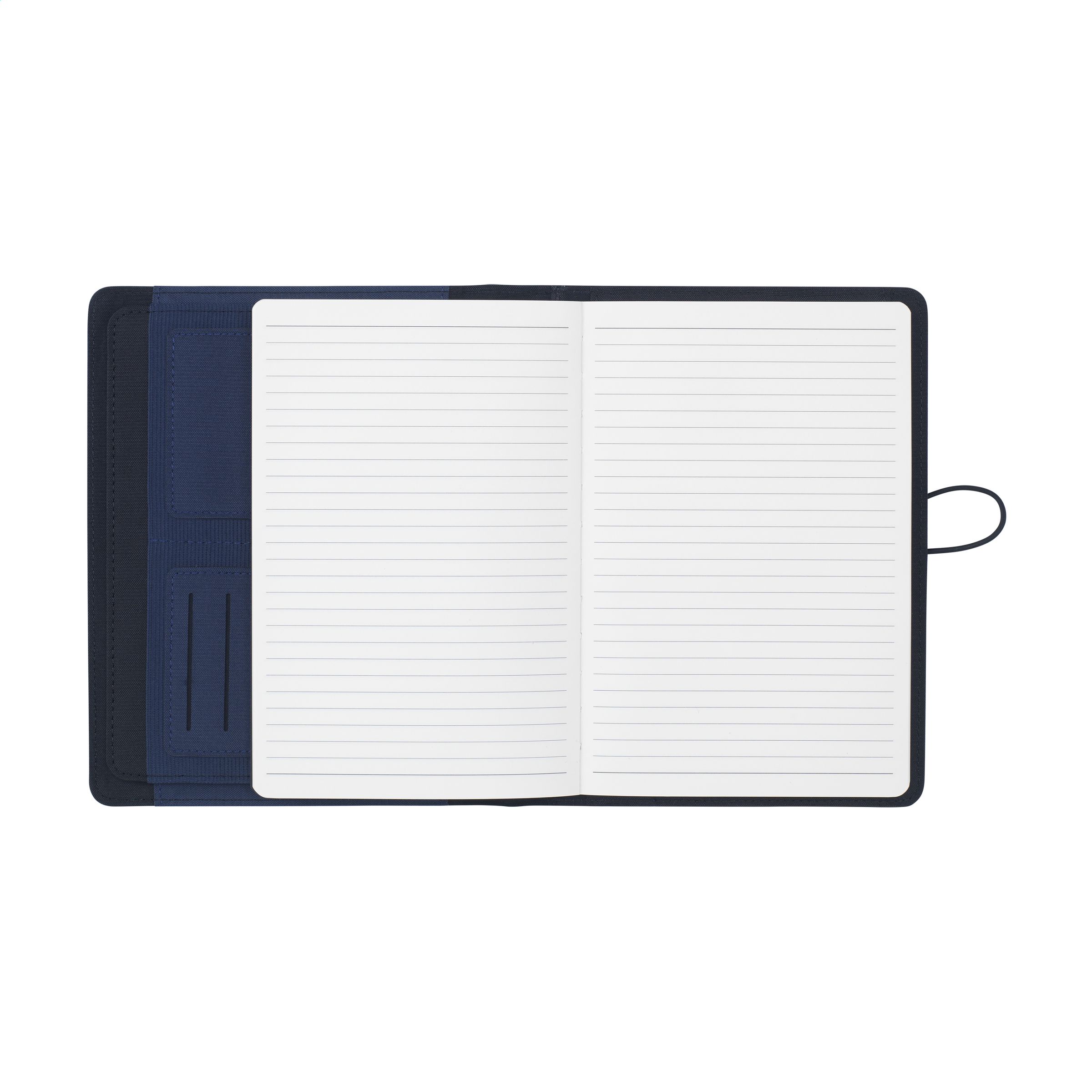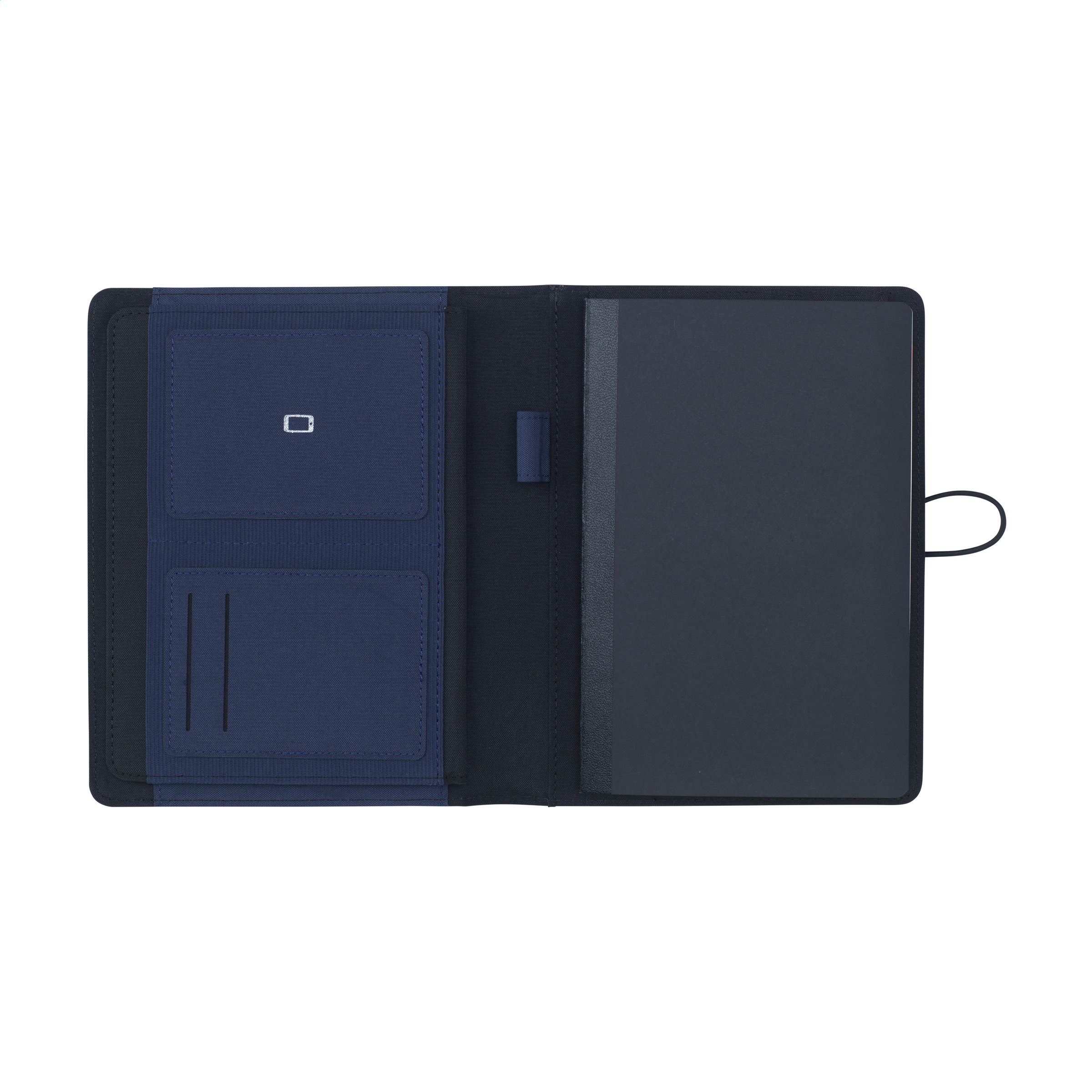 WoW! Moderne Schreibmappe / Dokumentenmappe aus RPET-Material im A5-Format. Ausgestattet mit mehreren Einsteckfächern, darunter ein separates Fach für ein Mobiltelefon, 2 Kartenfächer und eine Stiftschlaufe. Inkl. Notizbuch mit ca. 64 Blatt FSC zertifiziertem, cremefarbenem, liniertem Papier (70 g / m²).