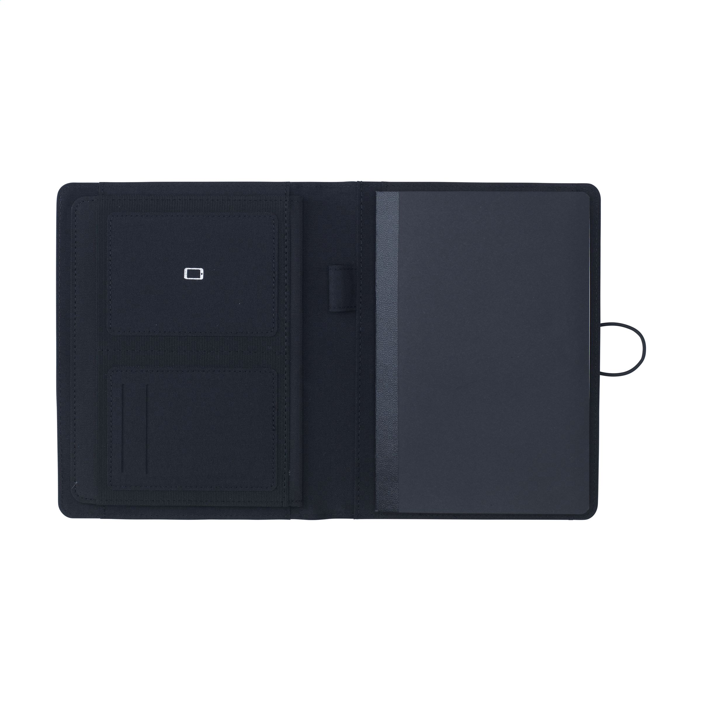 WoW! Moderne Schreibmappe / Dokumentenmappe aus RPET-Material im A5-Format. Ausgestattet mit mehreren Einsteckfächern, darunter ein separates Fach für ein Mobiltelefon, 2 Kartenfächer und eine Stiftschlaufe. Inkl. Notizbuch mit ca. 64 Blatt FSC zertifiziertem, cremefarbenem, liniertem Papier (70 g / m²).