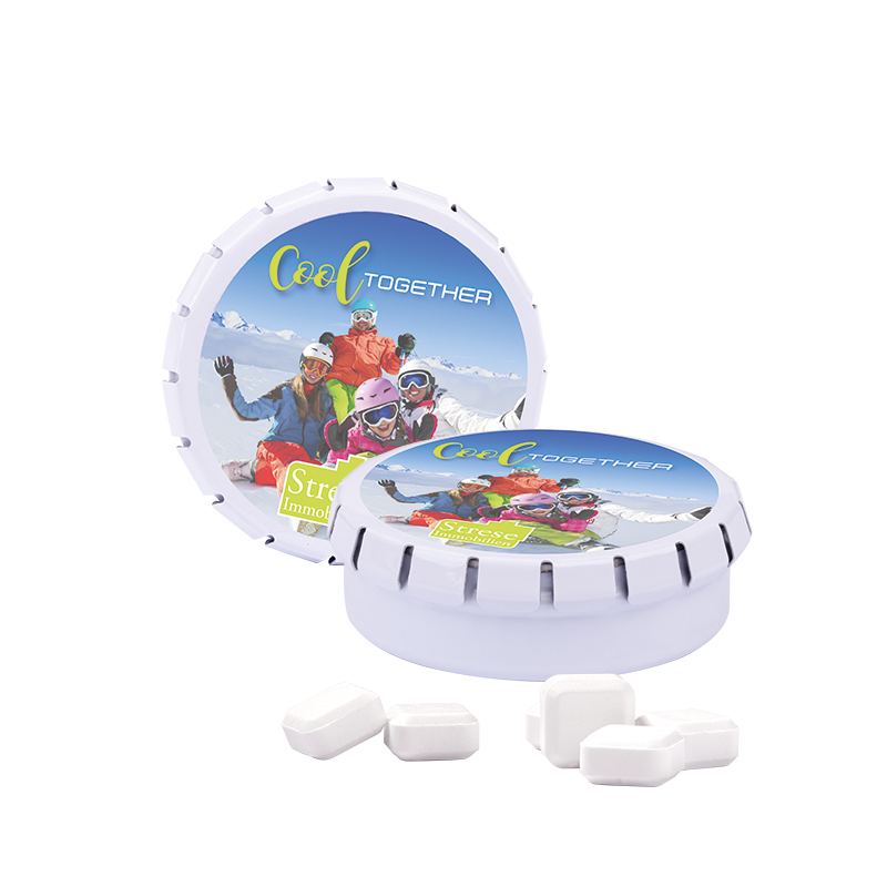 Runde Dose mit Springdeckel, weiß aus Metall, individuell bedruckt. Mit Originalitätsverschluss und Aufreißperforation, Weißblech 98% recycelbar. Inhalt: Traubenzuckerquadrate mit Fruchtgeschmack, 19 g. Produktionsbedingt leichte Sprühnebelspuren am Motivrand möglich