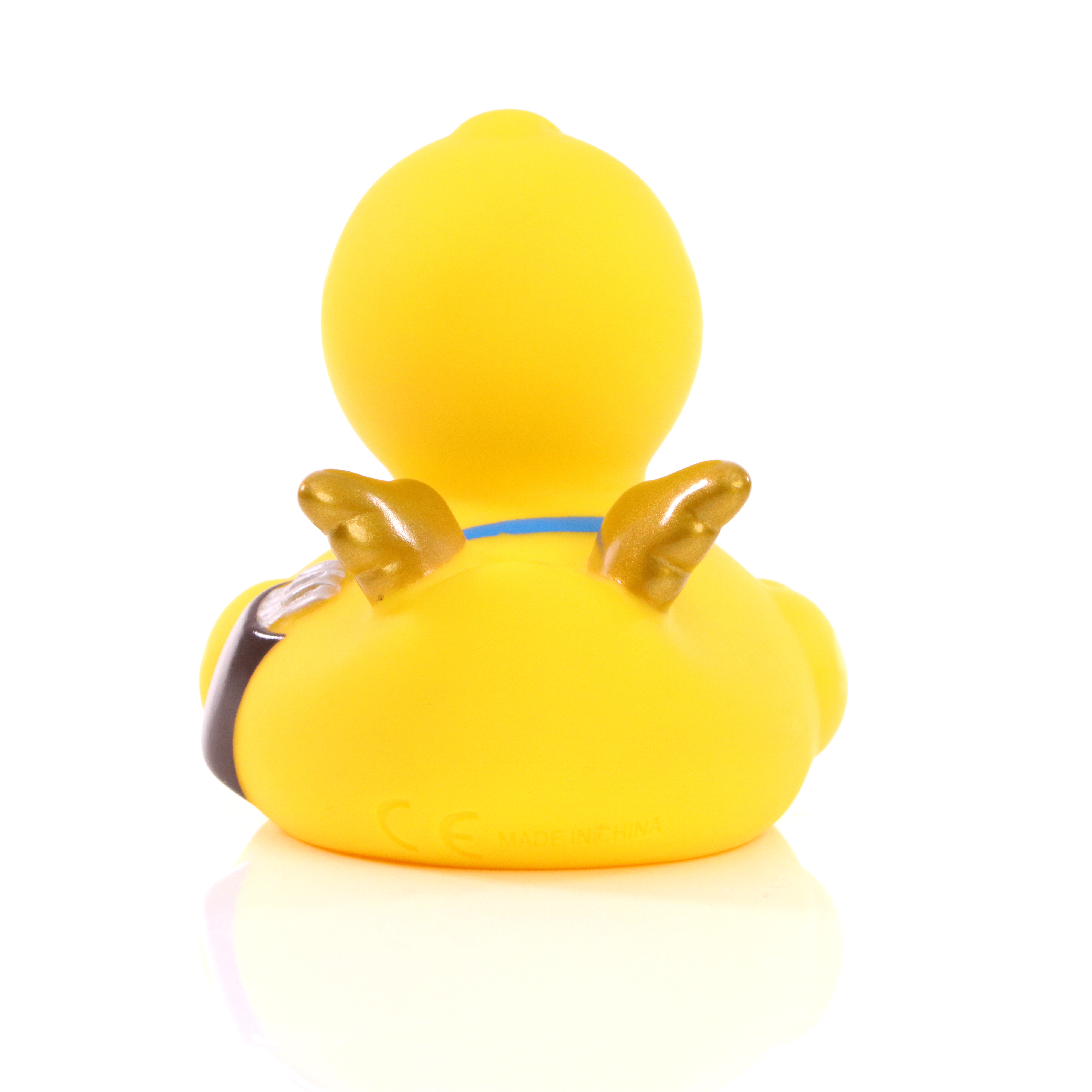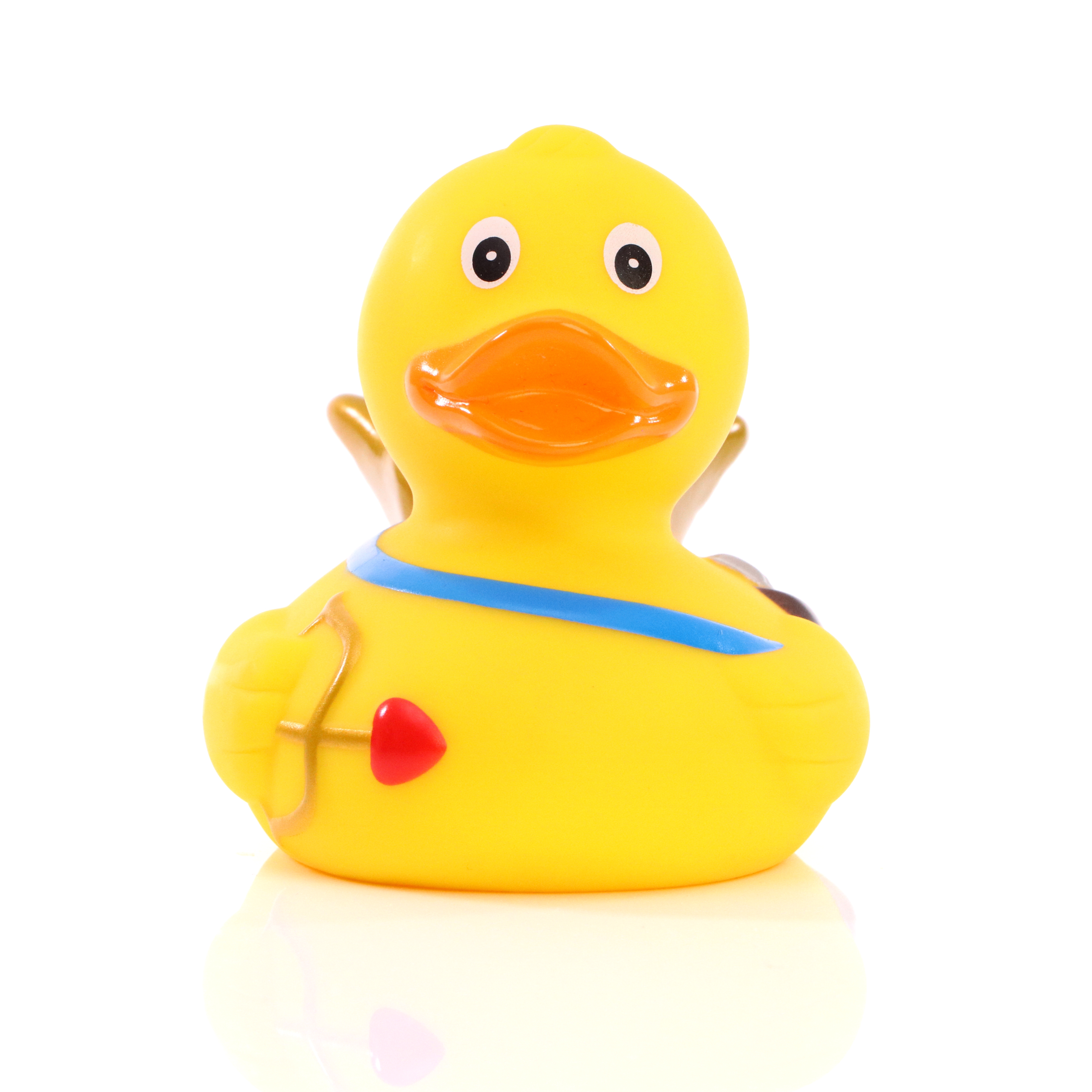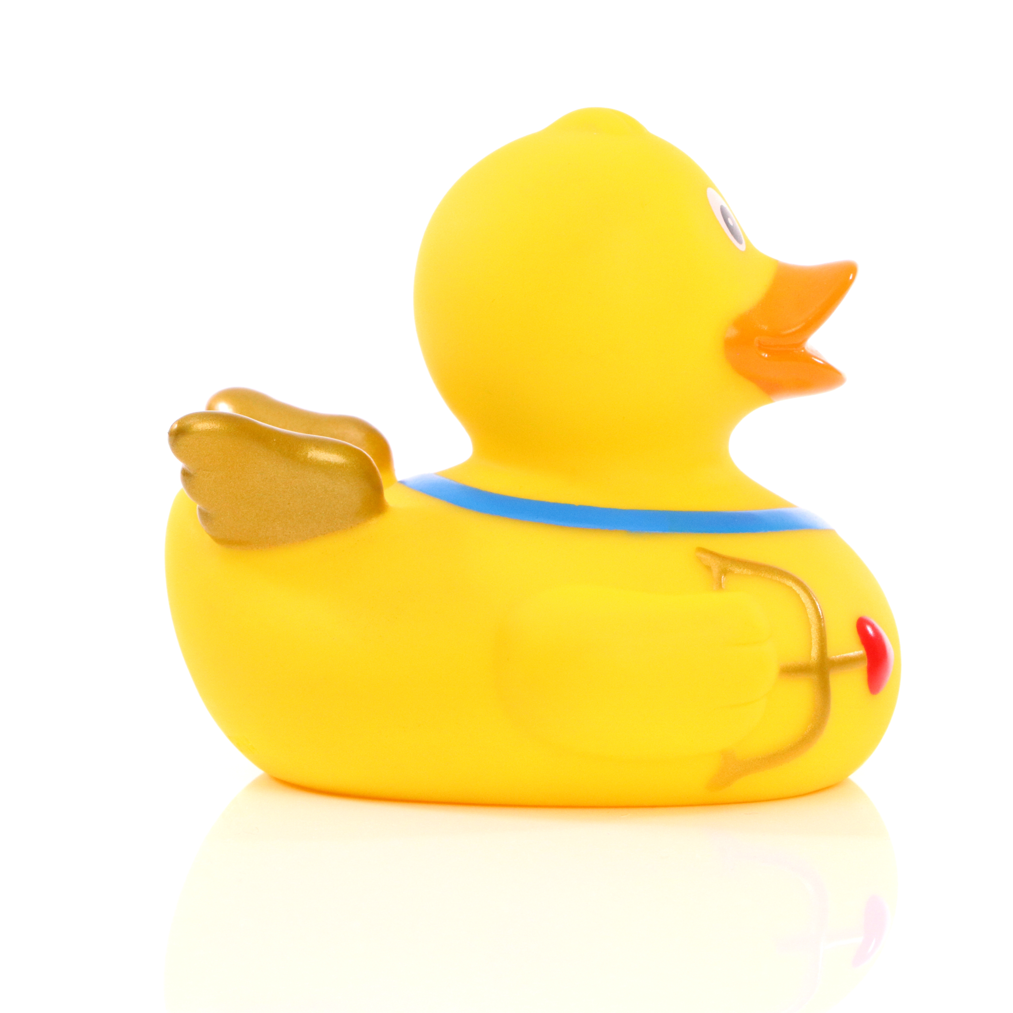 Als römischer Liebesgott Amor kommt diese Badeente daher. Ein Pfeil im Bogen gespannt, die anderen im Köcher verstaut fliegt er mit goldenen Engelsflügeln durch die Welt.