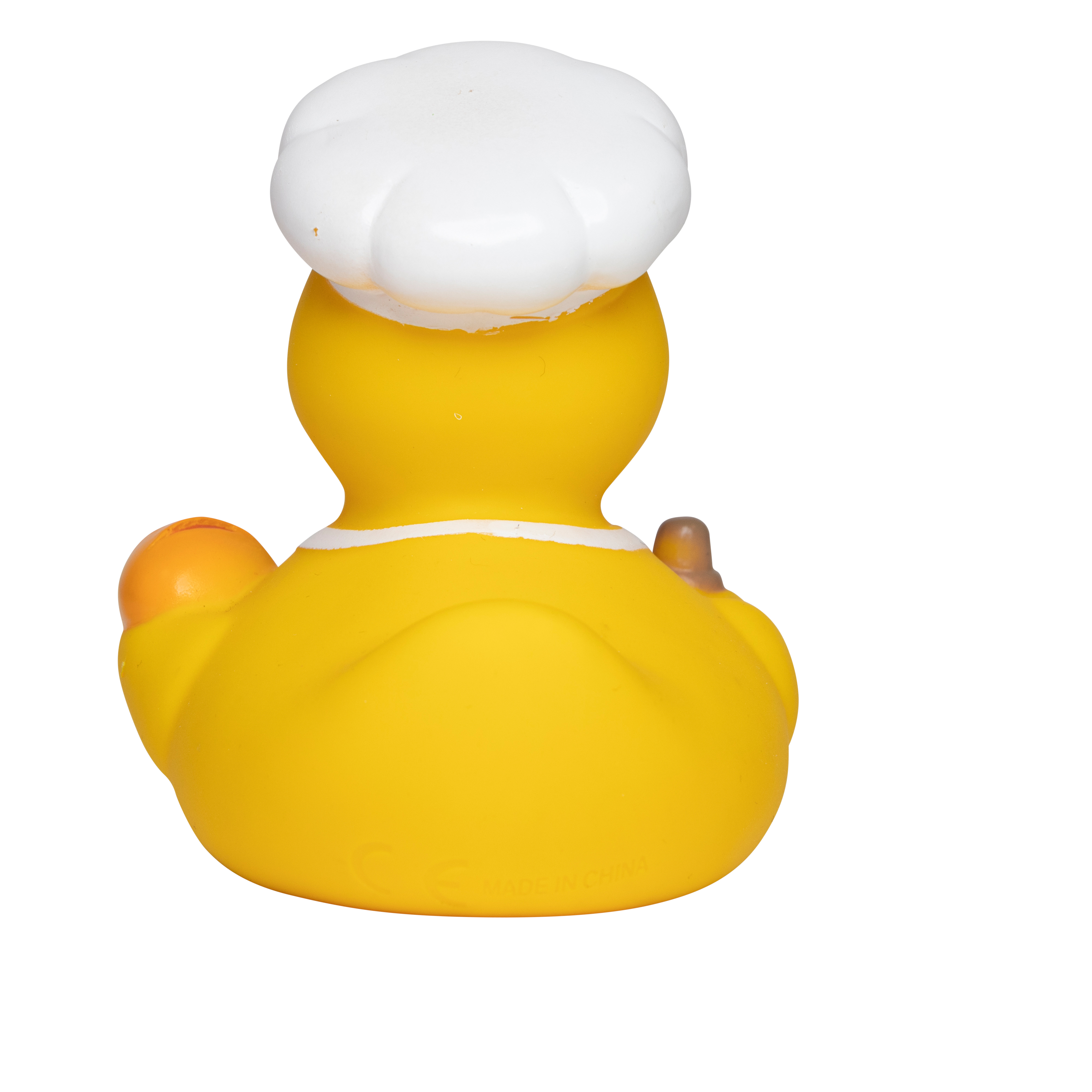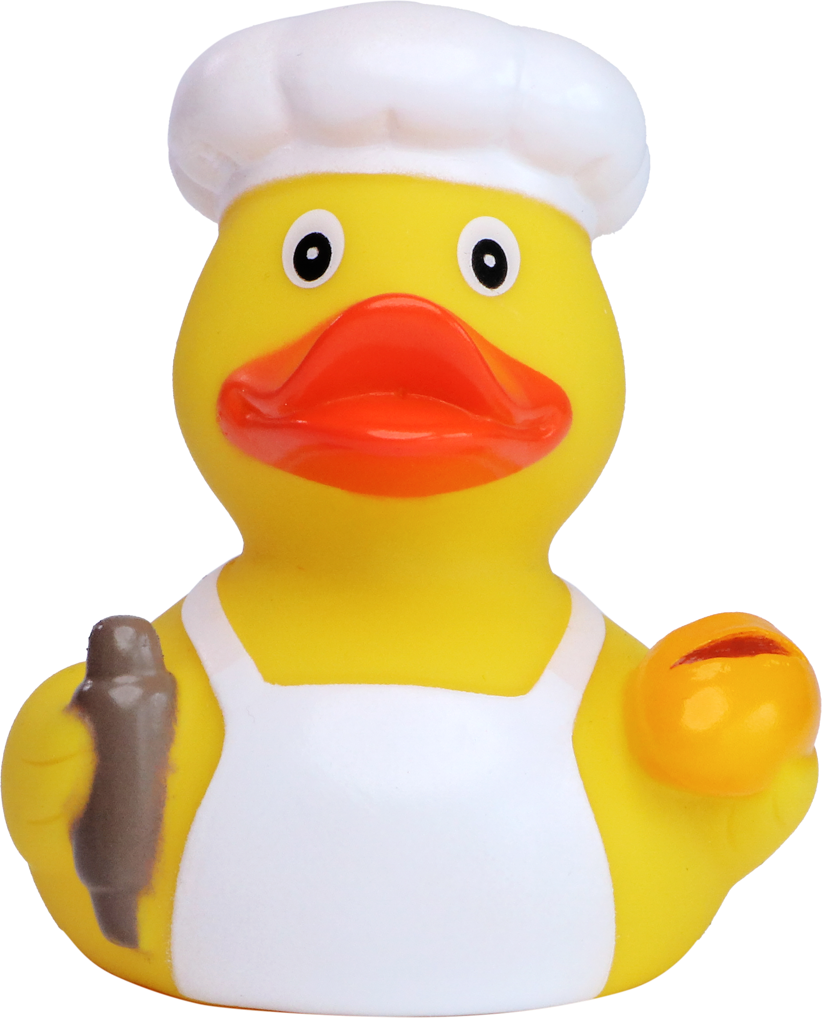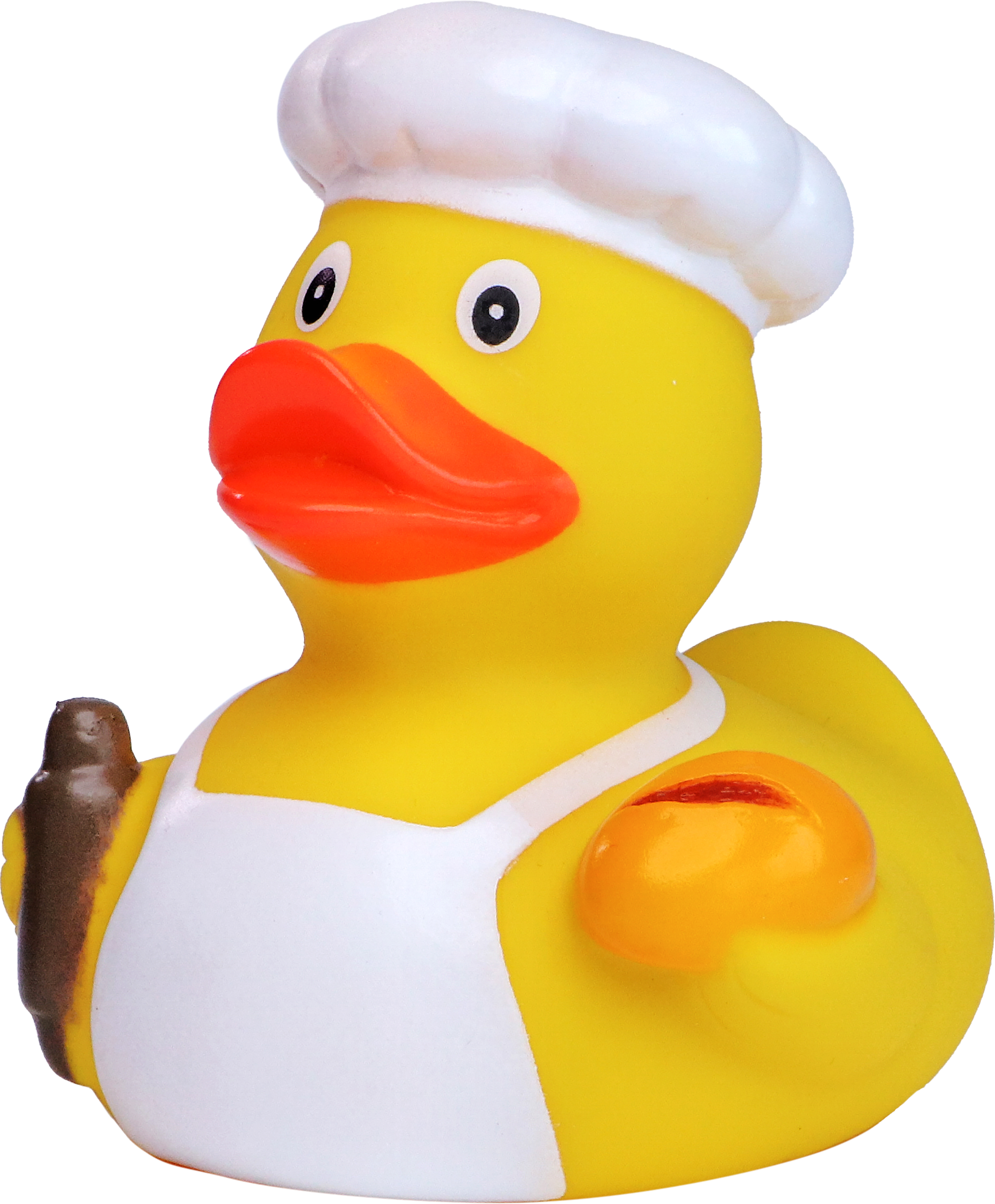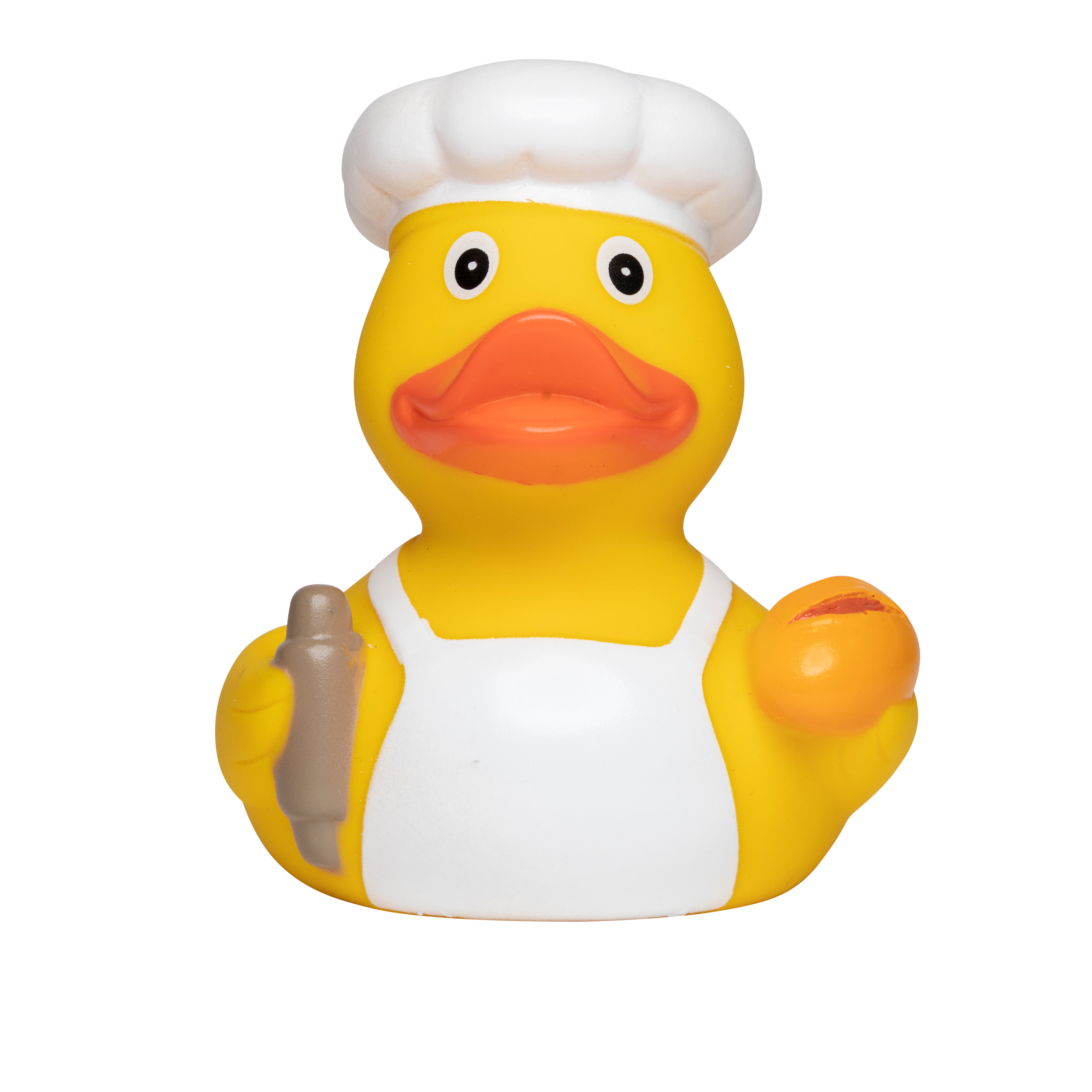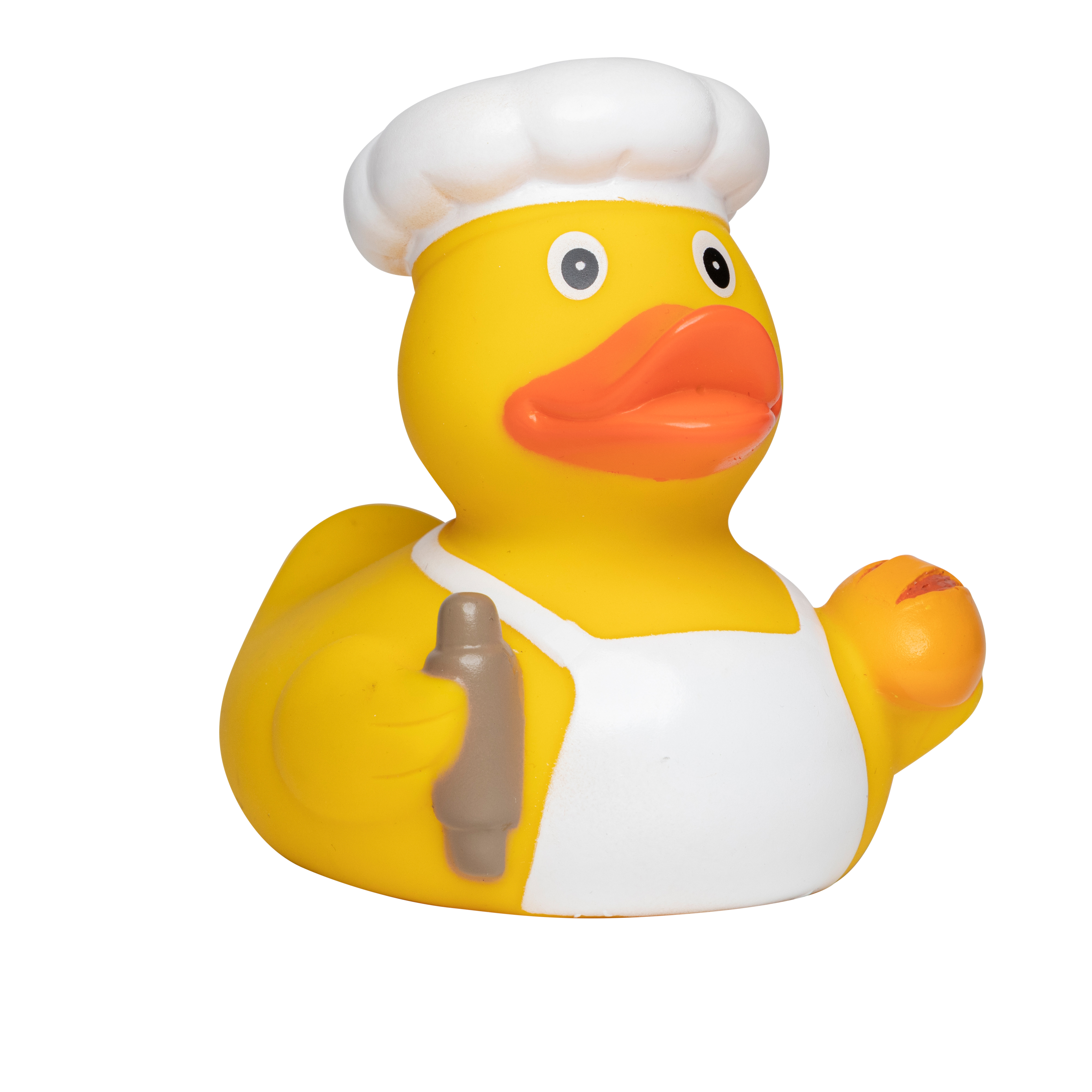 Wenn es nach frischem, herzhaften Brot duftet, ist die Bäcker-Ente nicht weit. Weiße Schürze und weißer Hut sind ihre Arbeitskleidung. Im rechten Flügel hält sie Teigrolle und links präsentiert sie das fertige Brot.