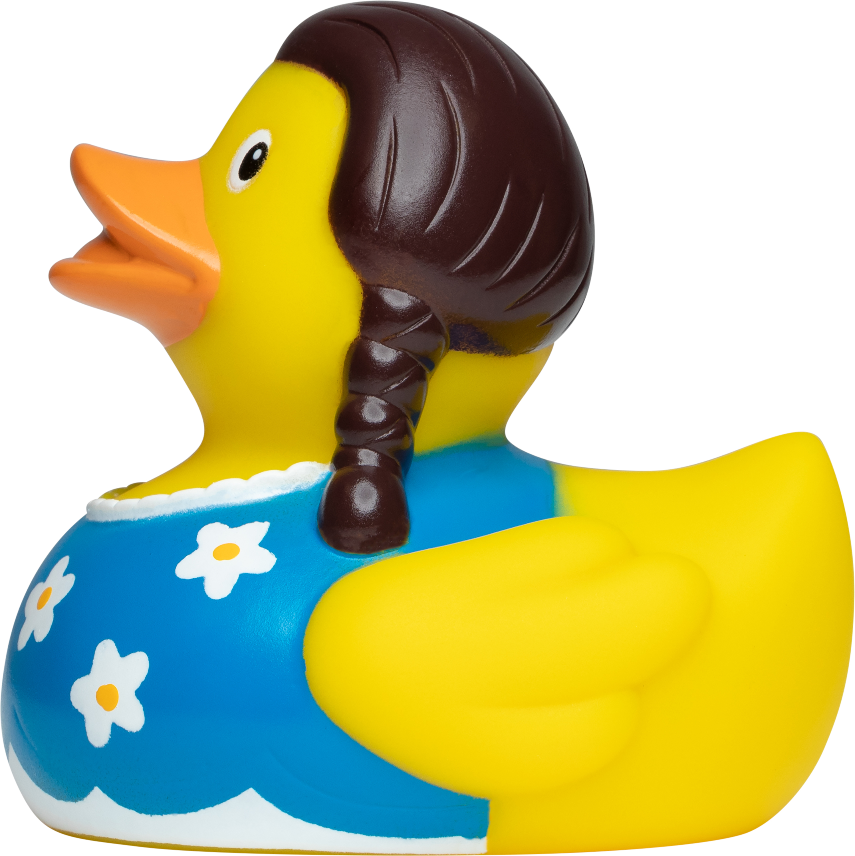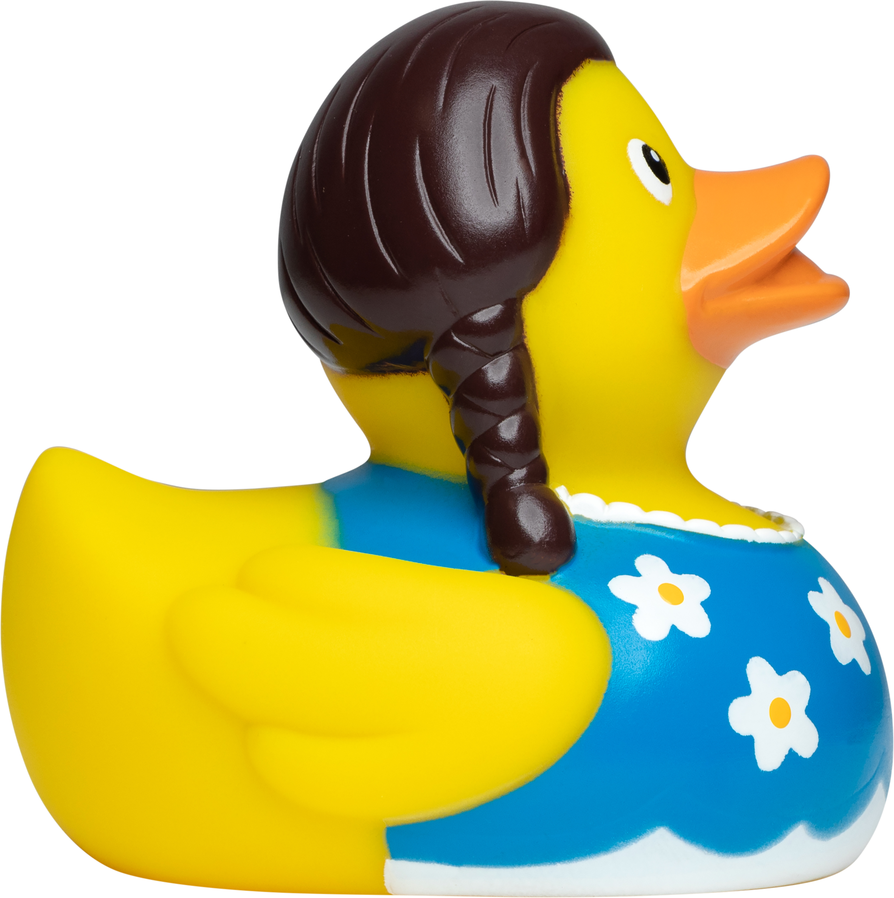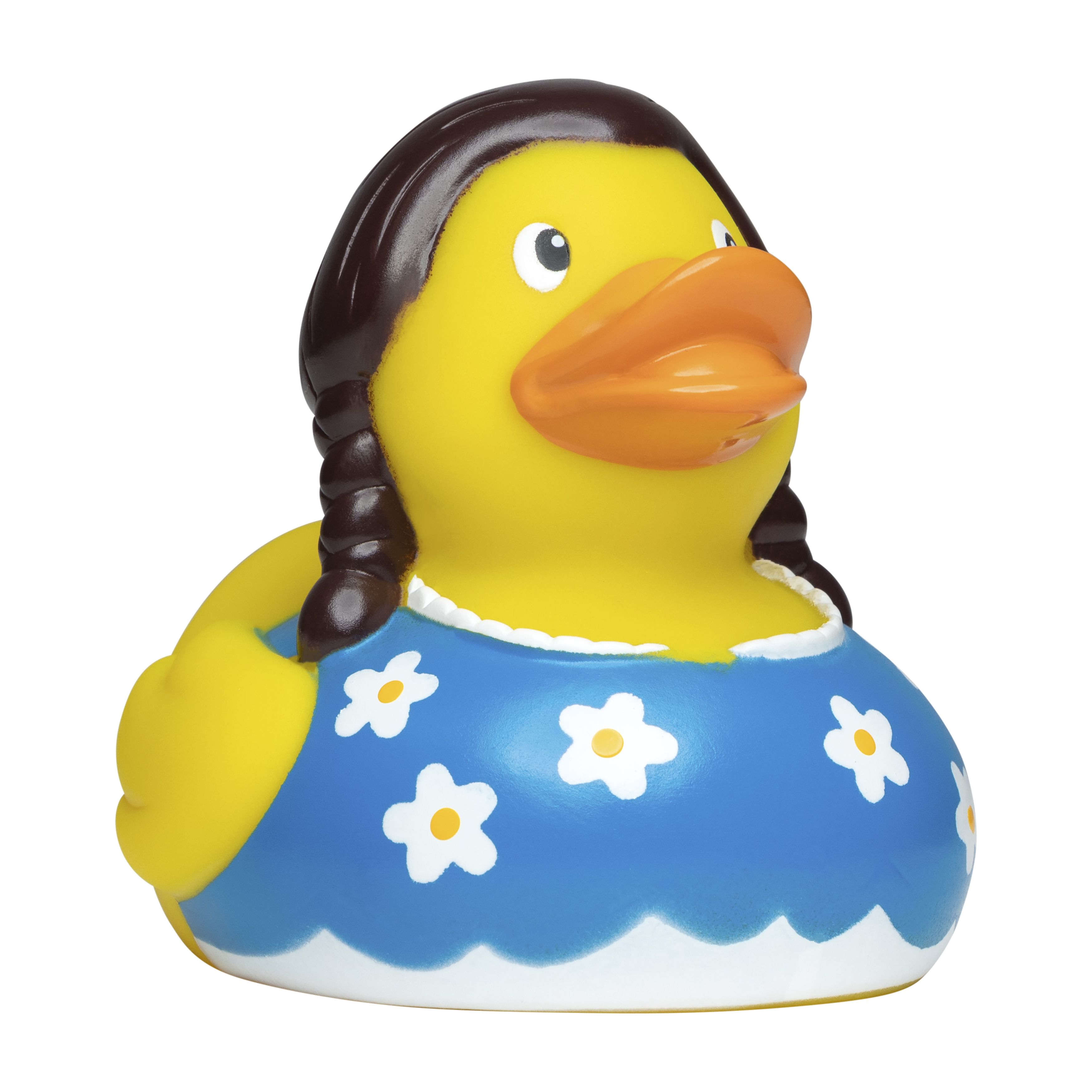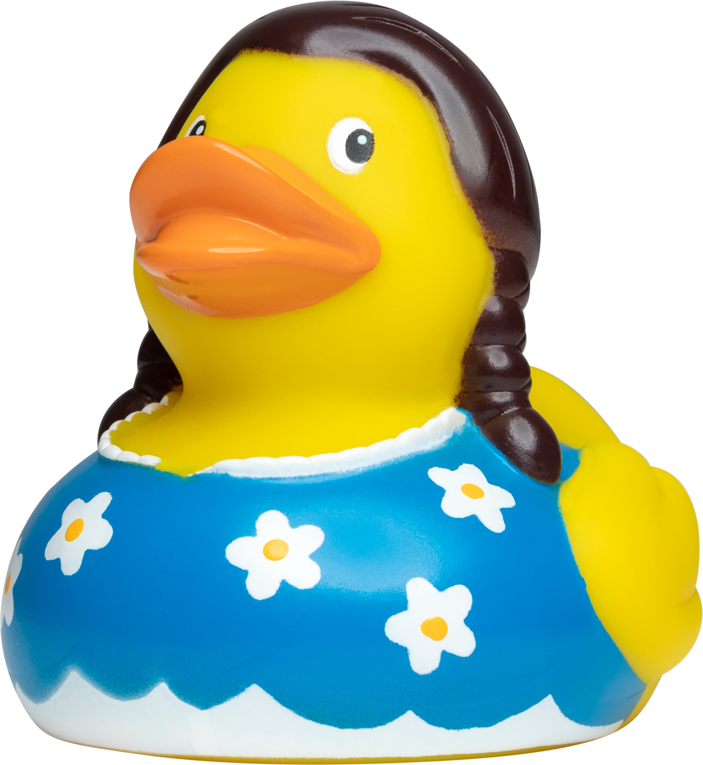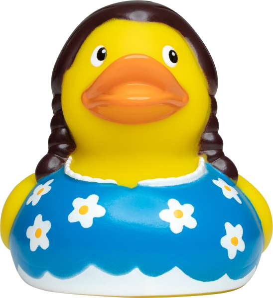 Unsere Bayerin kommt traditionell bayrisch mit Blümchen-Dirndl und braunen, geflochtenen Zöpfen daher. Aber diese Badeente ist nicht nur die Richtige für Bayern Fans, sondern auch für alle anderen ein richtiger Hingucker.