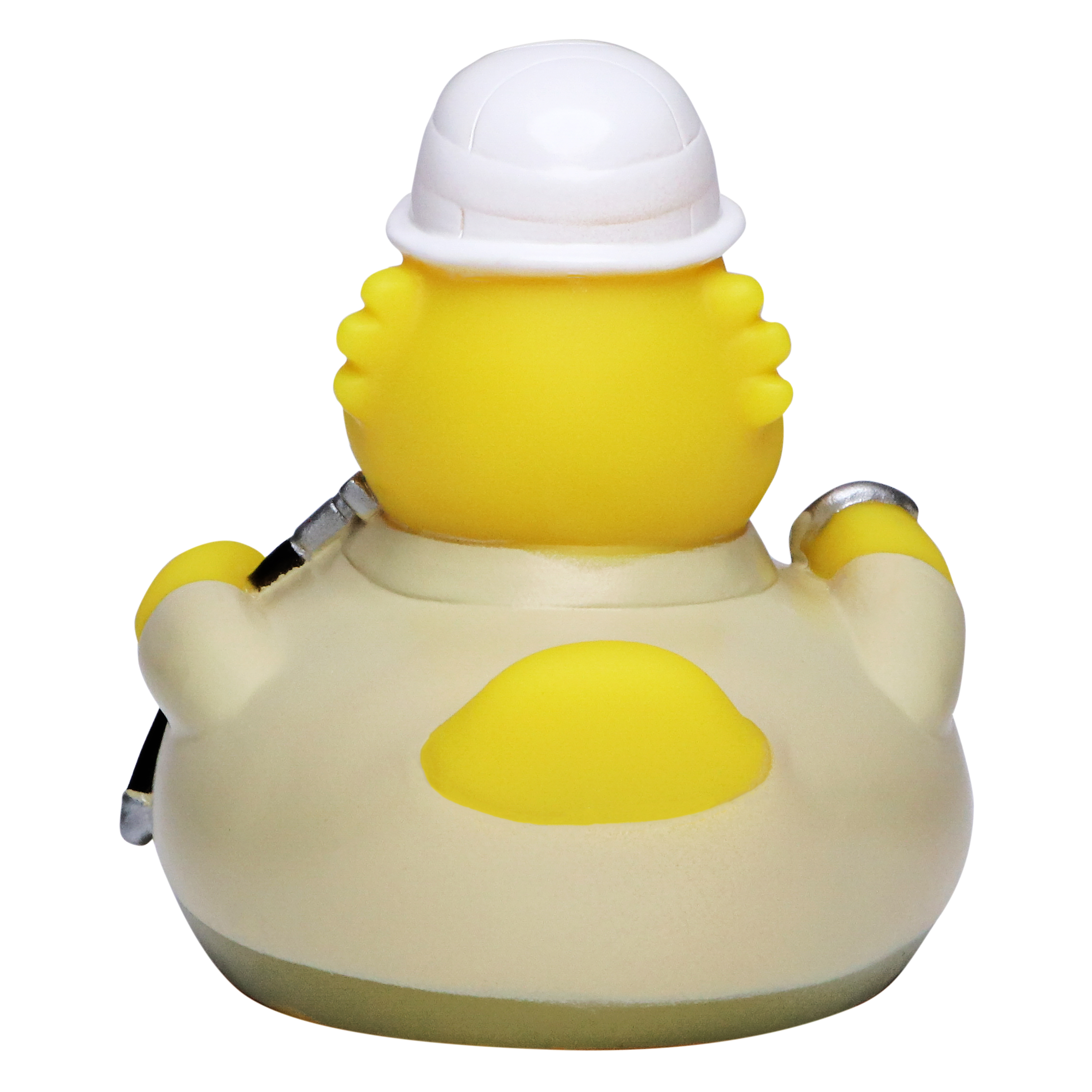 Falls es in Ihrem Badezimmer ein Vorkommen von Bodenschätzen geben sollte, können Sie sicher sein, dass unsere Bergmann Ente dieses ans Tageslicht befördern wird. Unser Kumpel trägt eine typische Steiger-Kluft in braun mit einem strahlenden, weißen Halstuch und einem Schutzhelm. Um in der Dunkelheit gut sehen zu können, bringt der Bergmann eine Lampe mit und damit er gleich mit der Arbeit beginnen kann, hat er natürlich auch seine Spitzhacke dabei.