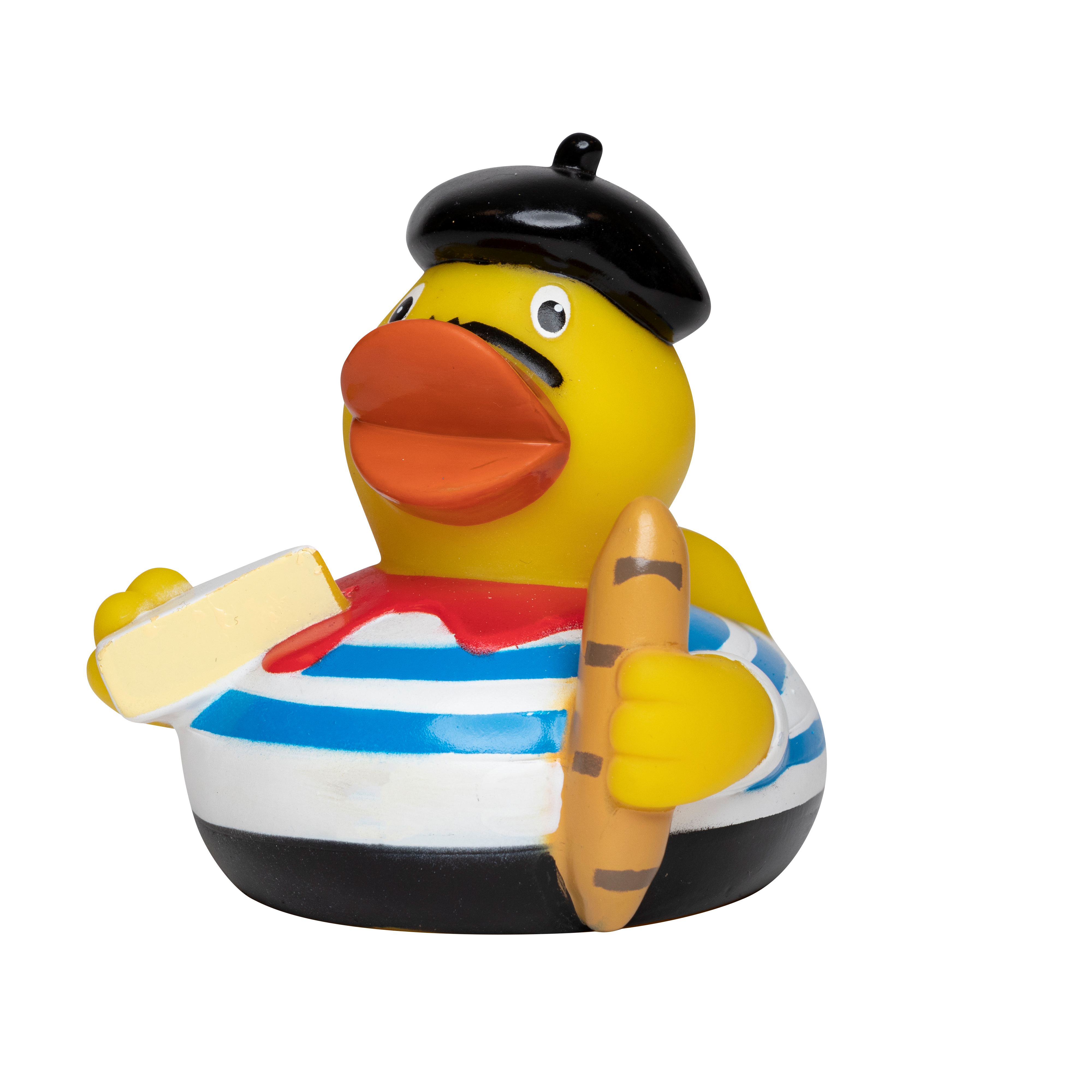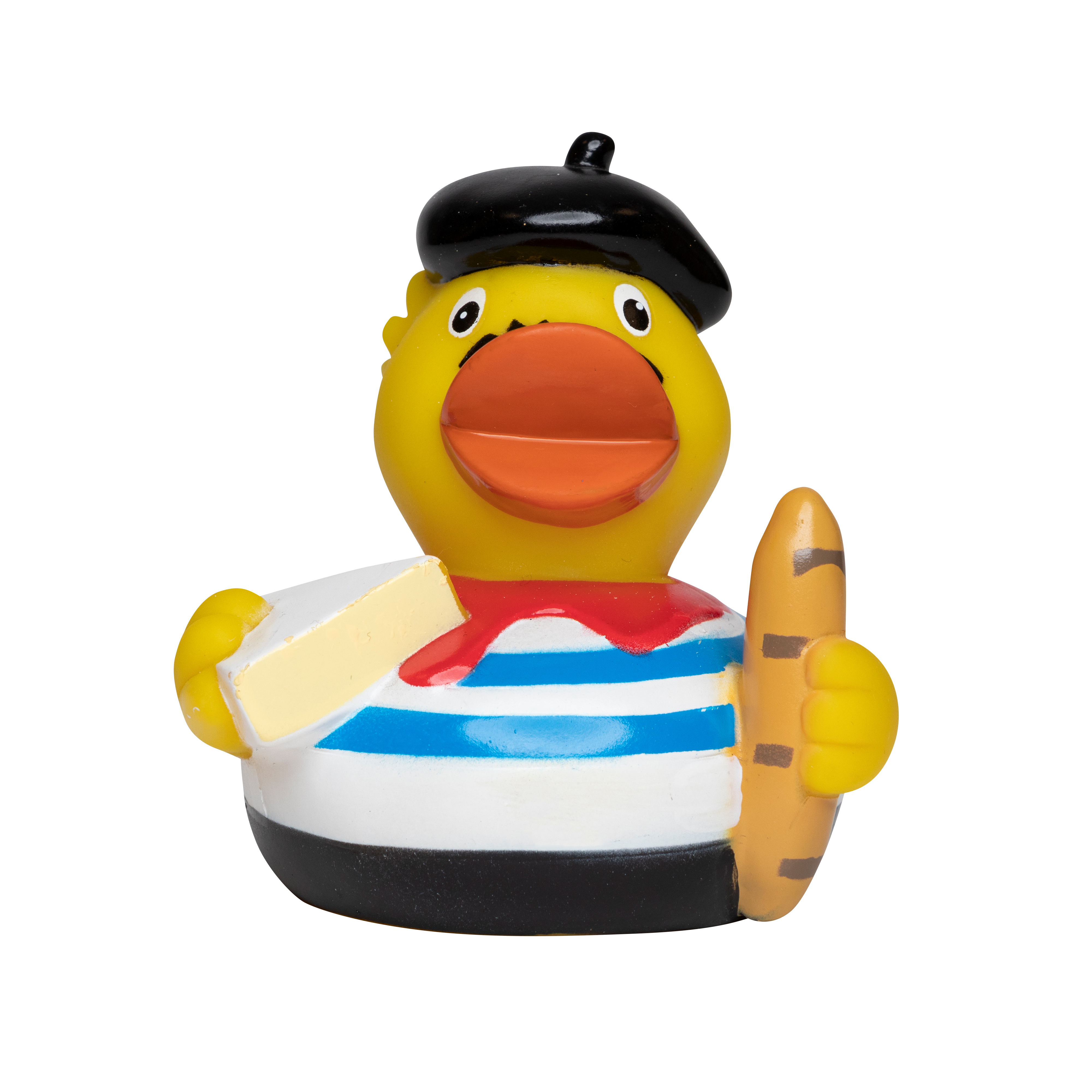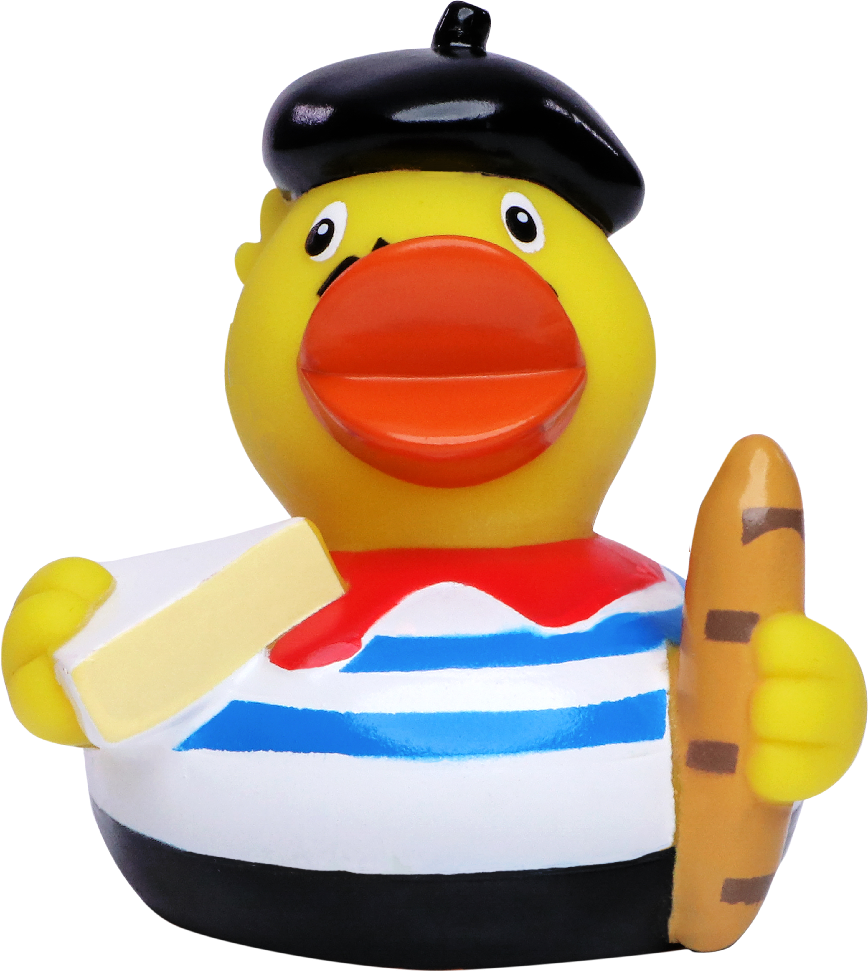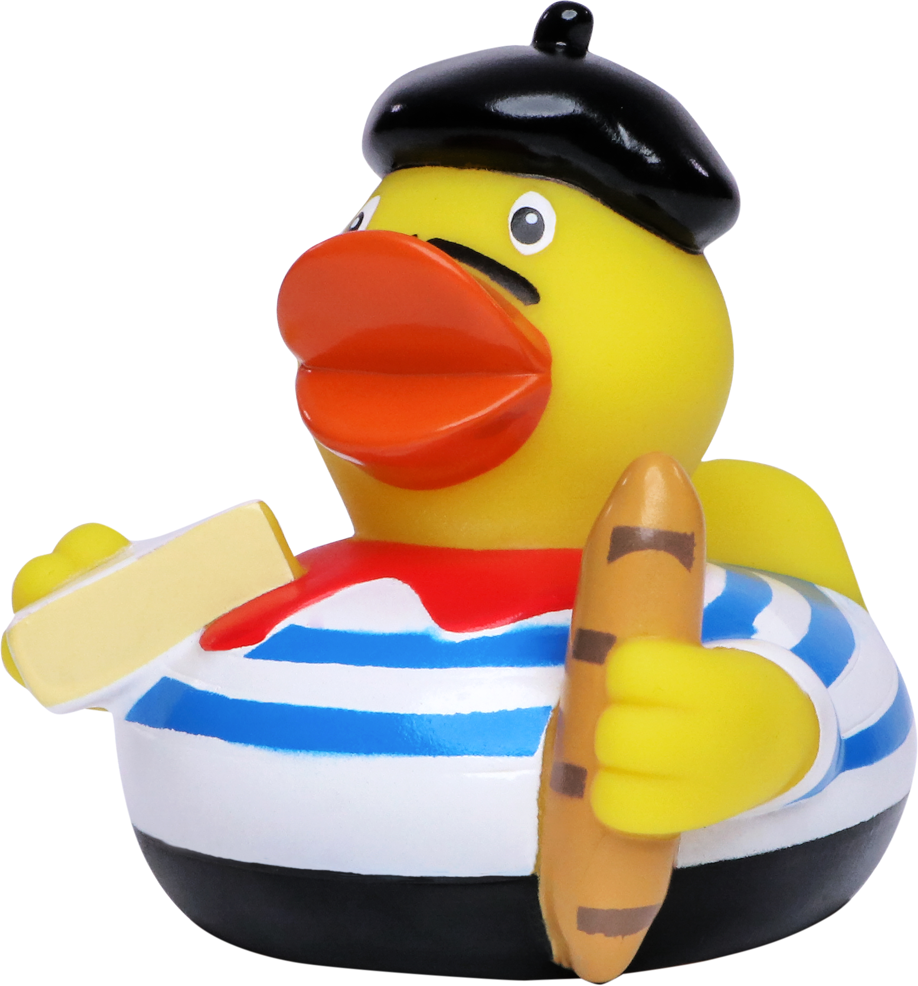 Nous préférons les canard jaune. Wir bevorzugen Enten in gelb! Und am allerliebsten mögen wir sie quietschlebendig! So können wir nur jedem Entenliebhaber empfehlen, die vegetarischen Klassiker der französischen Küche zu kosten: Camembert und Baguette. Denn wer könnte diesen Kulleraugen ans Gefieder wollen? Mit Baskenmütze und lässigem Oberlippen... pardon, Oberschnabelbärtchen genießt die Quietsche-Ente Frankreich bei uns Artenschutz und kann sich beruhigt auf's Savoir-vivre konzentrieren.
